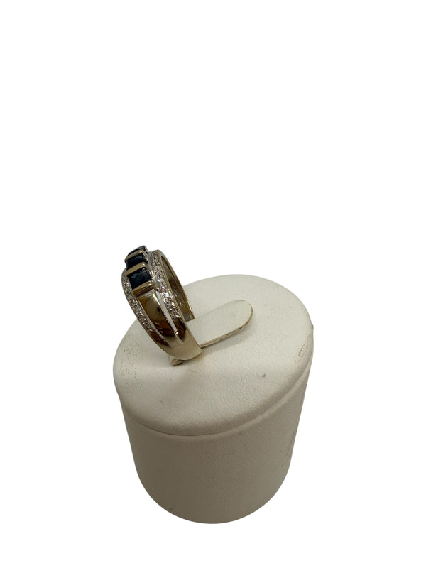 Bague demi-tour empierrée en or blanc 18 carats (750/1000), sans poinçon, d’un poids de 4,18 grammes et de taille 56. Elle est sertie de trois topazes bleues de 0,20 carat chacune, accompagnées de trente pierres incolores naturelles de 0,01 carat, disposées avec finesse sur le demi-anneau. Le bijou est en très bon état général.