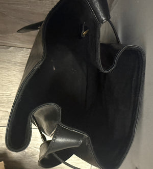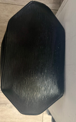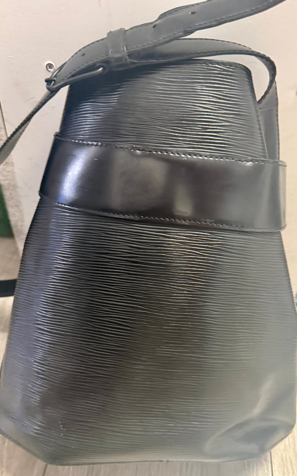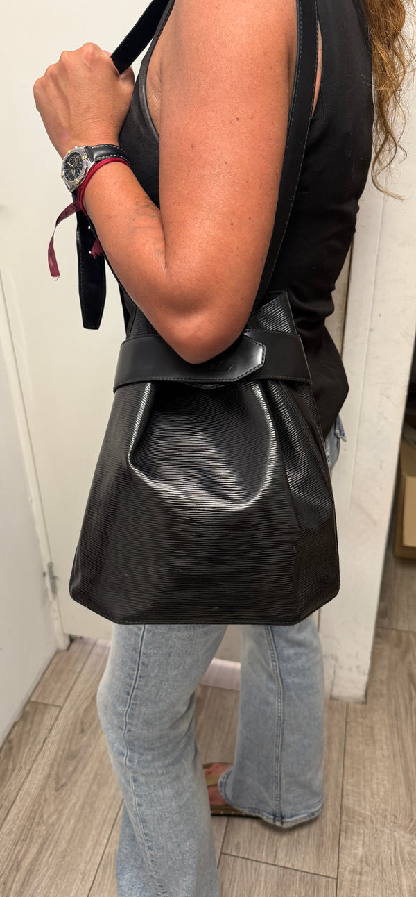 Sac à main Louis Vuitton de forme seau, modèle Twist Bucket Vintage, en cuir Épi noir. Il mesure 28 cm de hauteur, 26 cm de largeur et présente une profondeur de 28 cm avec une épaisseur de 3 mm. Le sac est en bon état général.