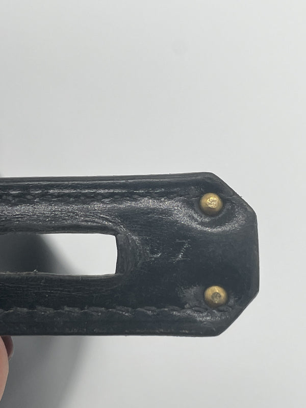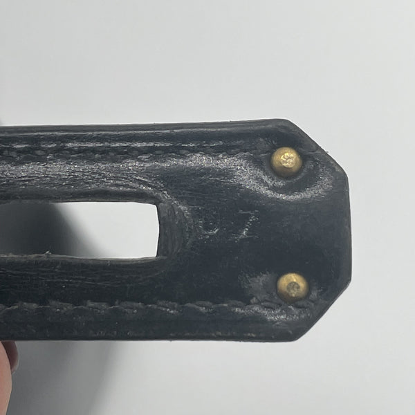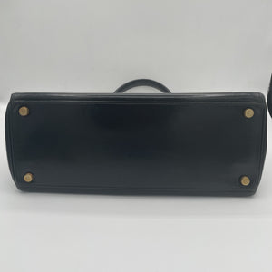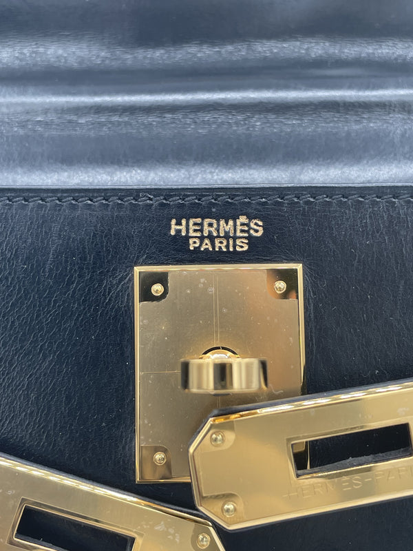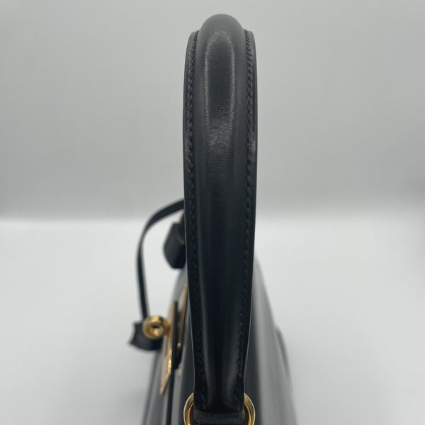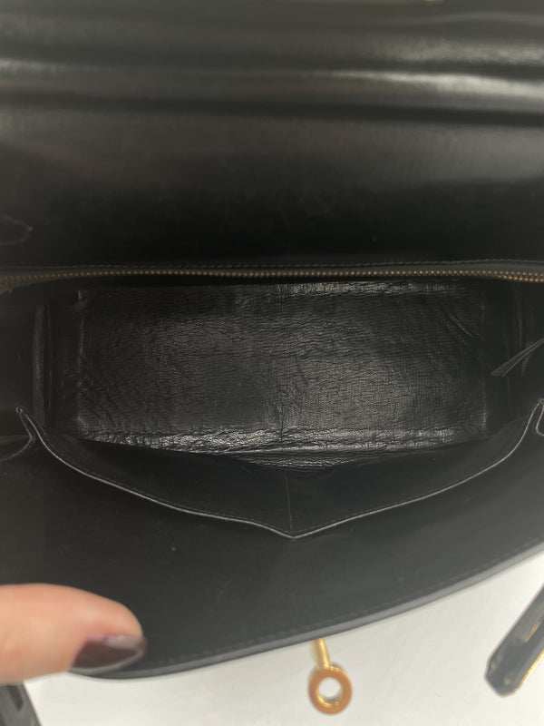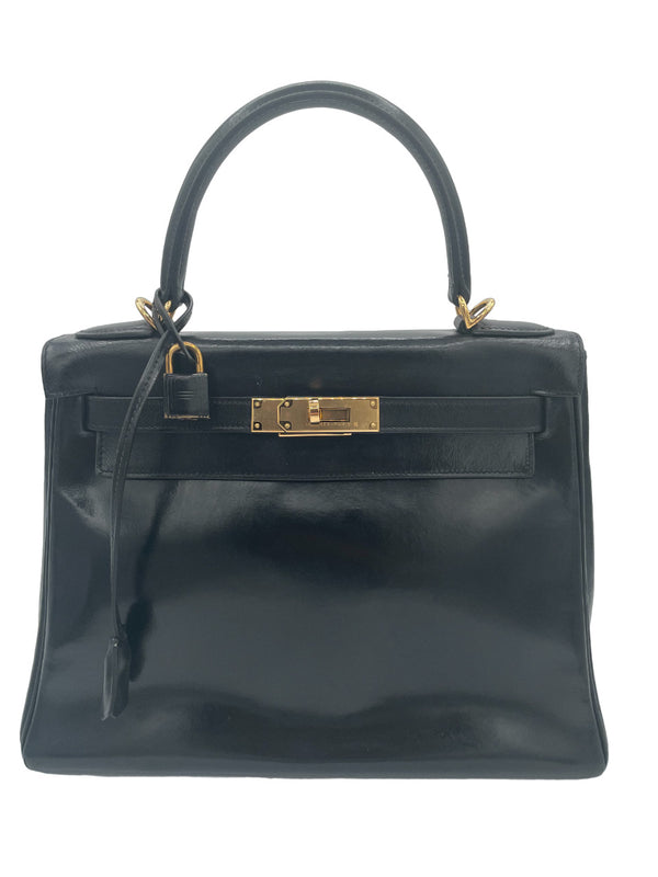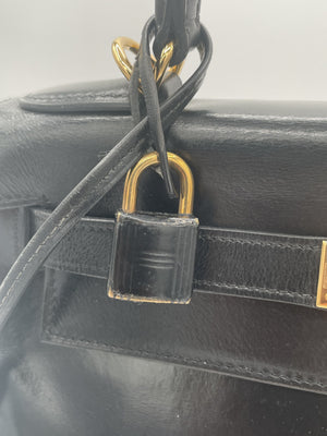 Superbe Sac Kelly 28 de la maison Hermès, datant de 1960, cuir Box Noir. Toutes les bijouteries ont été refaites à neuf en plaqué or 24 carats ainsi que la poignée chez Hermès. Des doubles anneaux ont été installées si vous souhaitez y incorporer une bandoulière.