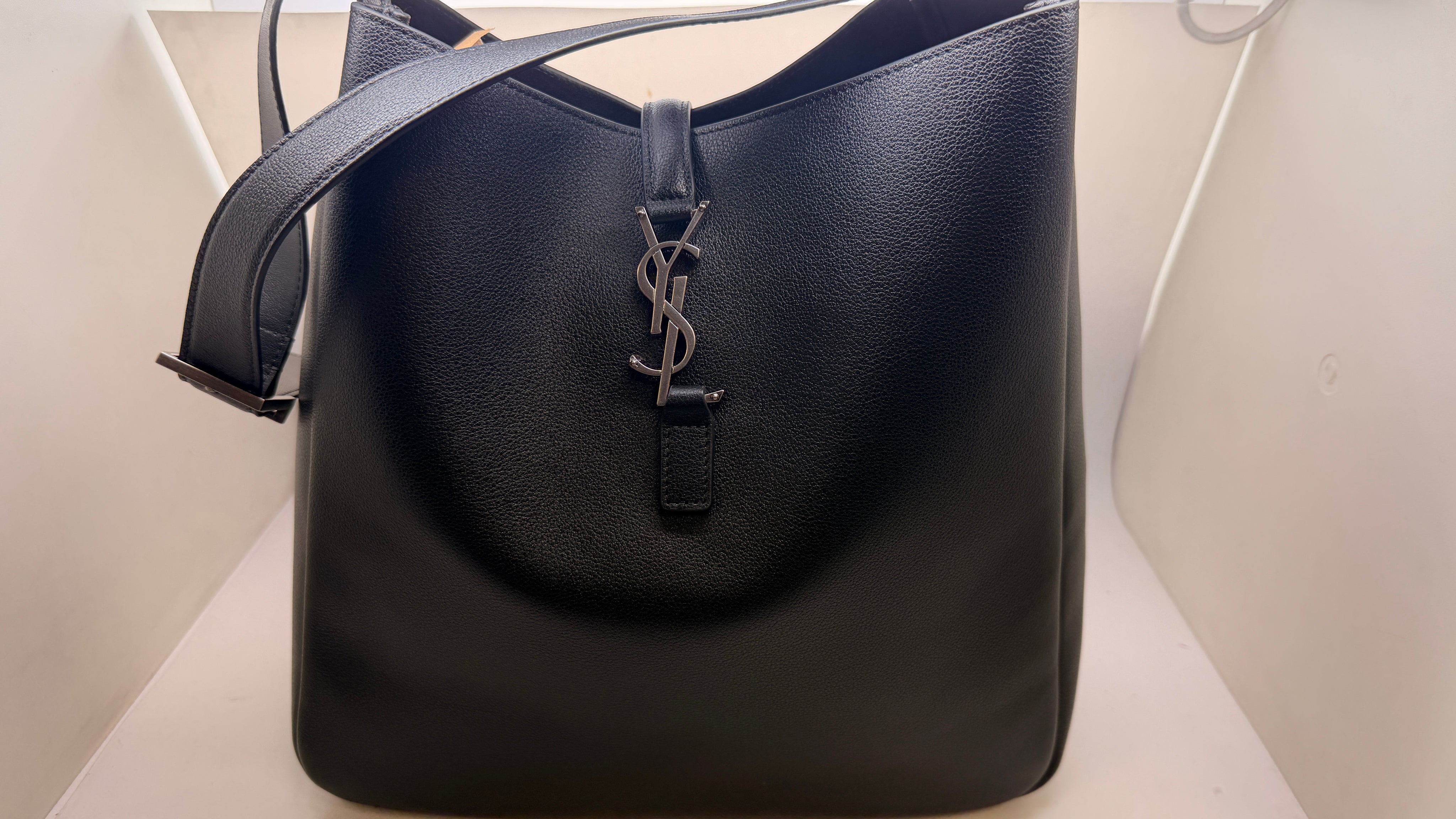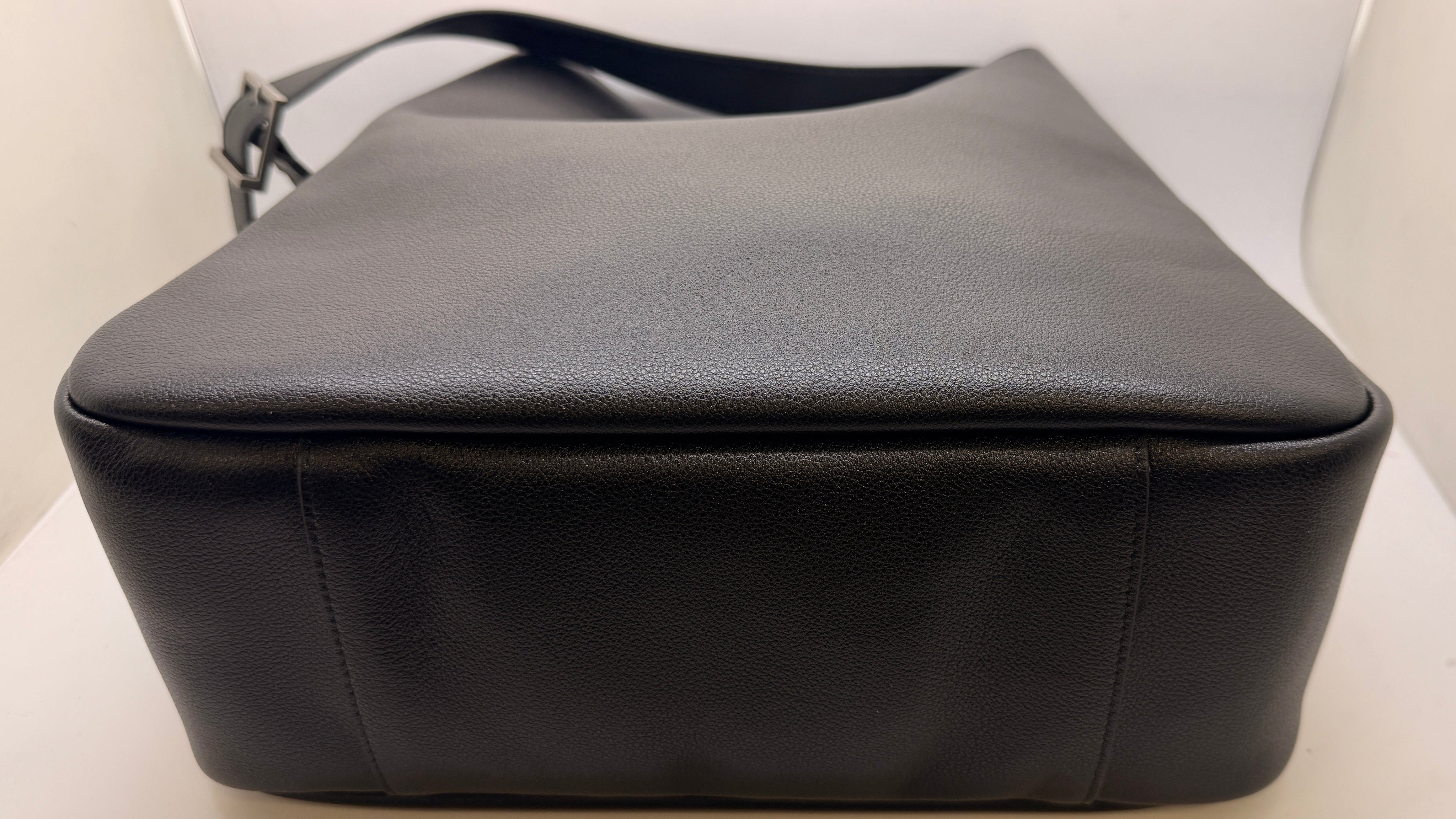 Sac à main Yves Saint Laurent modèle 5 à 7, forme hobo en cuir noir. Dimensions : 30 × 30 × 12 cm.