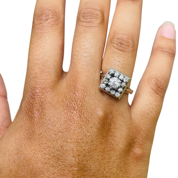 Bague en or blanc 18 carats, sertie d’un diamant central de 0,40 carat entouré de 12 diamants de 0,03 carat chacun.
