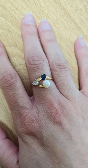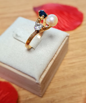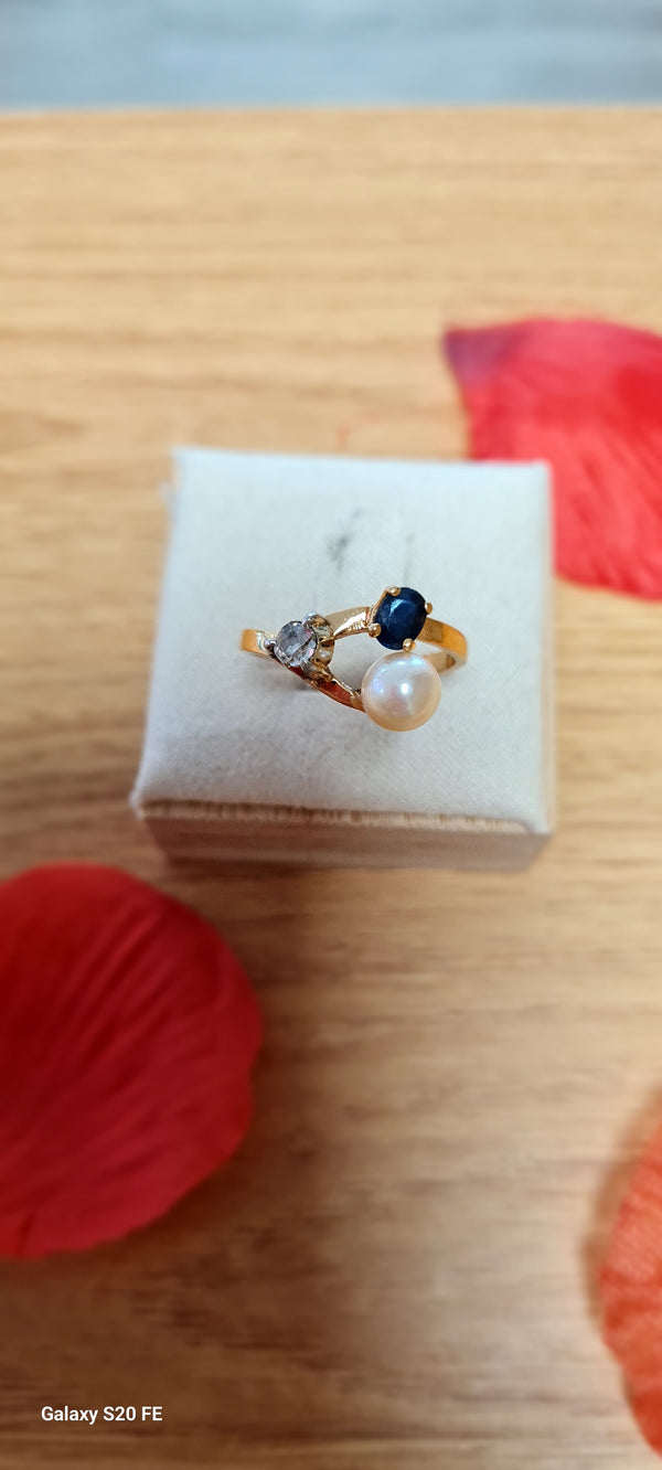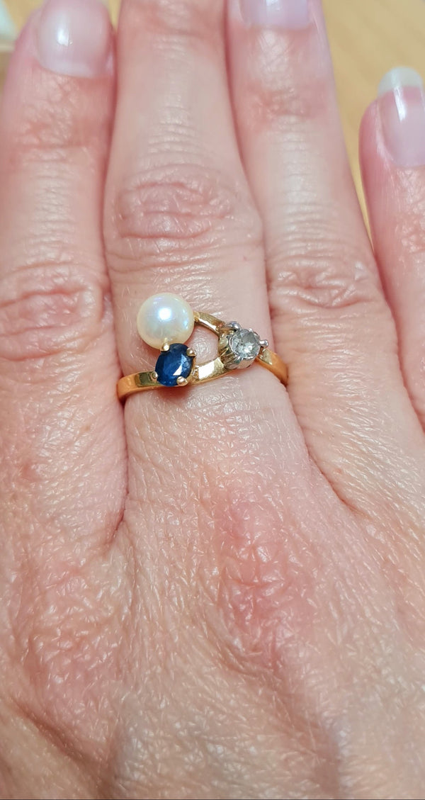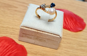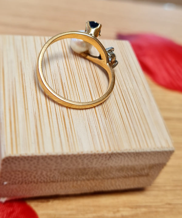 Très jolie bague en or 18k avec sa perle véritable, son saphir et diamant