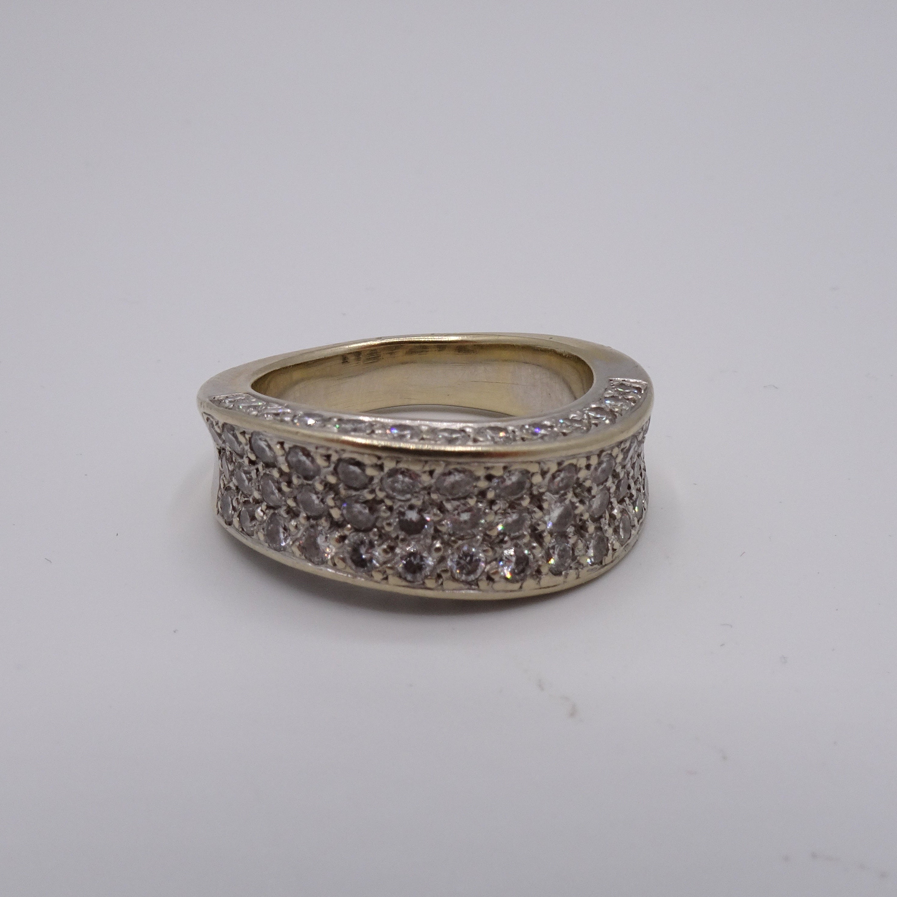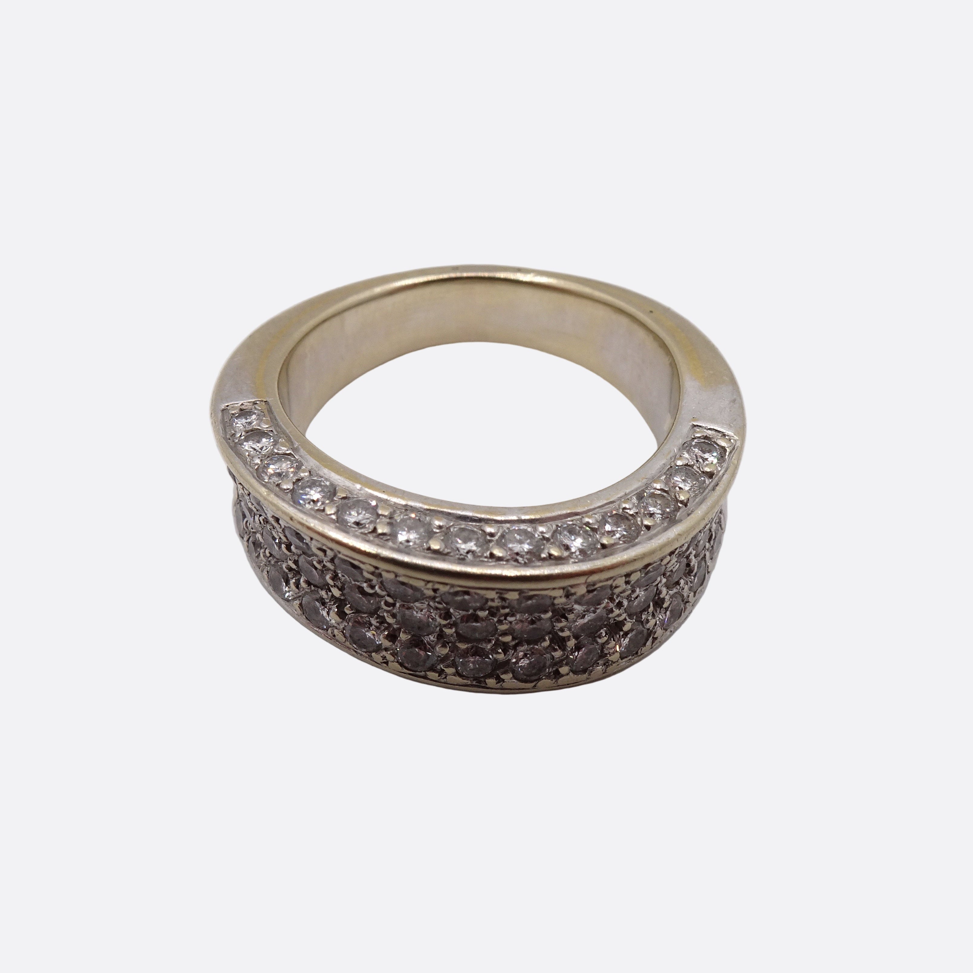 Bague en or blanc 750/1000 (poinçon Tête d’Aigle), élégante et lumineuse, d’un poids de 9,90 g. En taille 53, elle est entièrement pavée de 66 diamants taille brillant (0,005 ct), offrant un éclat homogène et raffiné.