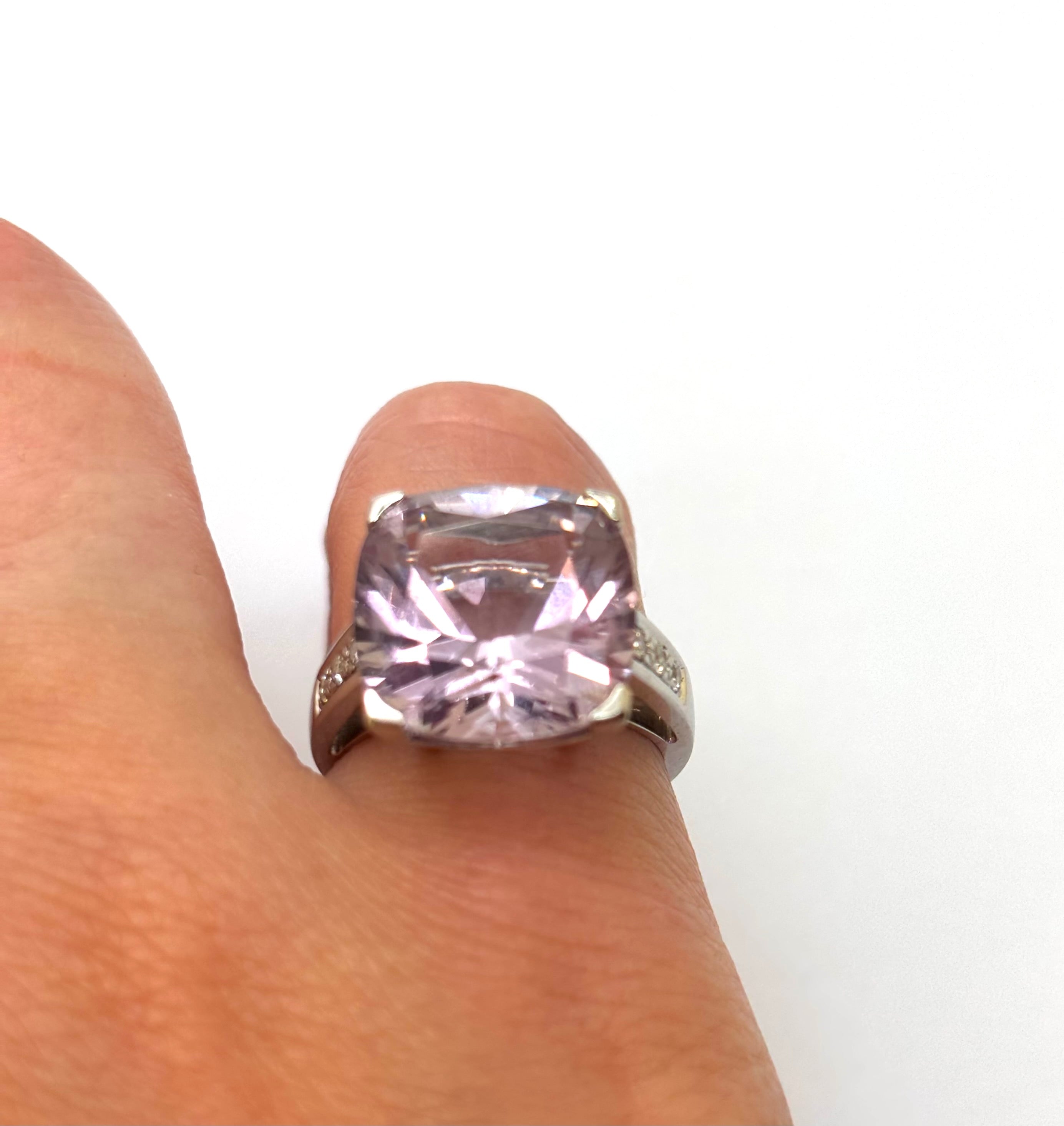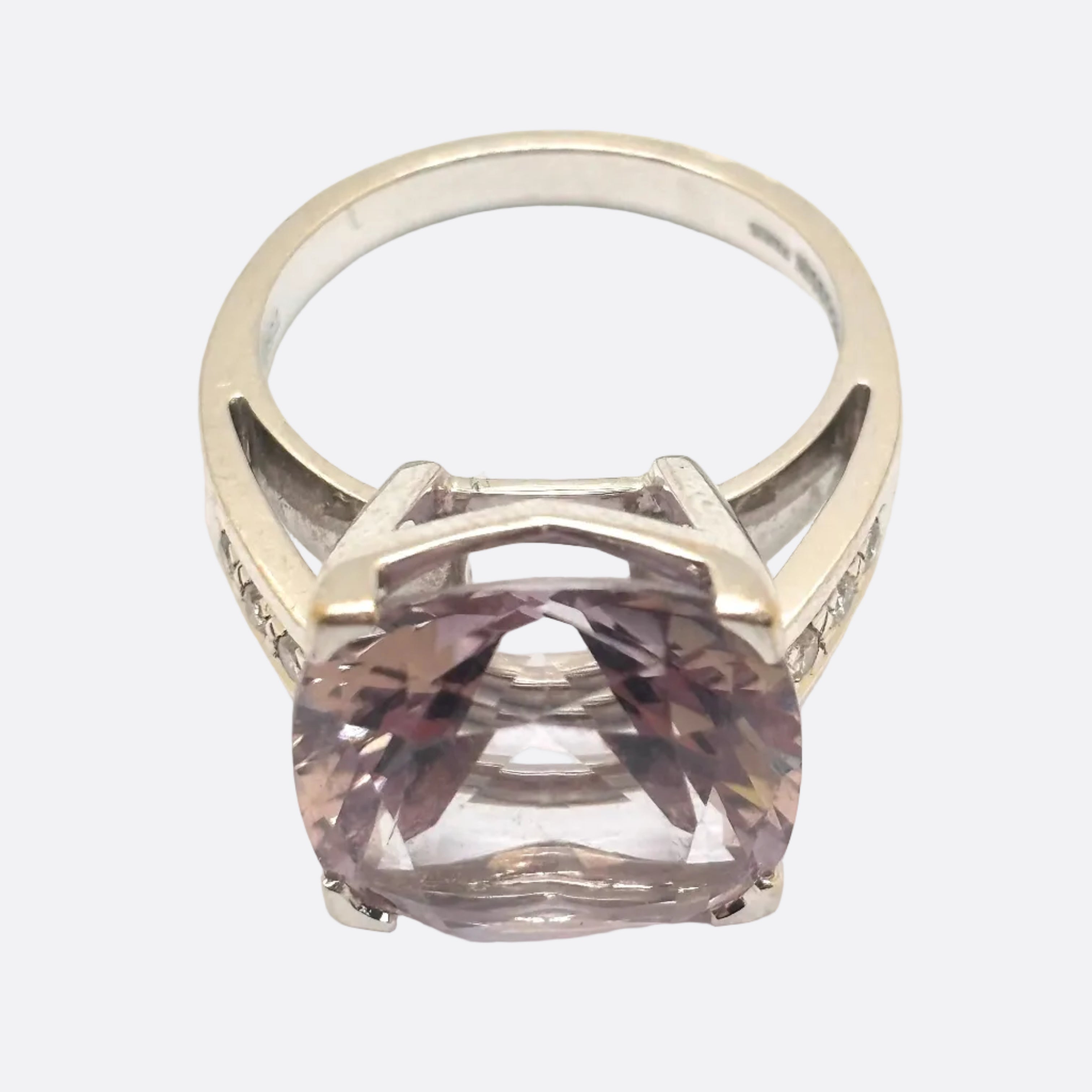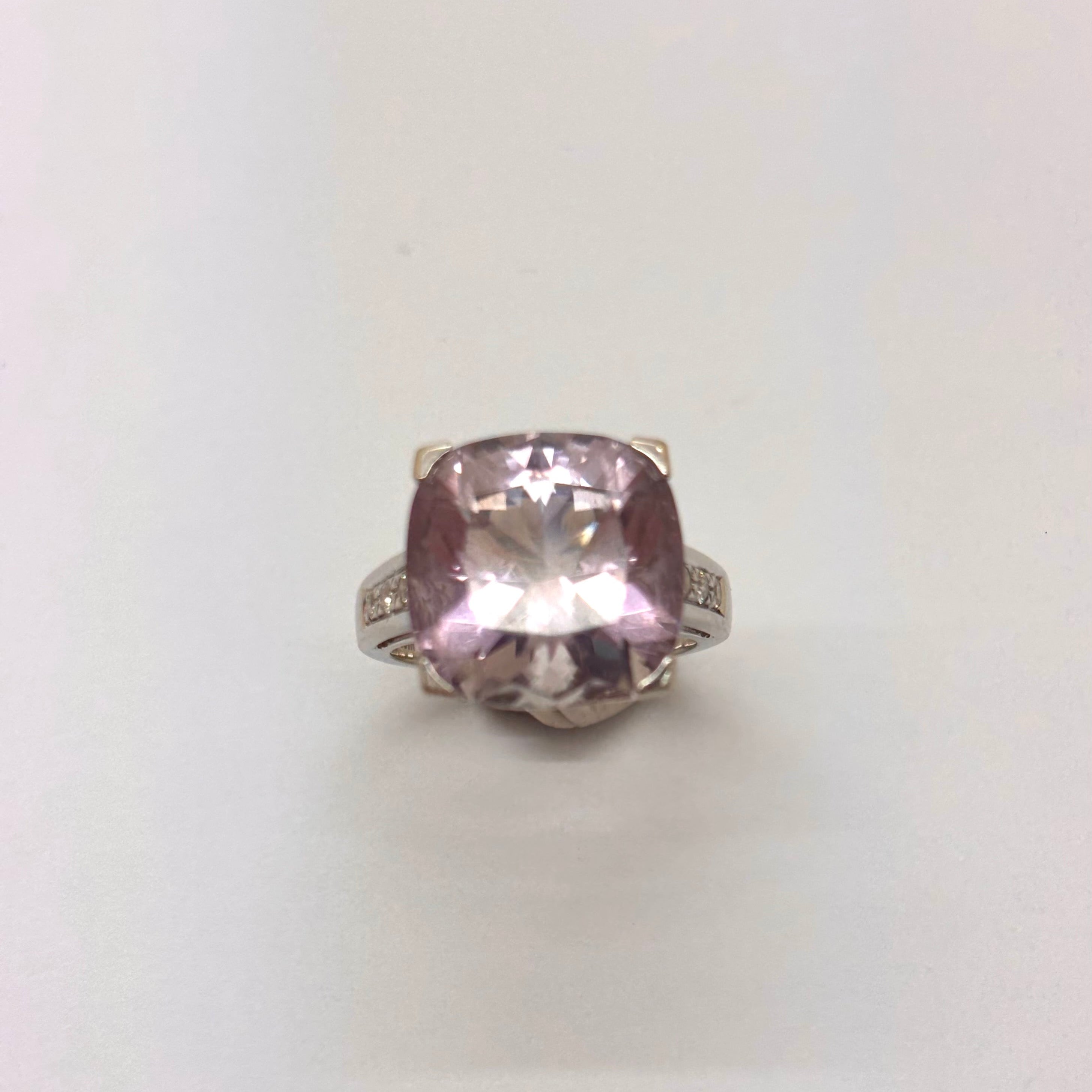 Bague solitaire en or blanc 750/1000, poids 6,80 g, taille 50. Elle présente une améthyste rose mise en valeur par six petits diamants. En très bon état, cette bague signée offre une élégance sobre et lumineuse, idéale pour un cadeau ou un bijou du quotidien.
