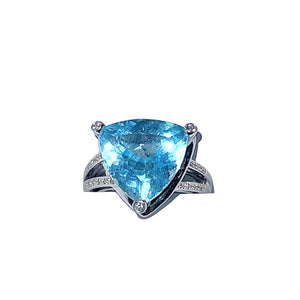 Pierres : Topaze bleue 7,70 carats, 8 diamants (0.006 carats env) en pavage de chaque côté, trois diamants (0.006 carats env) sur les griffes pour tenir la pierre le pavage de diamant contiennent 19 diamants (0.11 carats env)