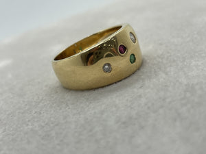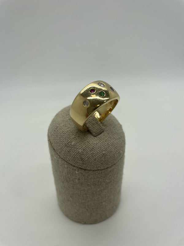 Émerveillez-vous devant cette bague exquise, ornée de délicats éclats de diamant, saphir, rubis et émeraude. Chaque pierre précieuse, minutieusement sélectionnée et sertie, crée une symphonie de couleurs et d'éclats qui captivent le regard. Les diamants étincelants ajoutent une touche de pureté et de lumière, tandis que les saphirs bleus, les rubis rouges et les émeraudes vertes apportent une richesse et une profondeur incomparables. Ce bijou raffiné incarne l'élégance et la diversité de la beauté naturelle, faisant de lui une pièce exceptionnelle pour sublimer toute tenue avec une sophistication intemporelle.