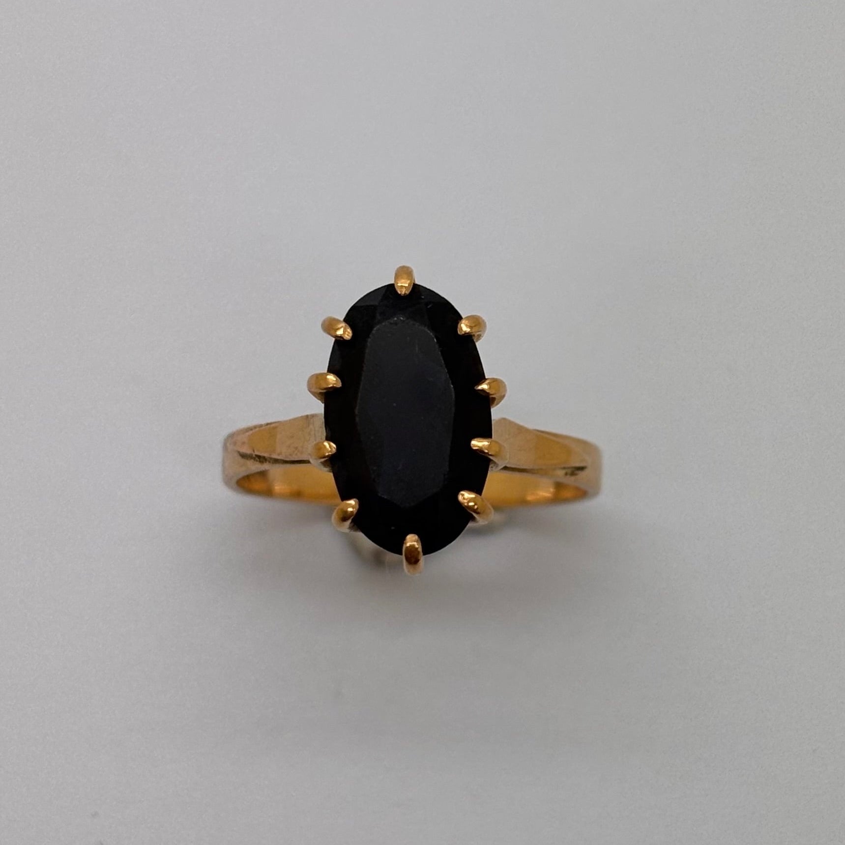 Bague empierrée en or jaune 18 carats (poinçon Tête d’Aigle), poids 3,19 g, sertie d’une agathe noire unique. Taille 51, en bon état.