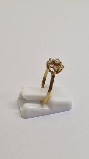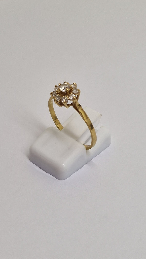 Bague empierrée en or jaune 18 carats (750/1000), poinçonnée tête d’aigle, en très bon état. Elle est sertie d’un oxyde de zirconium, avec une taille 54 et un poids de 1,75 gramme.