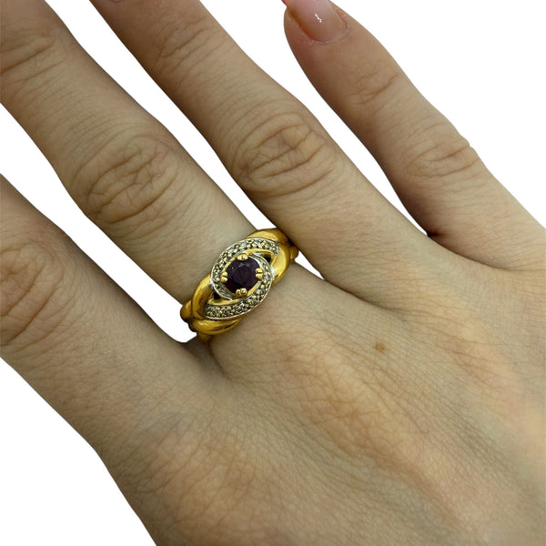 Bague empierrée est réalisée en or jaune 18 carats (titrage 750/1000), sans poinçon. D’un poids de 3,95 grammes et de taille 52, elle est ornée d’un rubis central de 0,20 carat accompagné de 12 éclats de diamant de 0,01 carat chacun. Elle se trouve en très bon état.