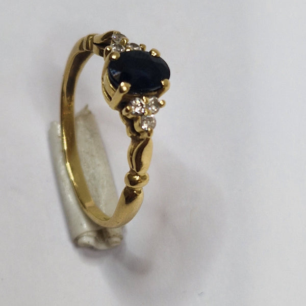 Bague empierrée en or jaune 18 carats (750/1000), poinçonnée tête d’aigle. Poids : 1,92 g. Taille : 50. Sertie de 6 diamants et d’un saphir. État : bon.