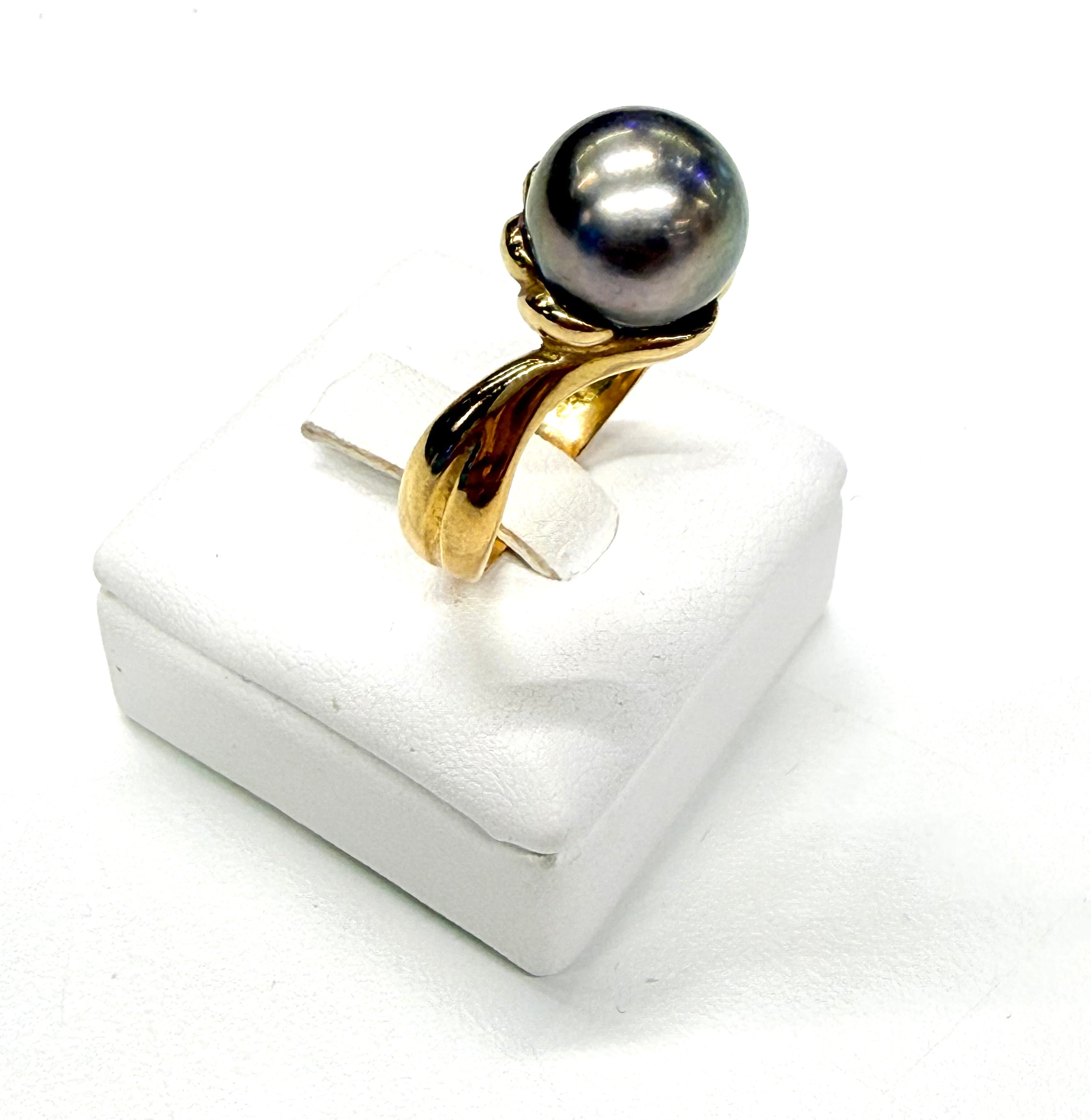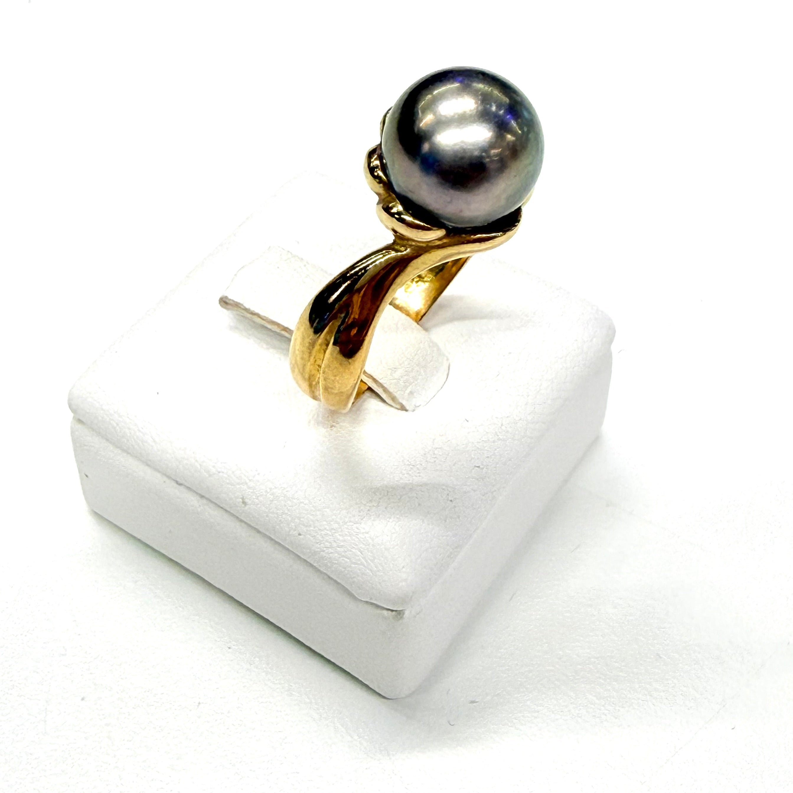 Bague en or jaune 18 carats (750/1000), ornée d’une perle de Tahiti unique de 0,8 cm de diamètre. Poids : 6,44 g, état : très bon. Un bijou sobre et élégant, qui met en valeur la beauté naturelle de la perle.
