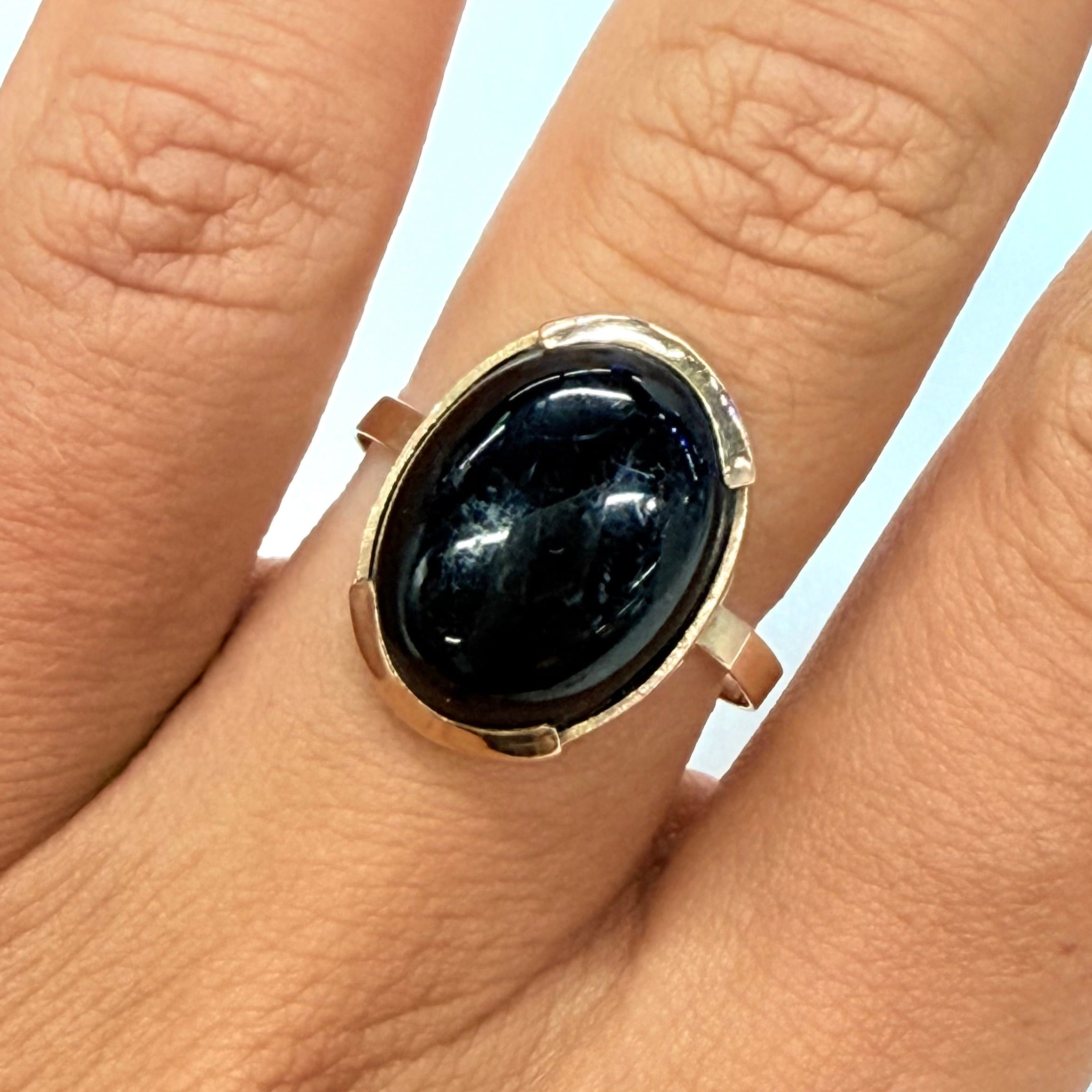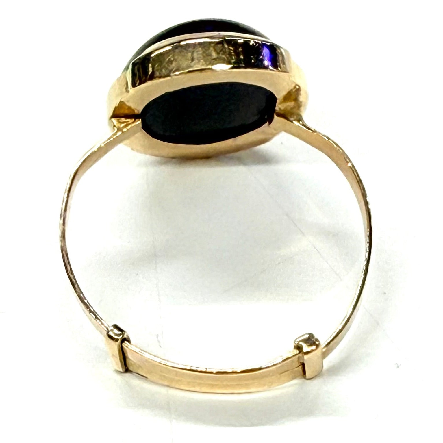 Bague empierrée en or jaune 750/1000 (18 carats), sans poinçon, affichant un poids de 3,52 g. Sa taille est réglable, allant du 58 jusqu’au 70, et elle est ornée d’un onyx unique mesurant 1,5 cm sur 1,2 cm.
