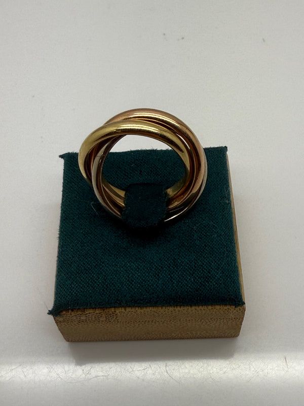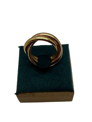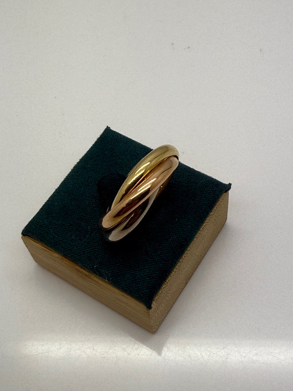 Alliance en or 18 carats (750/1000), composée de trois ors : jaune, rose et blanc. Un design intemporel et élégant, sans pierres. Elle est en taille 52 et pèse 14,33 grammes. Poinçonnée 750 et en très bon état, cette bague convient aussi bien pour une occasion spéciale que pour un port quotidien.