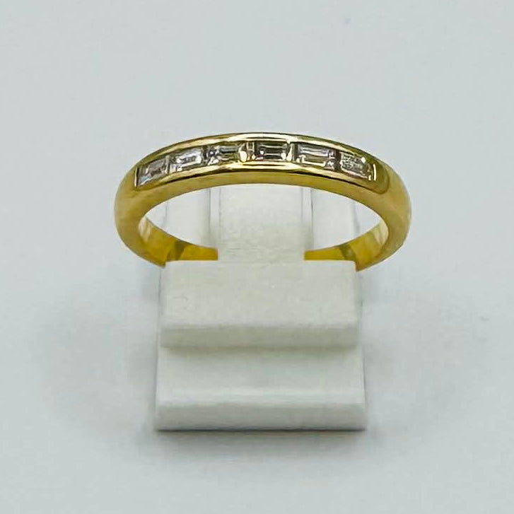 Alliance demi-tour MATY en or jaune 750/1000 (18 carats), poinçon 750, d’un poids de 4,02 g en taille 57. Sertie de 6 diamants baguettes de 3 mm, elle offre une brillance élégante et raffinée. En très bon état, c’est un bijou lumineux et intemporel.