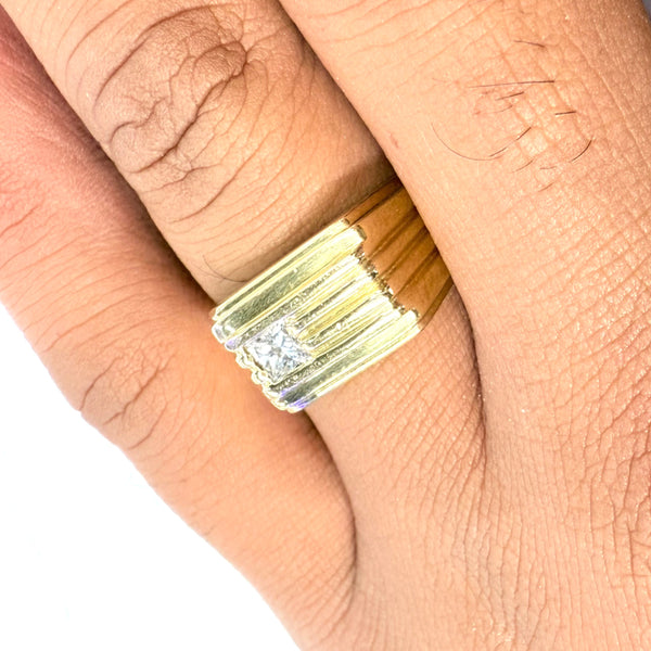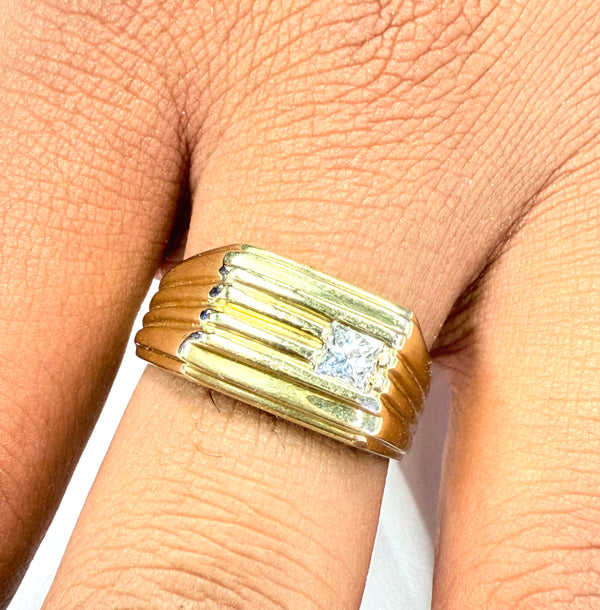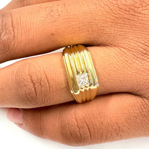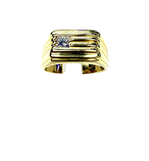 Superbe bague chevalière en très bon état en or jaune 18 carats (750/1000), poinçonnée 750, affichant un poids conséquent de 11,85 grammes. De taille 65, elle est sertie d’un diamant carré de 0,10 carat en son centre, apportant une touche d’élégance discrète.