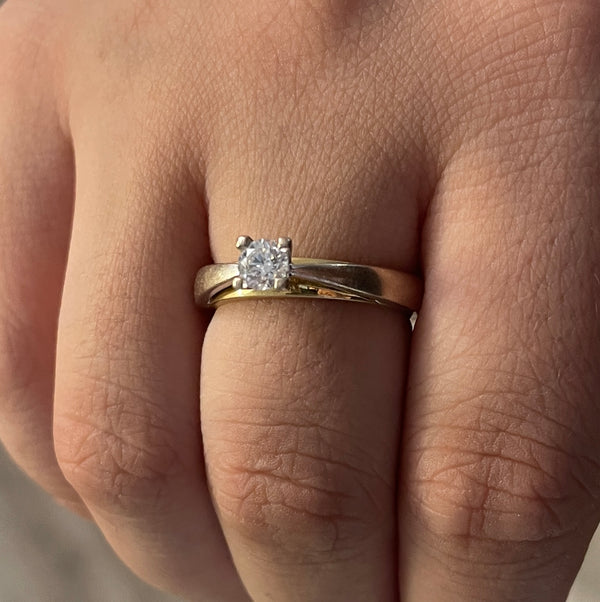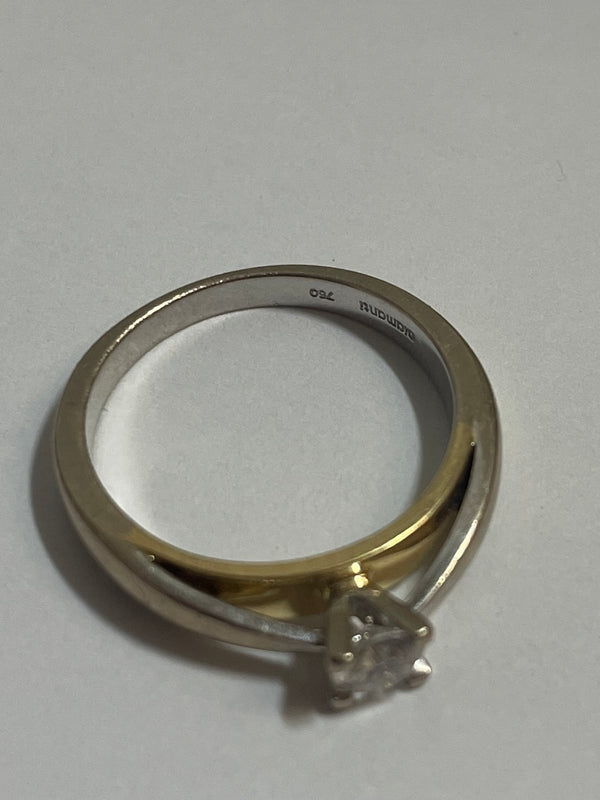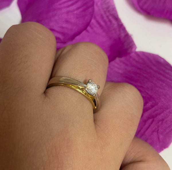 Bague de type solitaire en or jaune et or blanc 750/1000 (18 carats), poinçonnée 750 et Tête d’Aigle. D’un poids de 3,99 g et de taille 52, elle est sertie d’un diamant unique de 0,35 carat. Une pièce raffinée en bon état, idéale pour une occasion spéciale.