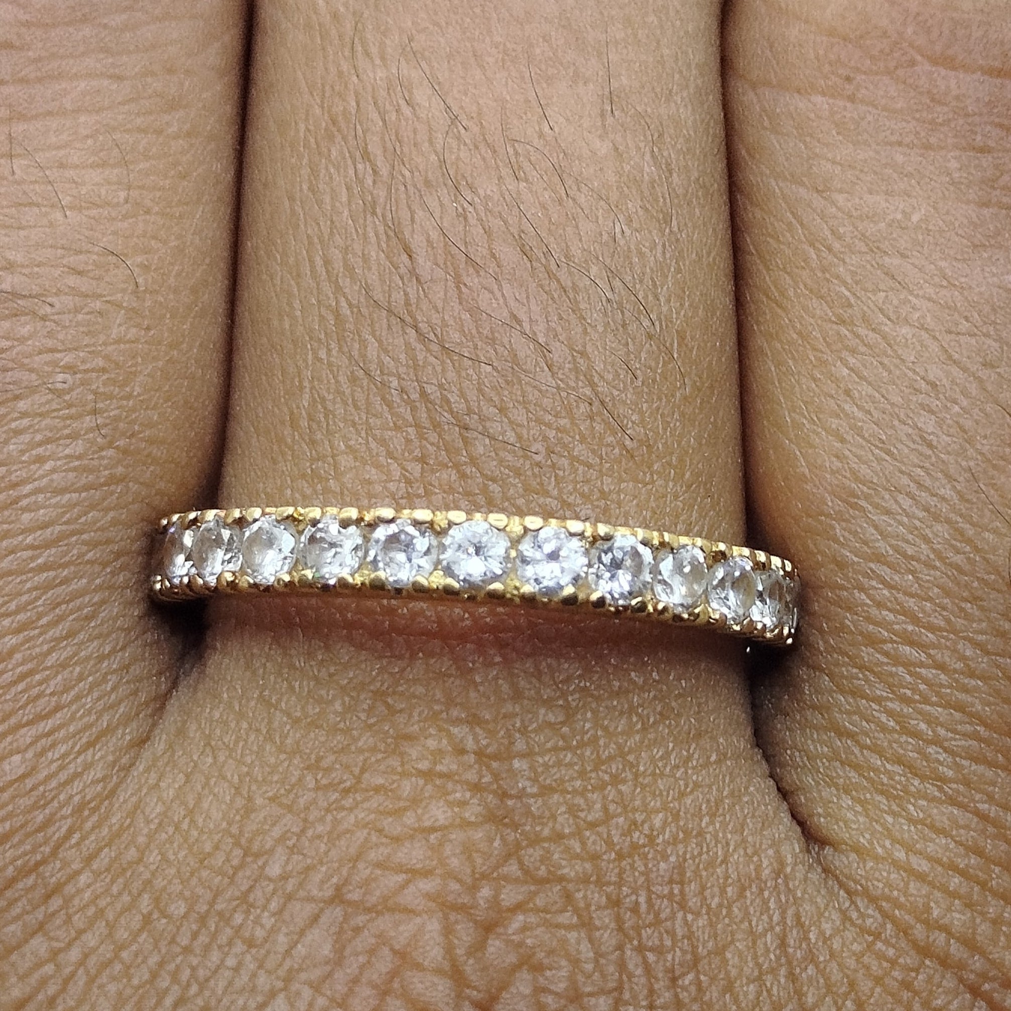 Bague tour complet en or jaune 750/1000 (18 carats), sans poinçon. Sertie d’oxydes de zirconium pour un éclat raffiné. Poids : 2,88 g. Taille 58. Très bon état.