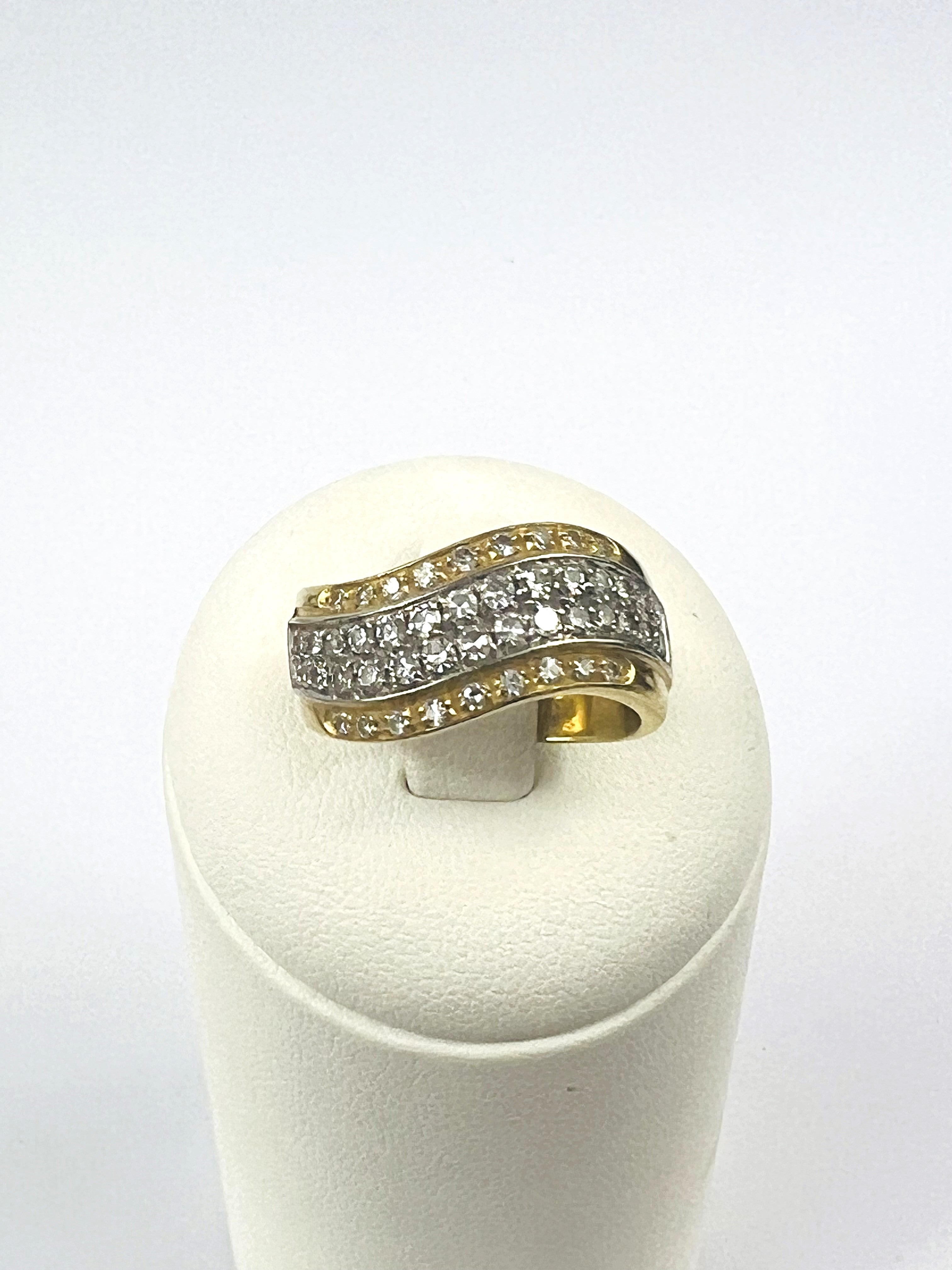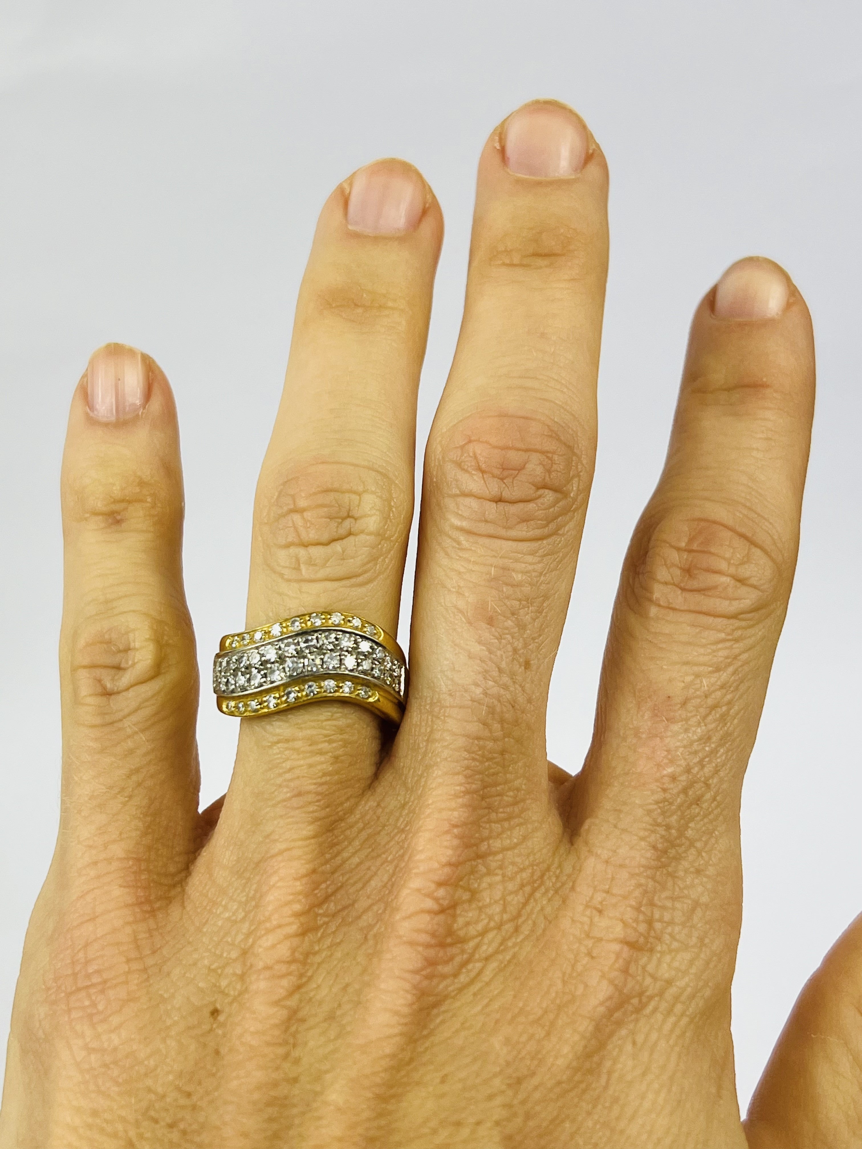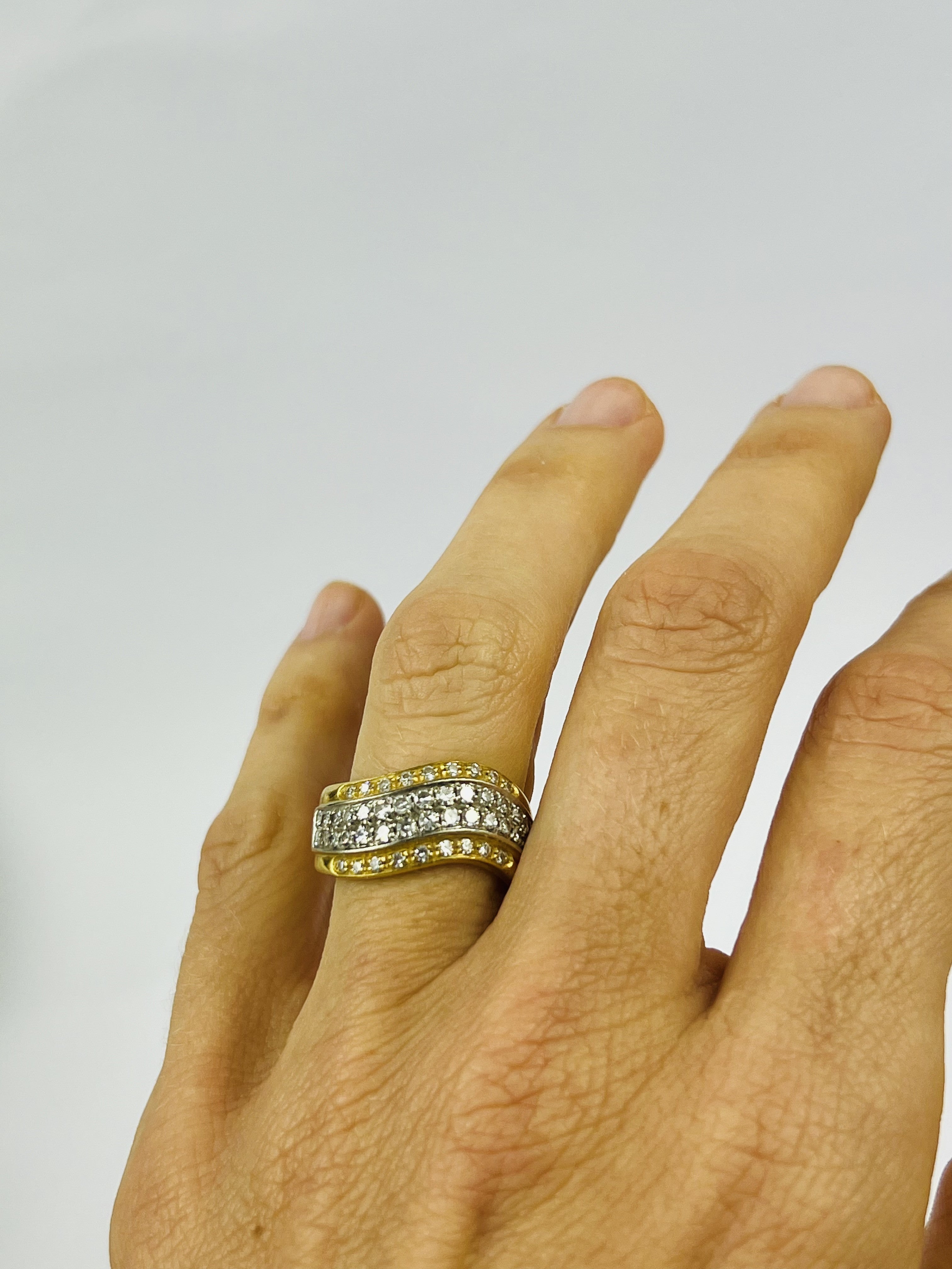 Magnifique bague mouvementée 2 ors 750/1000 centrée de 2 lignes de diamants 8/8, bordée de diamants 8/8
