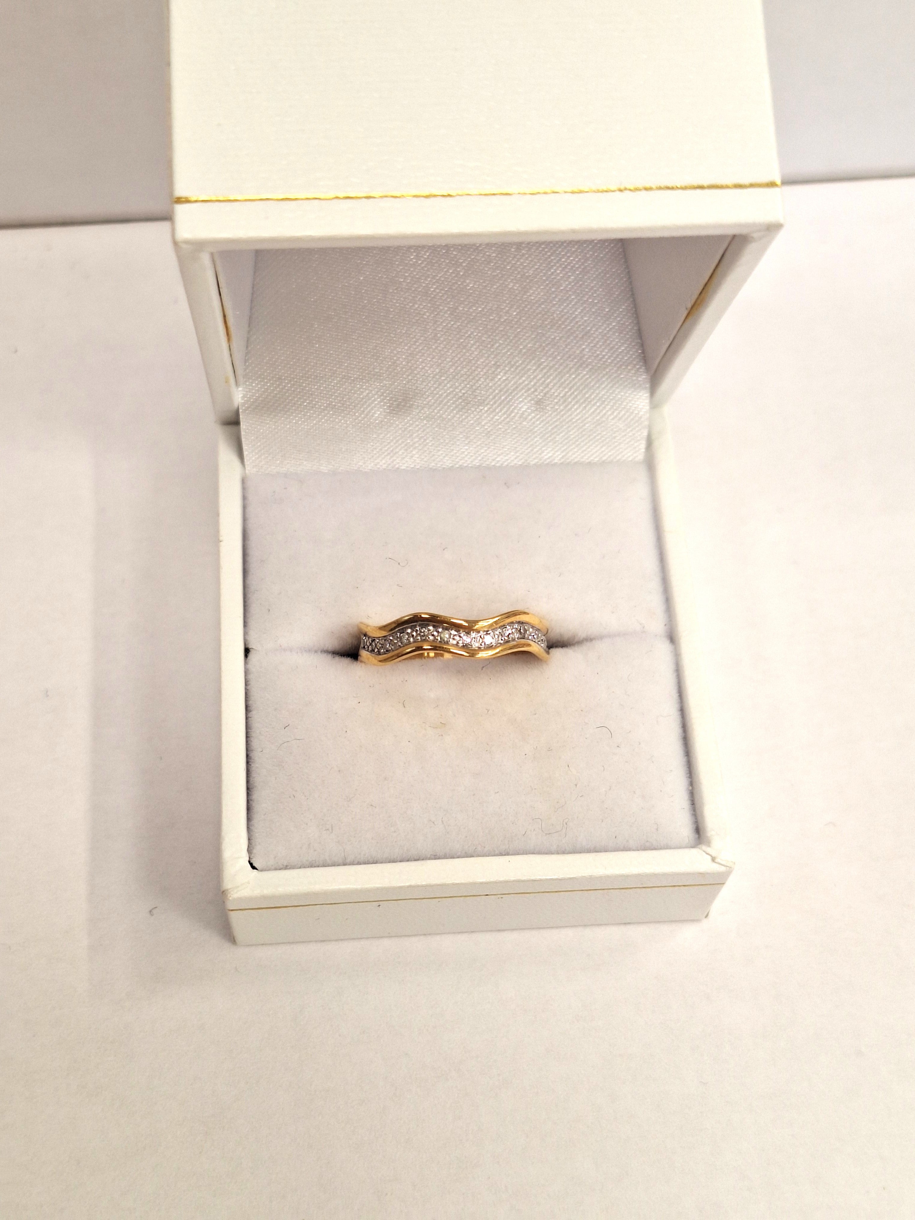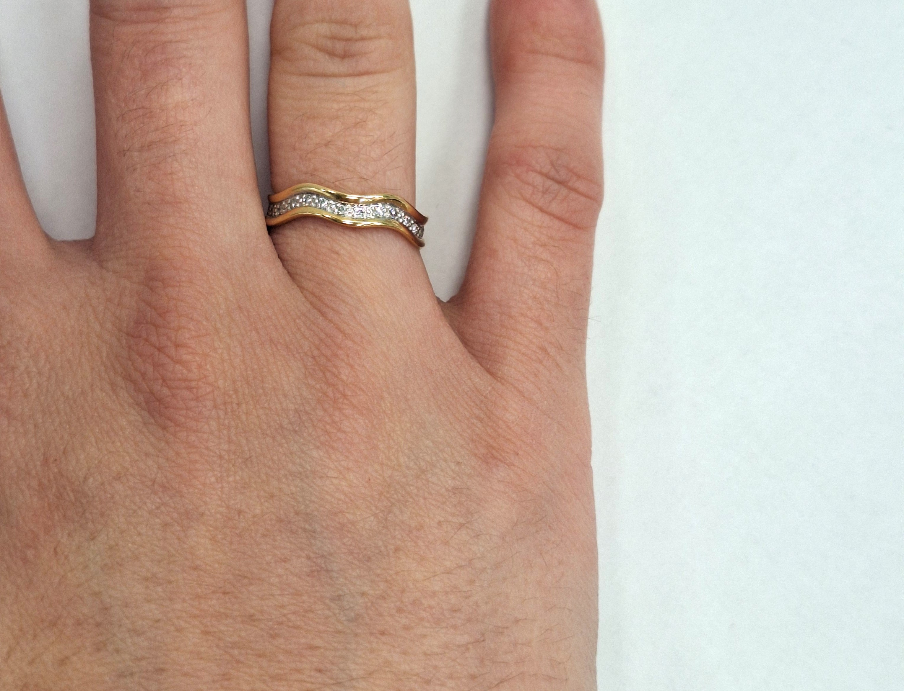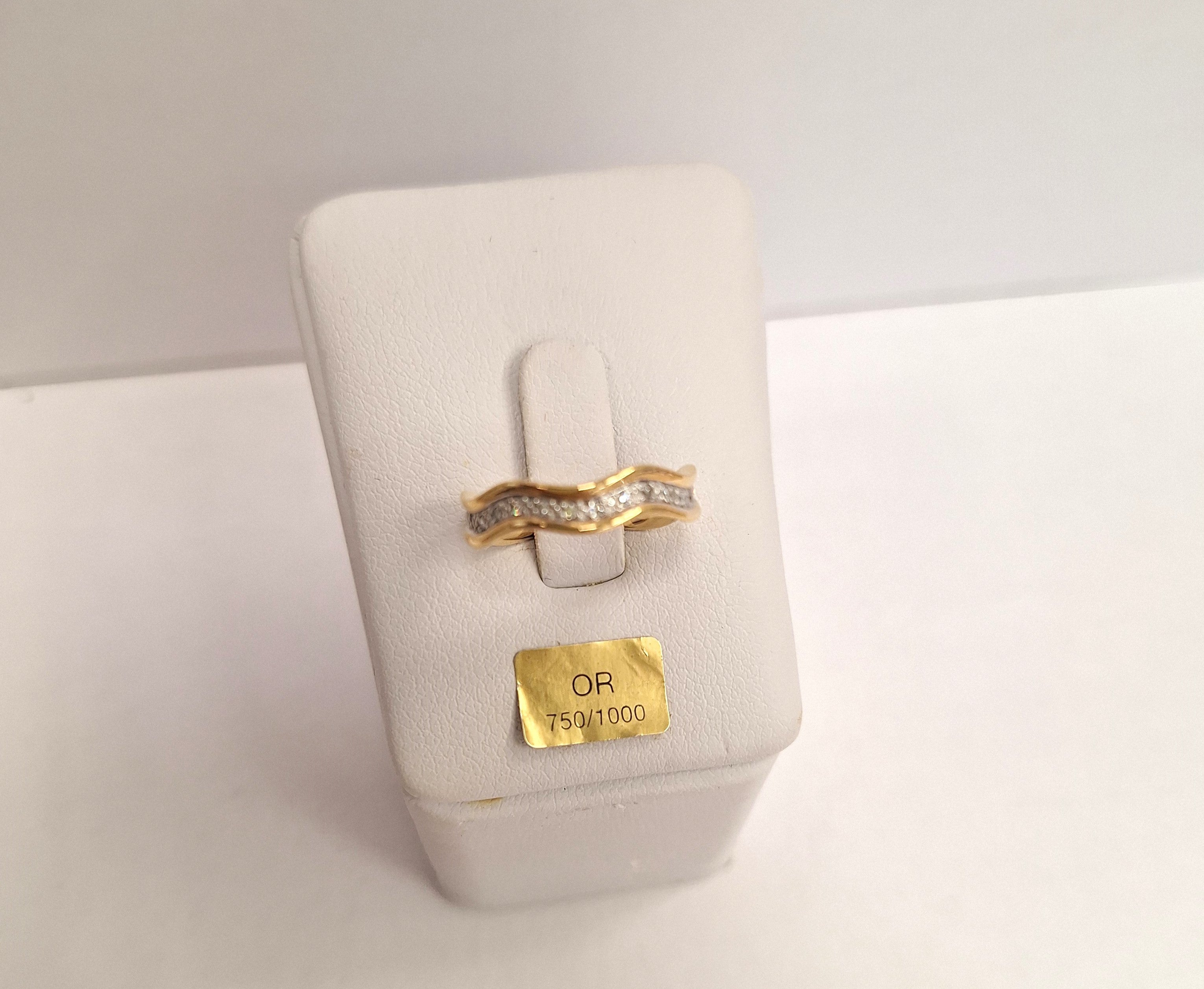 Très jolie alliance en or jaune 18 carats, sertie en demi tour de 13 diamants de 0.01 carats. Sa forme ondulé donne toute l'originalité à la bague.