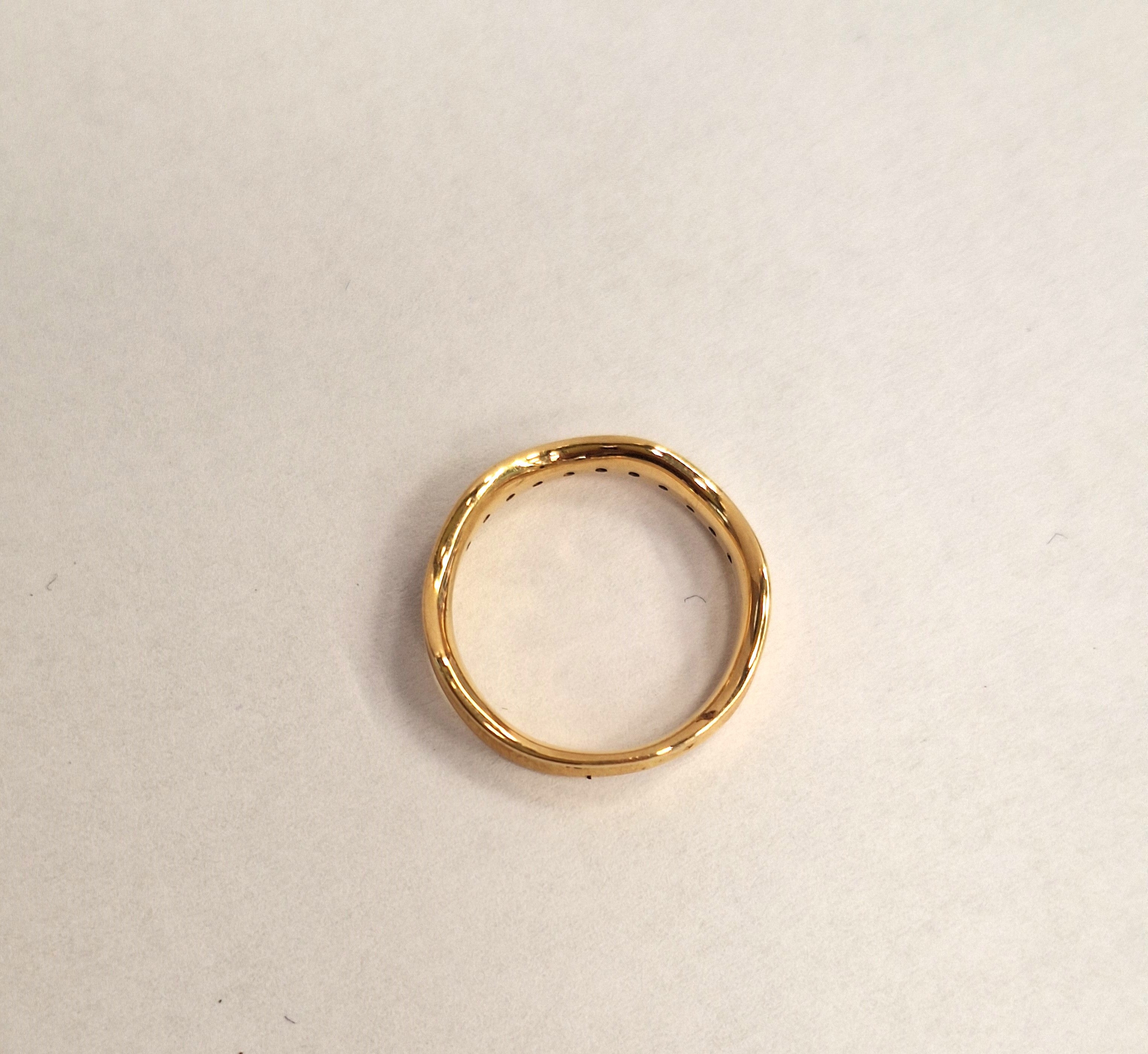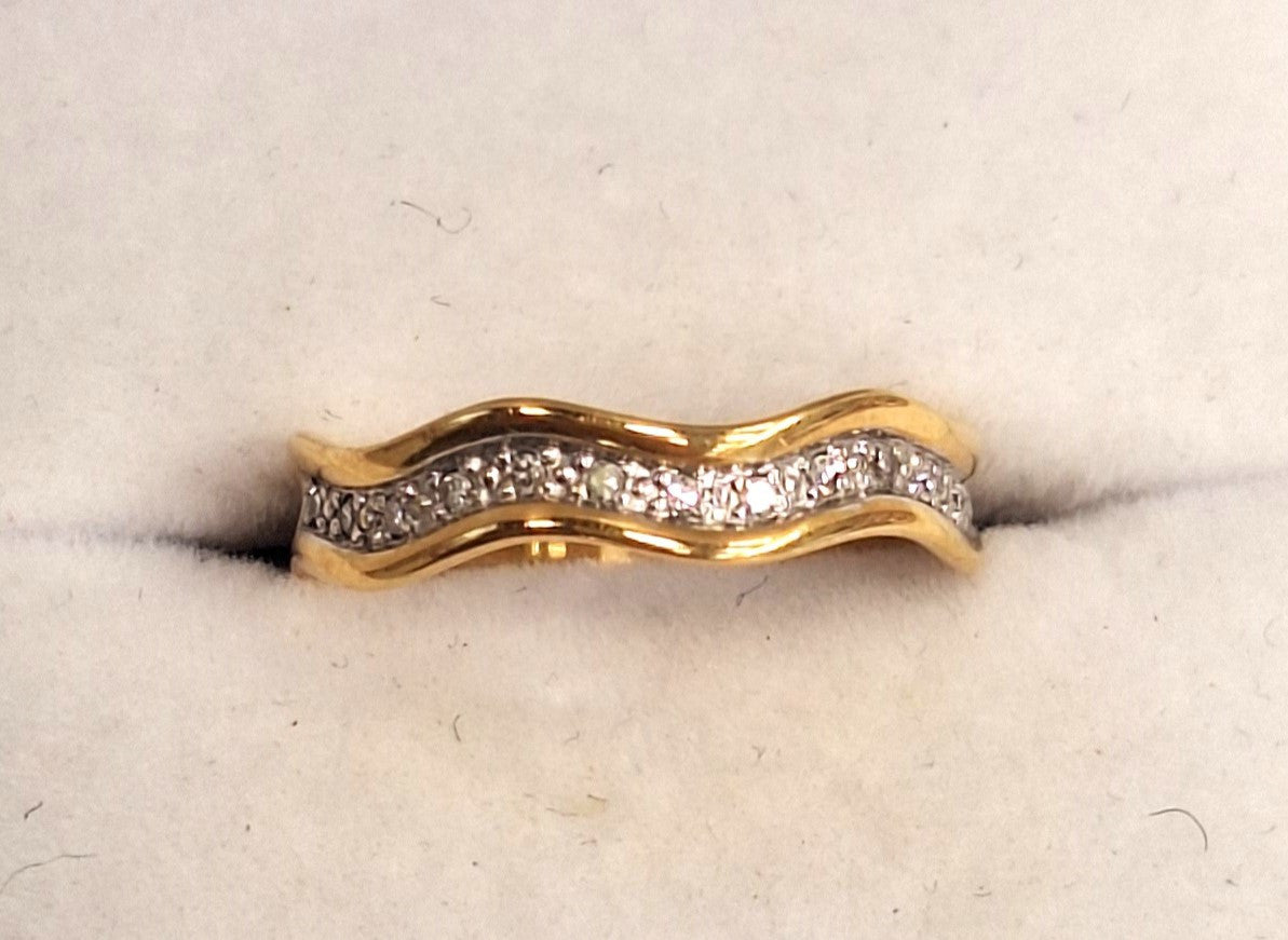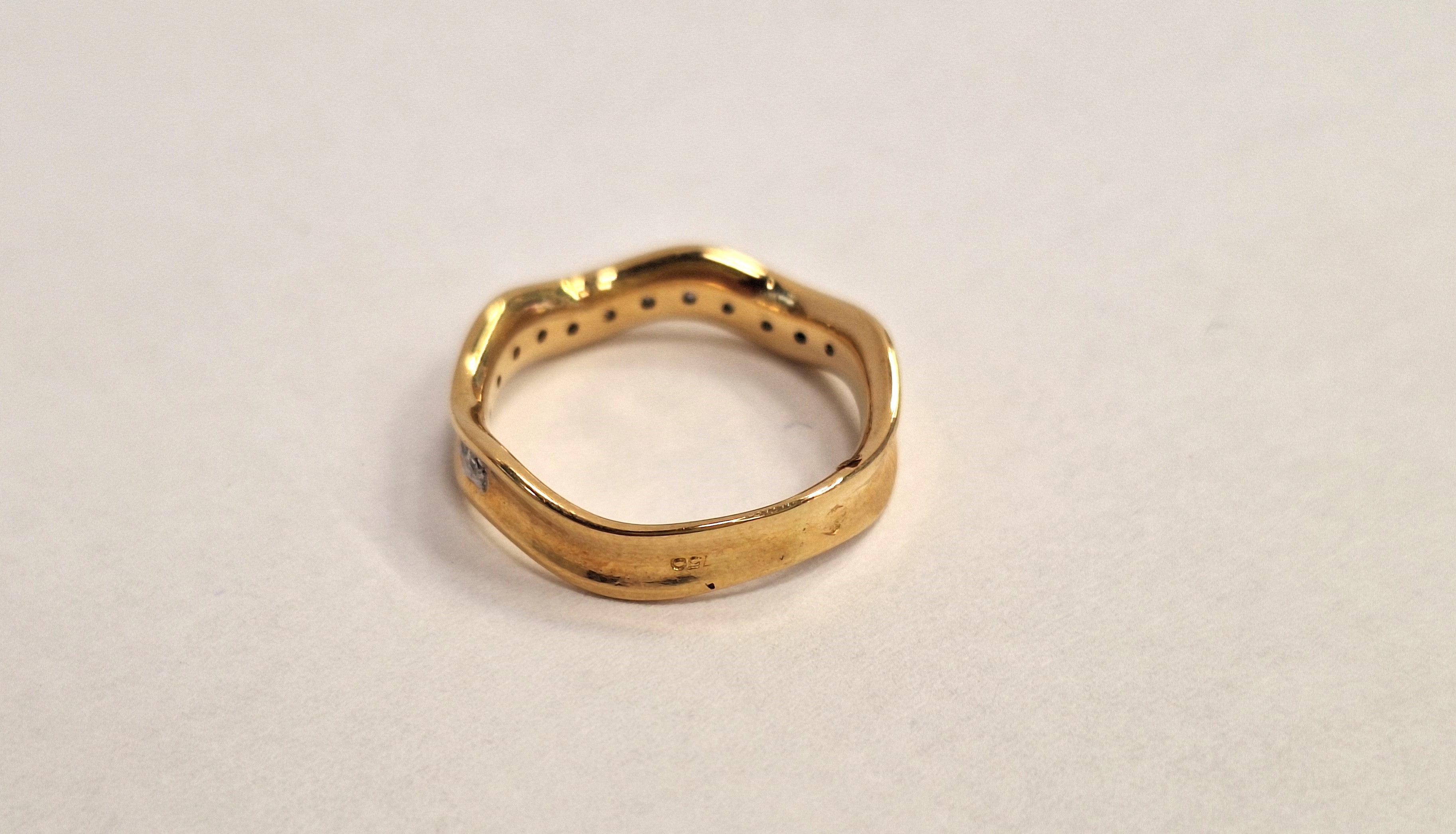 Très jolie alliance en or jaune 18 carats, sertie en demi tour de 13 diamants de 0.01 carats. Sa forme ondulé donne toute l'originalité à la bague.