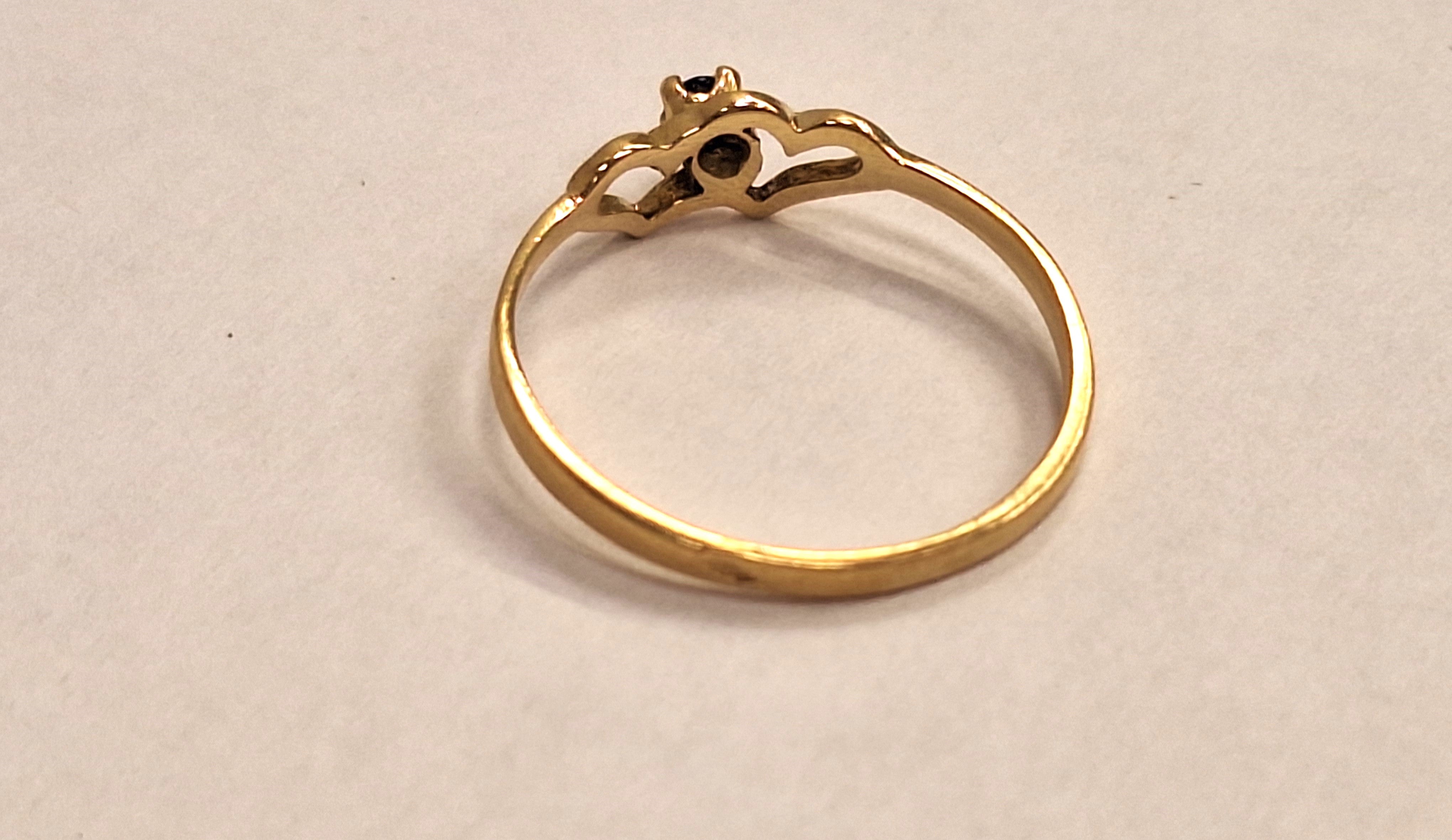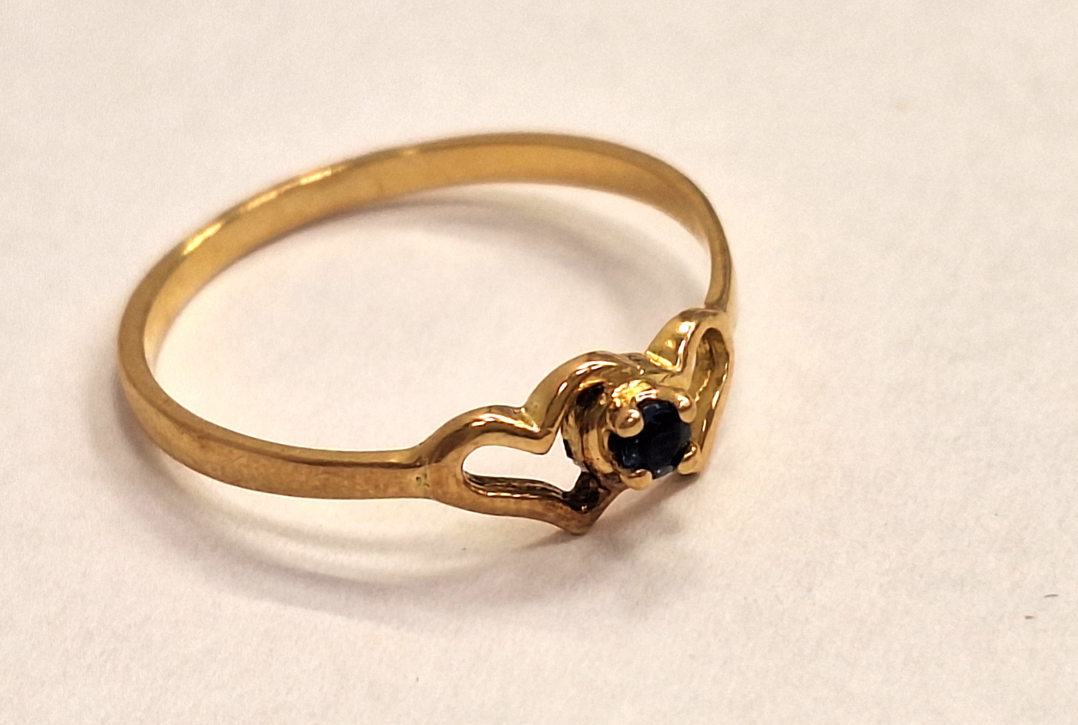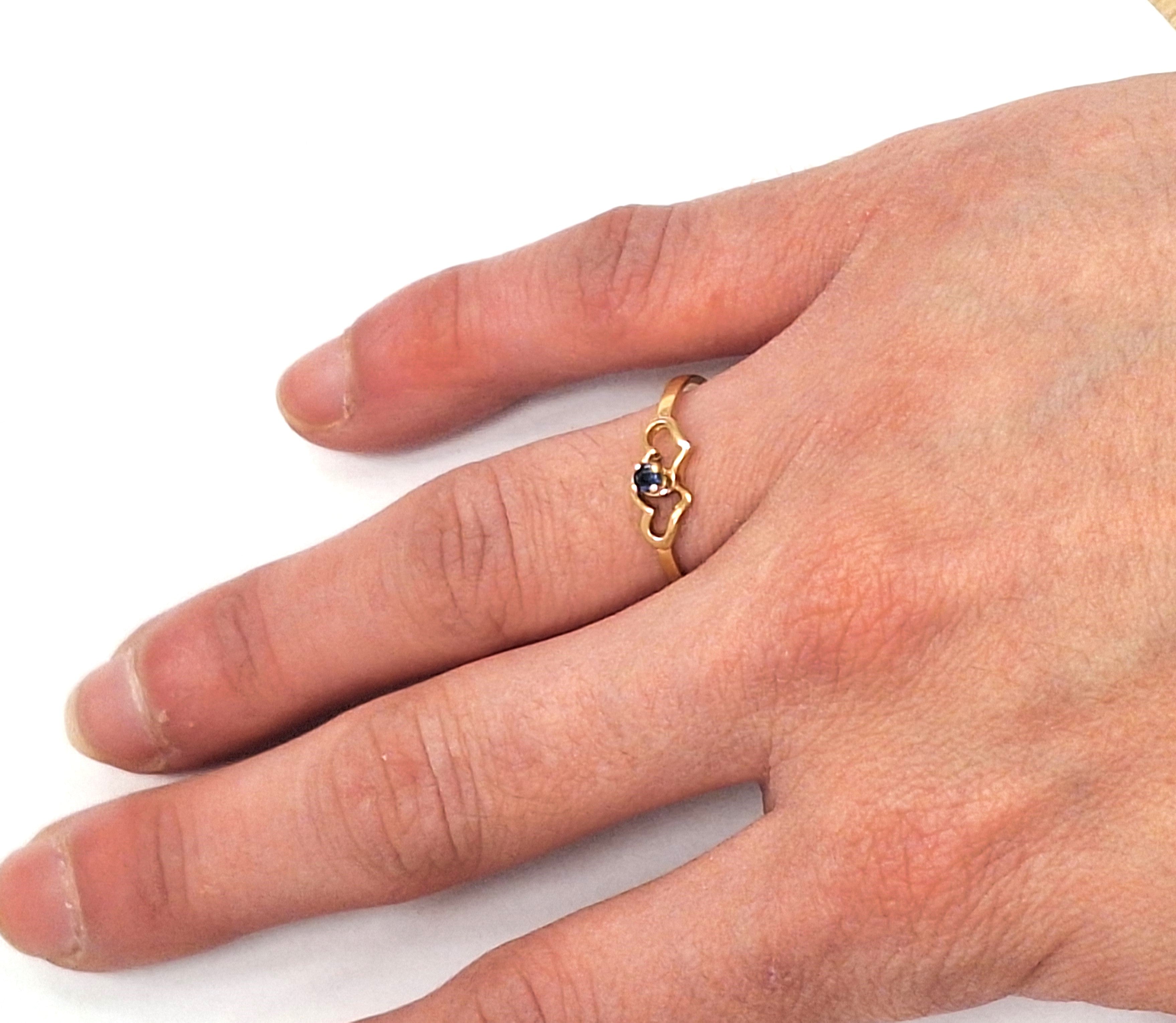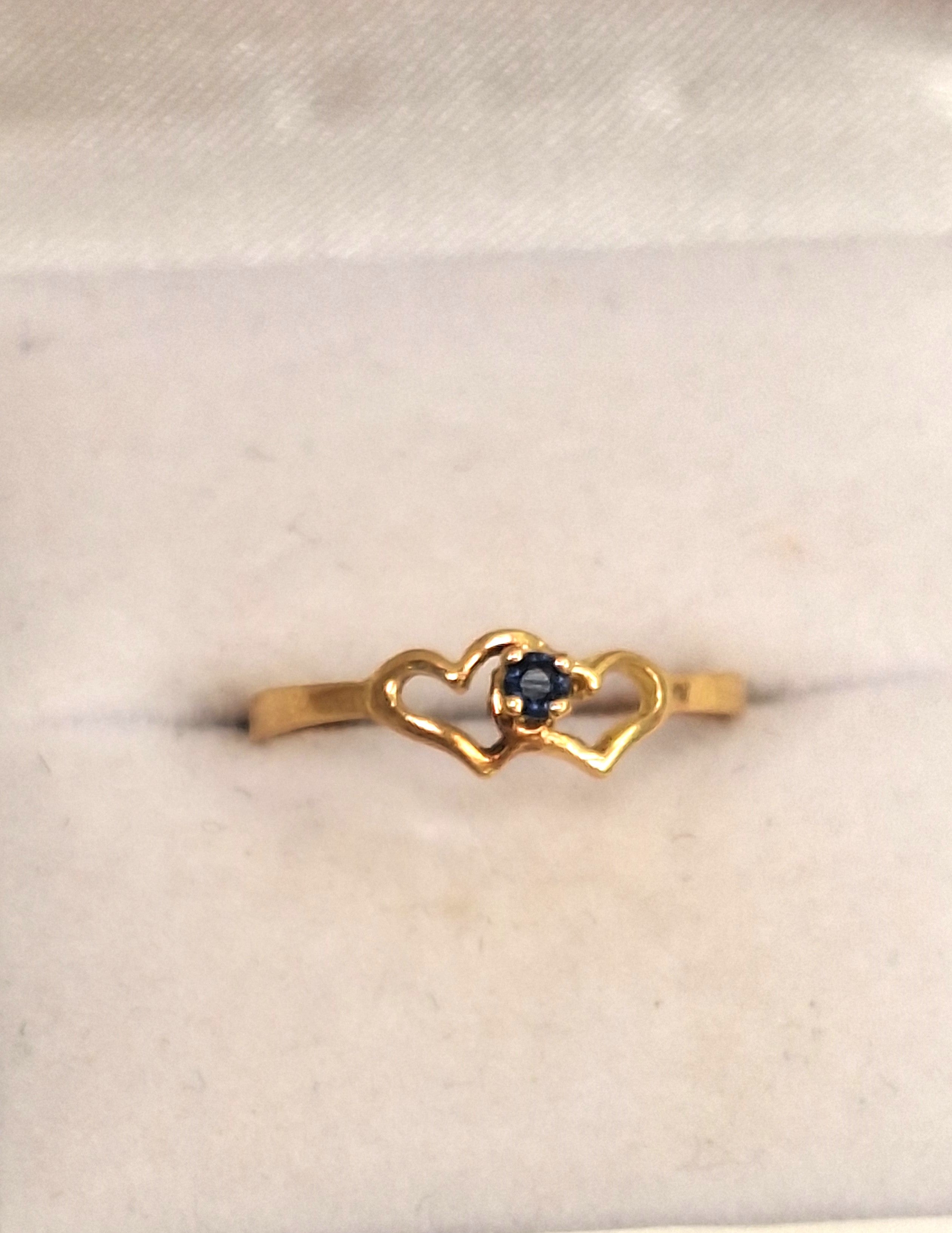 Très jolie bague en or jaune 18 carats sertie en son centre d'une pierre naturelle bleue entre deux coeurs