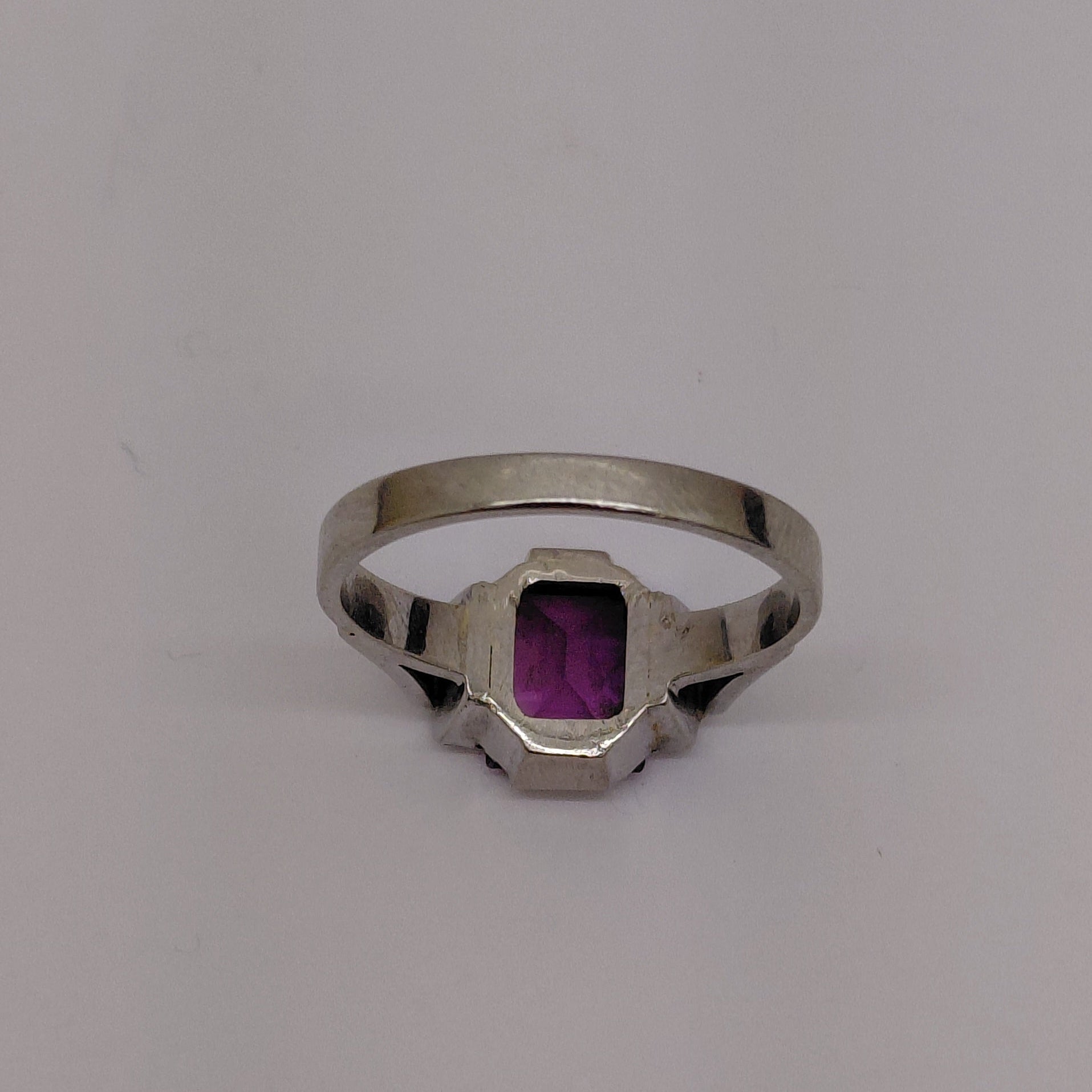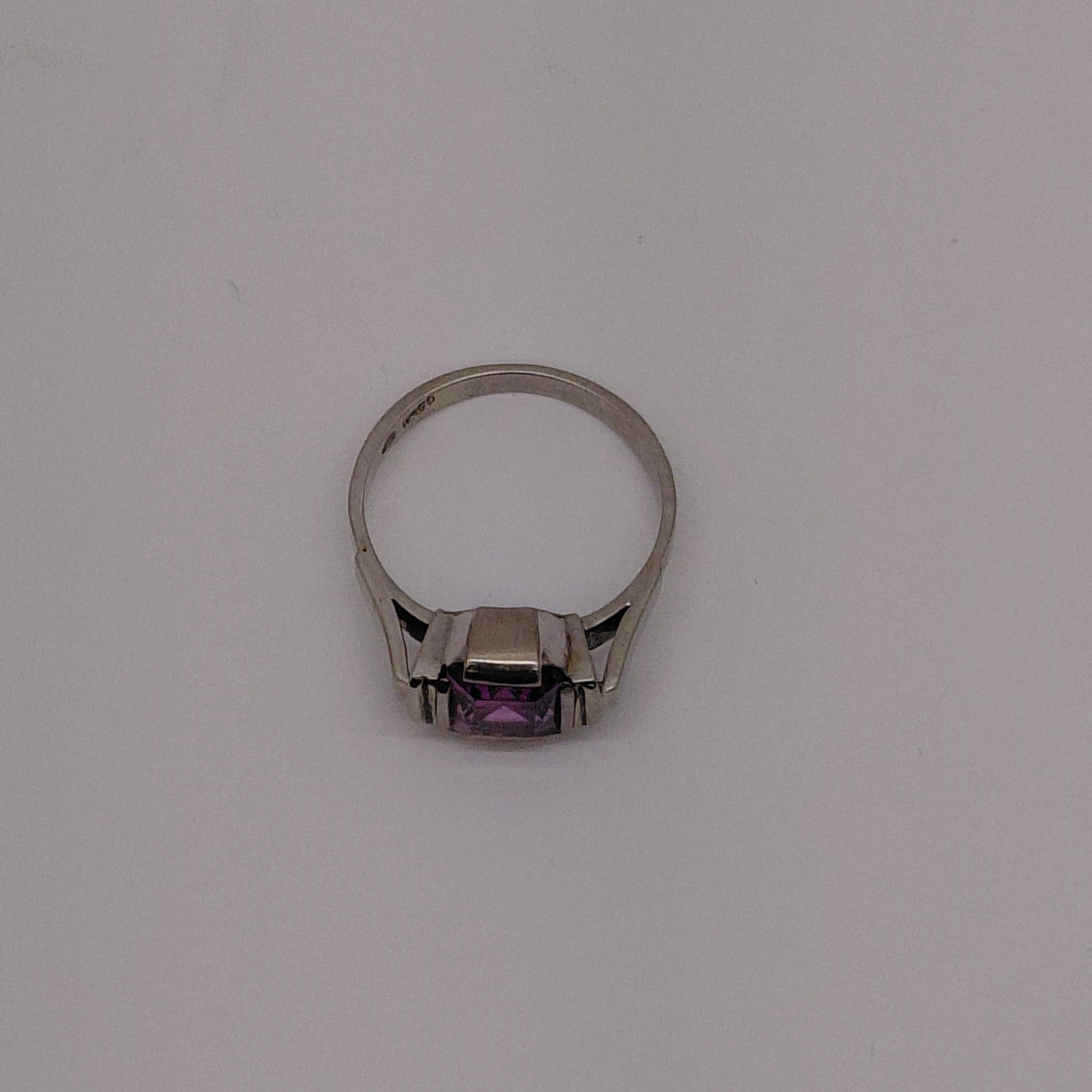 Bague empierrée en or gris 18 carats (750/1000), ornée d'une améthyste. Elle pèse 6,02 grammes et correspond à une taille 56. Le bijou est poinçonné "750" et se trouve en bon état général.