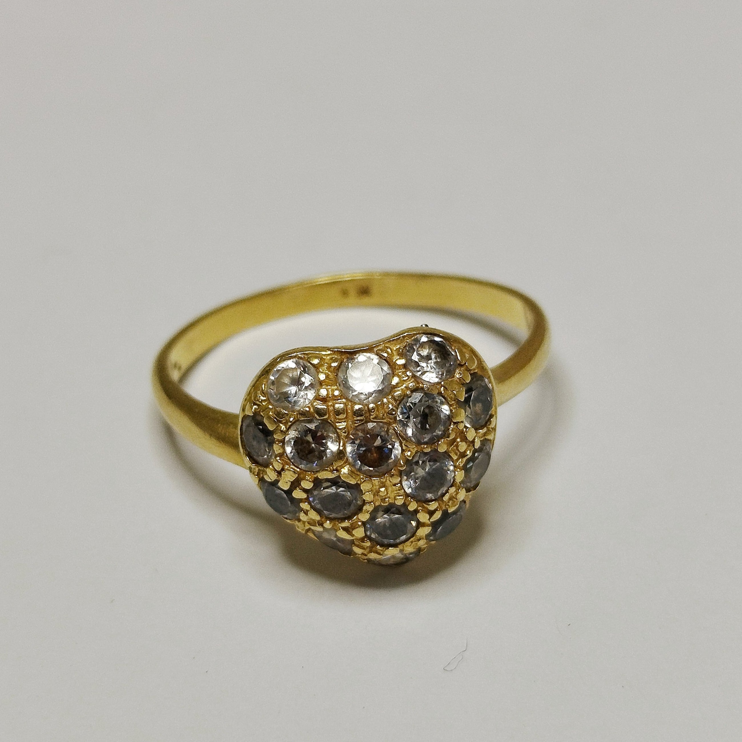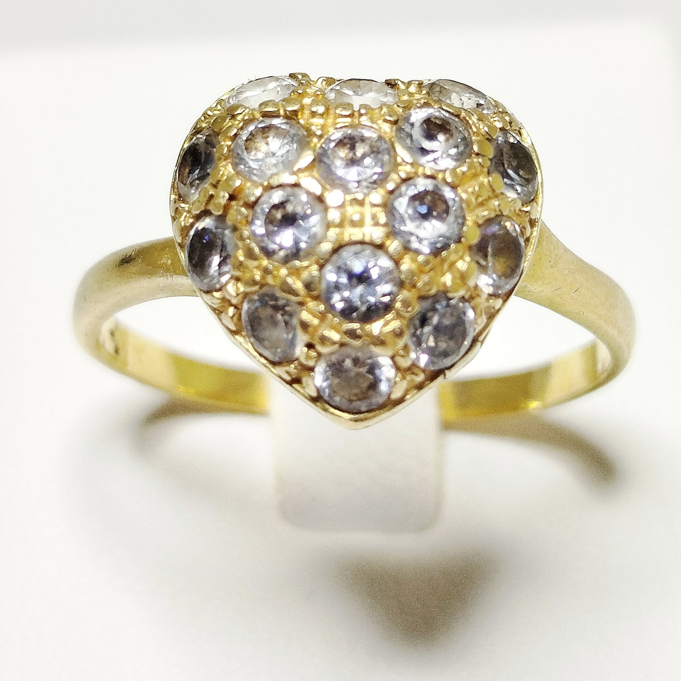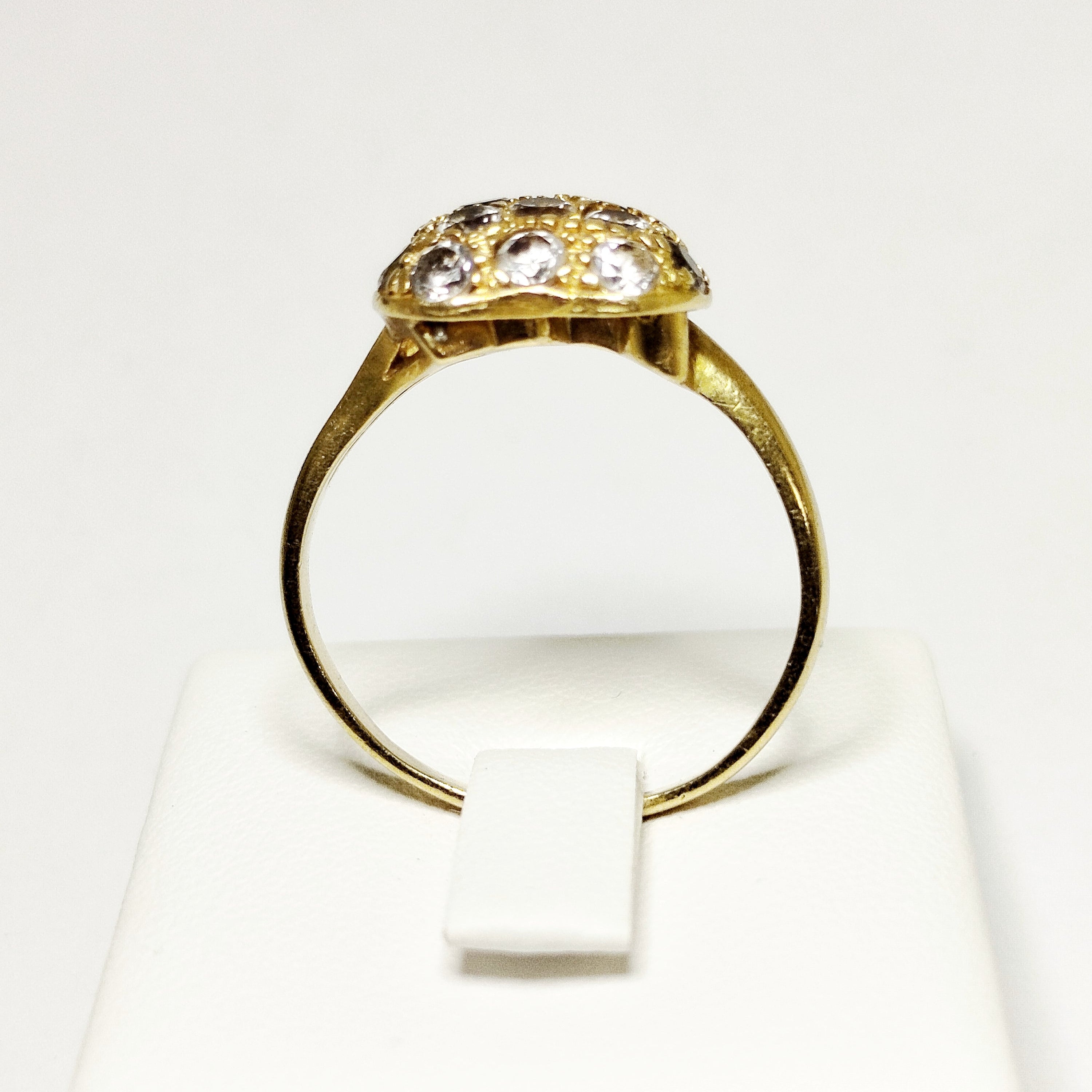 Bague empierrée en or jaune 18 carats (750/1000), poinçonnée 18K, d’un poids de 3,77 grammes et en taille 56. Elle est ornée d’oxydes de zirconium qui lui apportent éclat et brillance. En bon état.