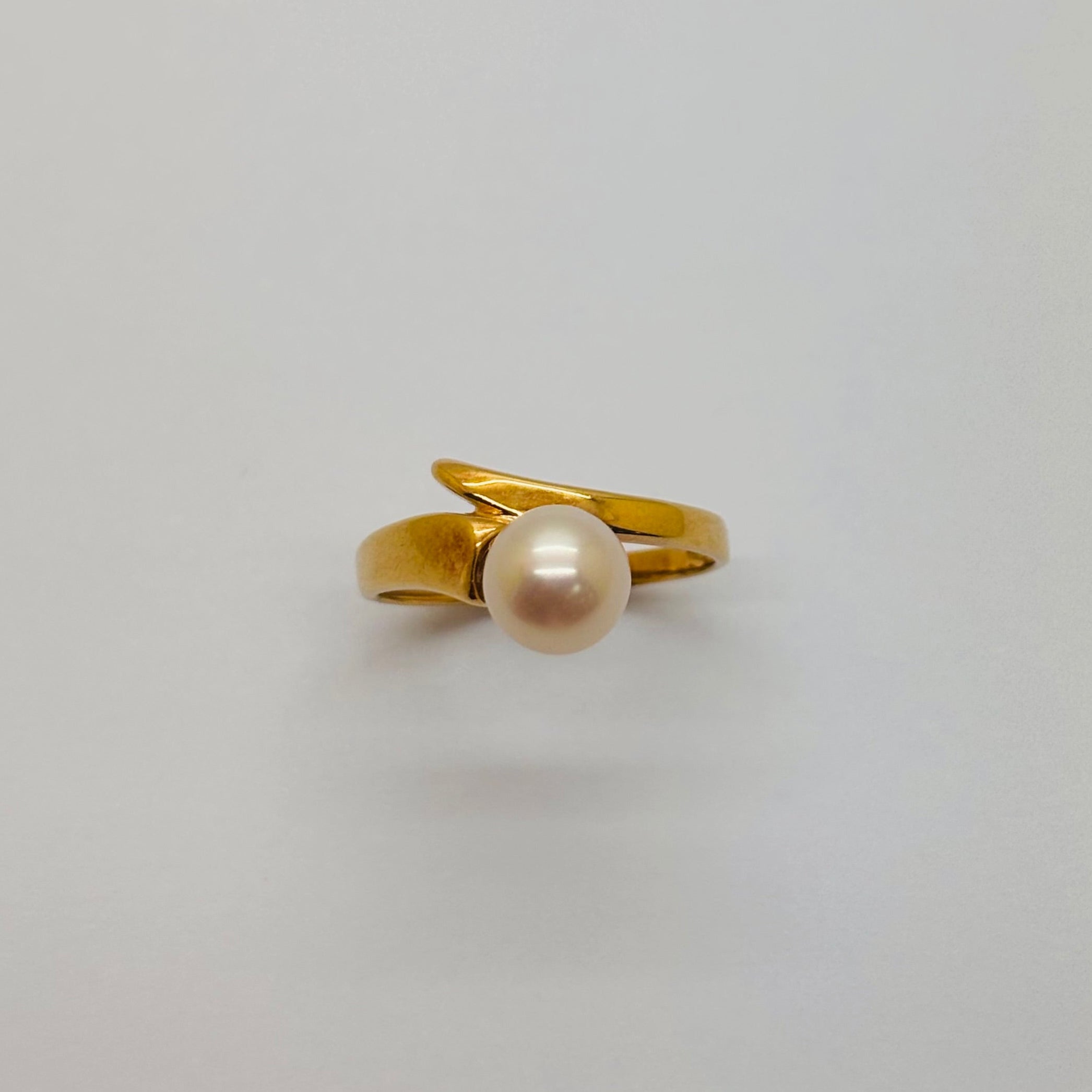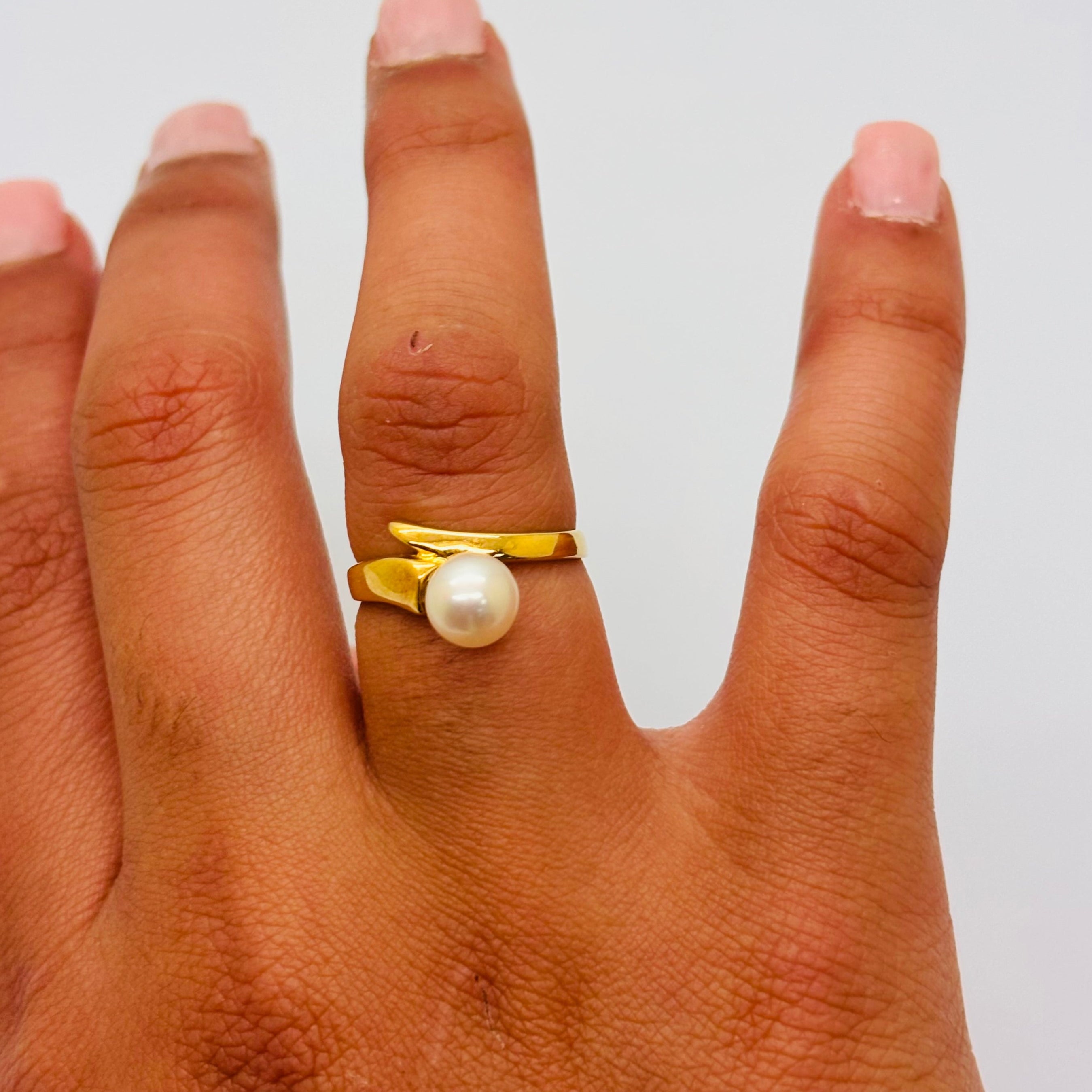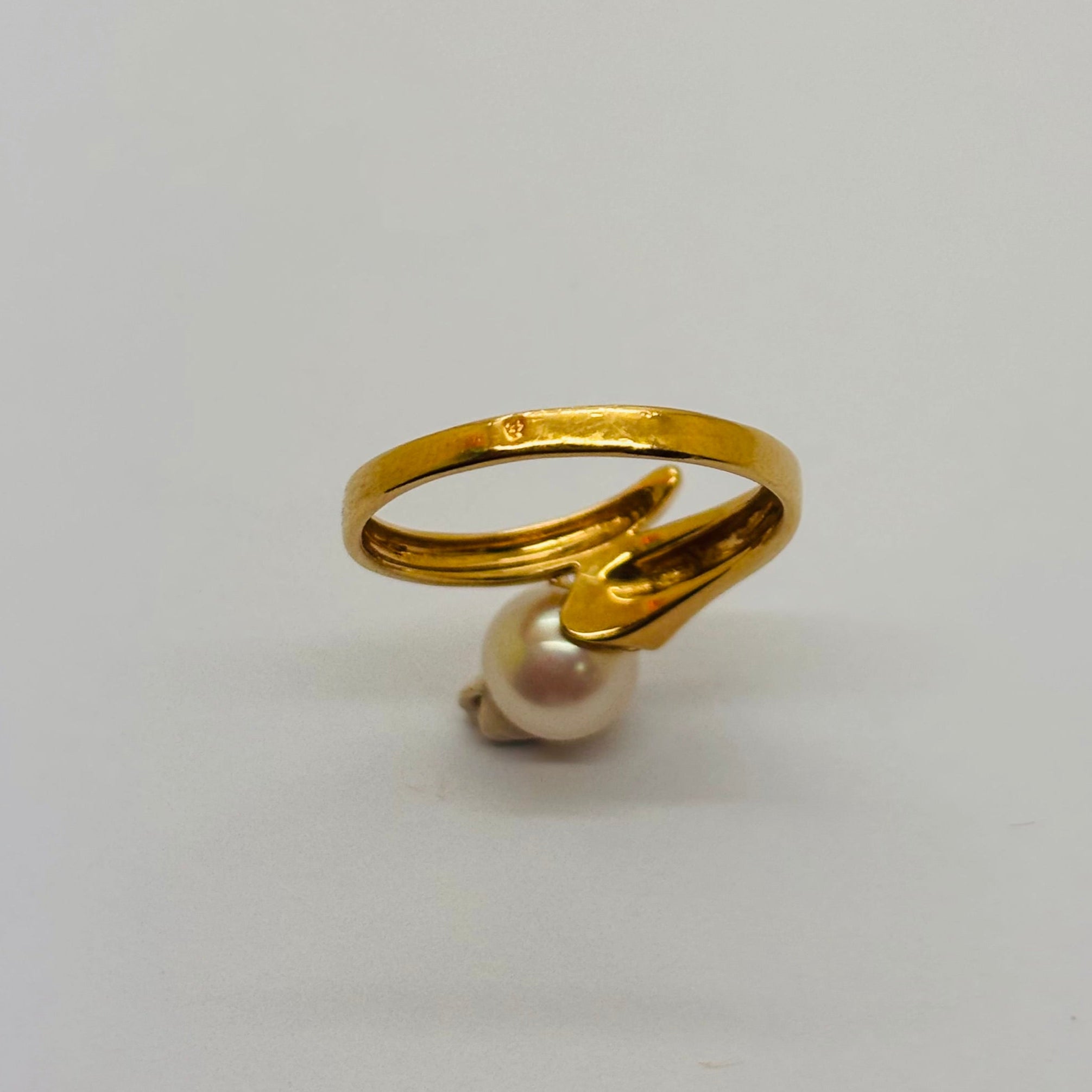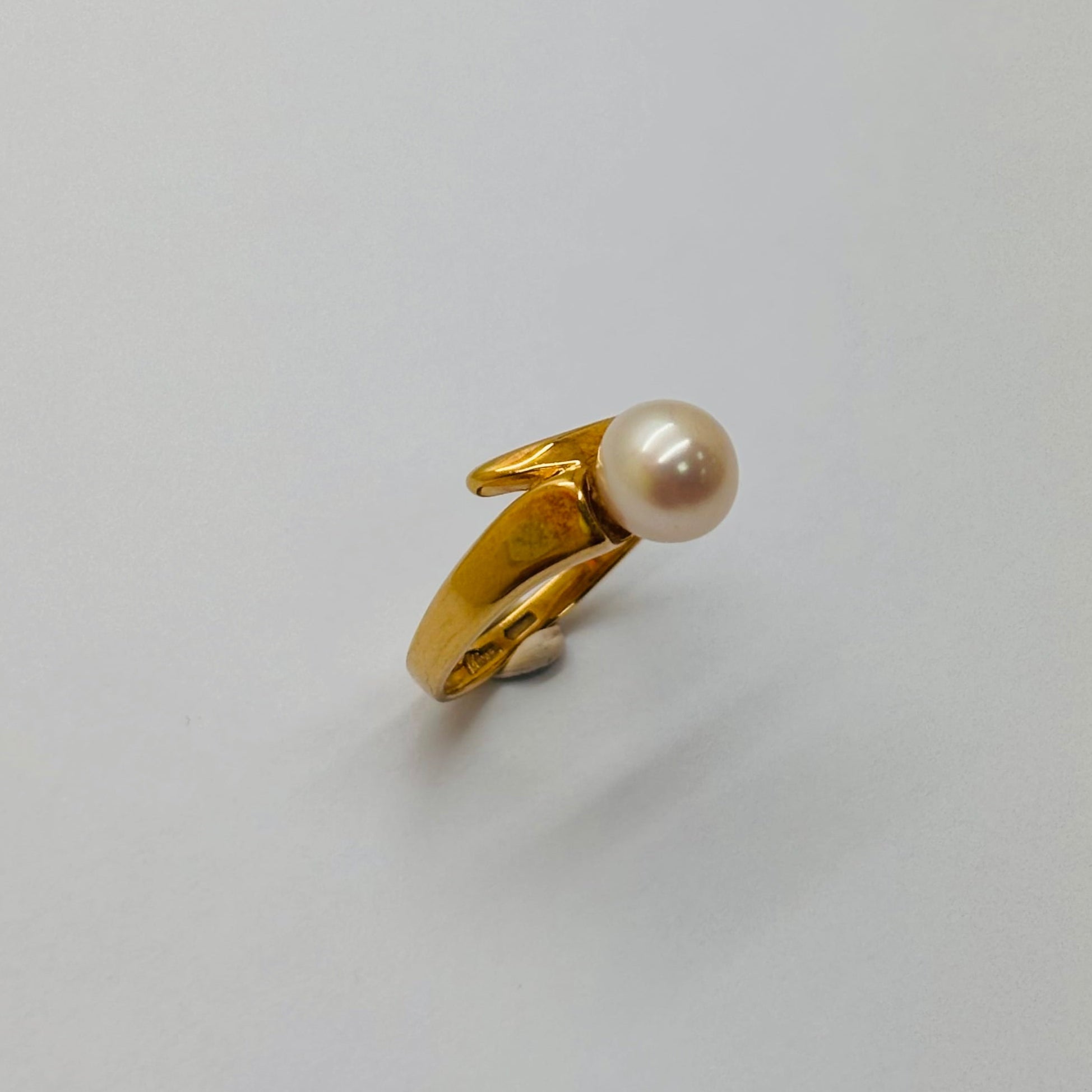Ravissante bague en or jaune 18 carats (750/1000), ornée d’une perle blanche.