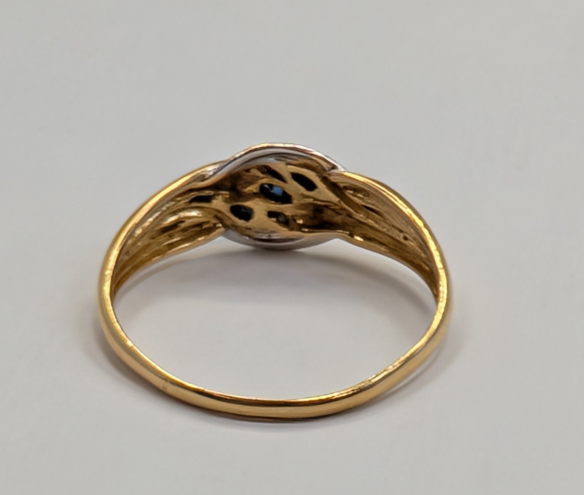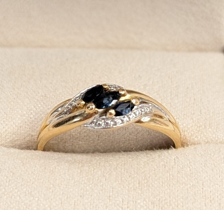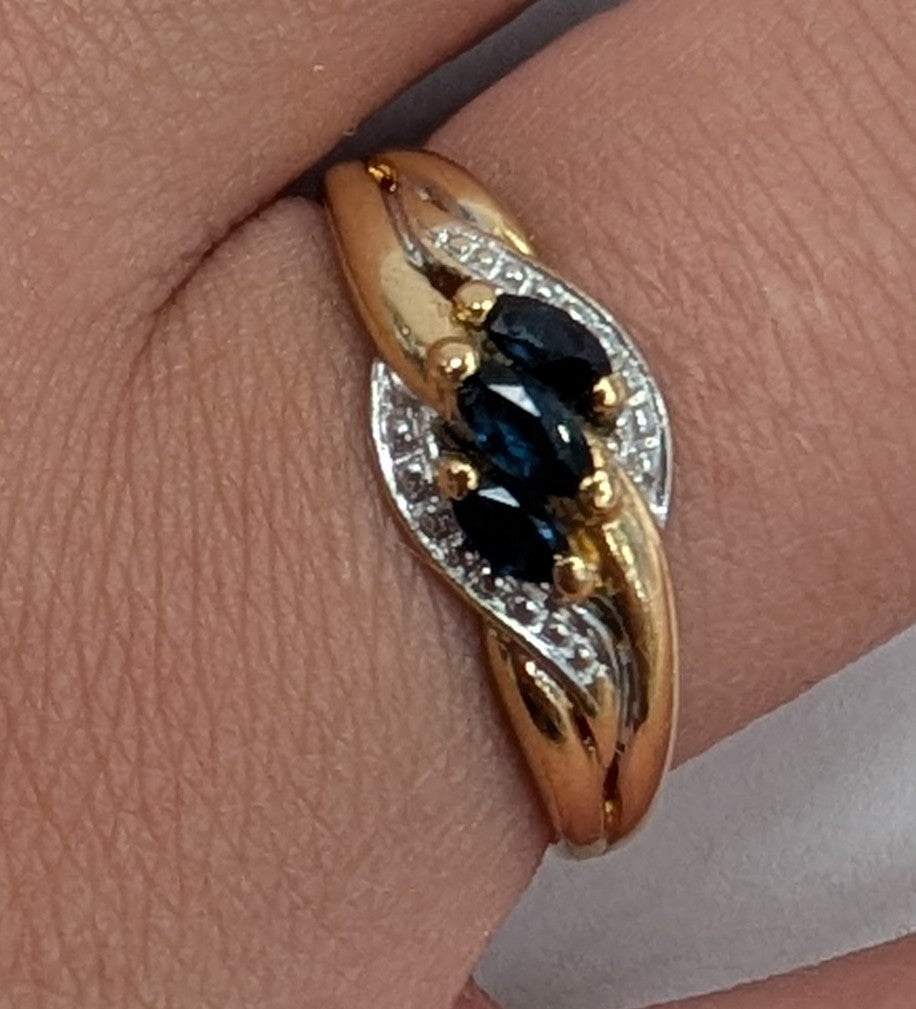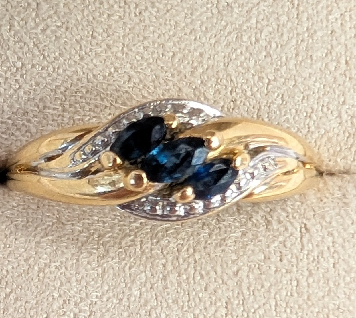 Bague empierrée en or jaune 18 carats (750/1000), sans poinçon. Sertie de 3 saphirs naturels bleus de 0,02 carat chacun. Taille 55, poids : 1,80 g. En très bon état. Un bijou fin et coloré, idéal pour une touche d'élégance discrète.