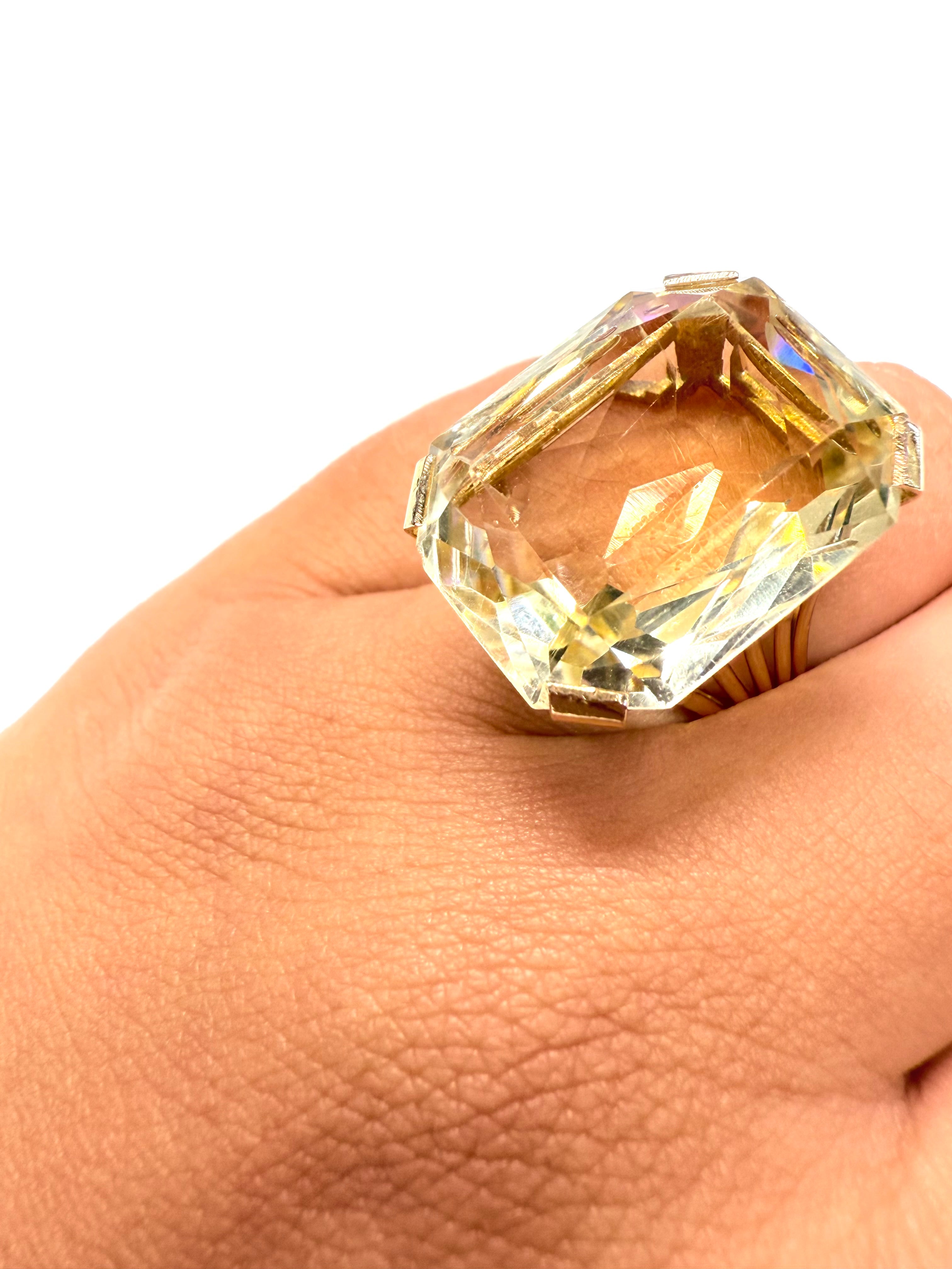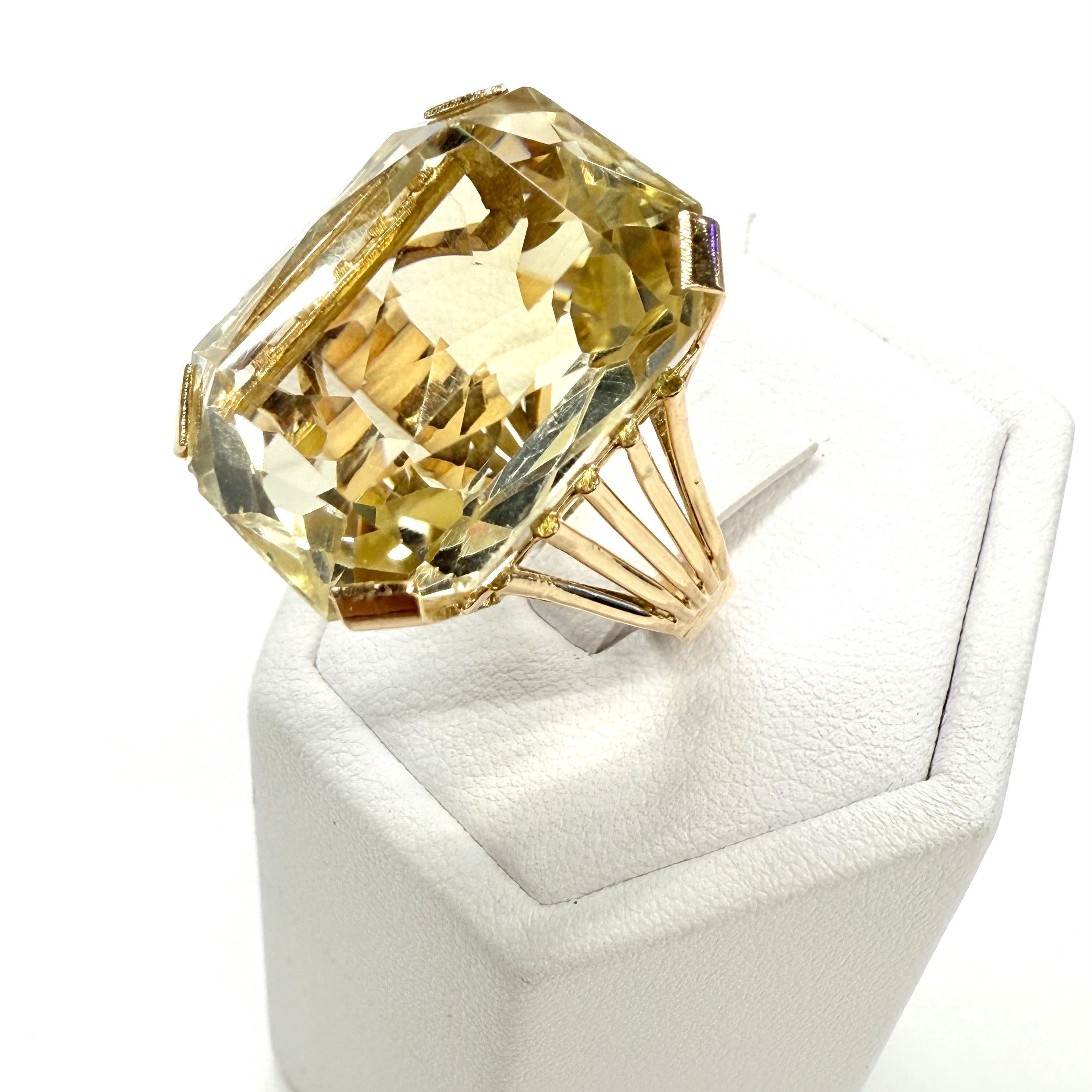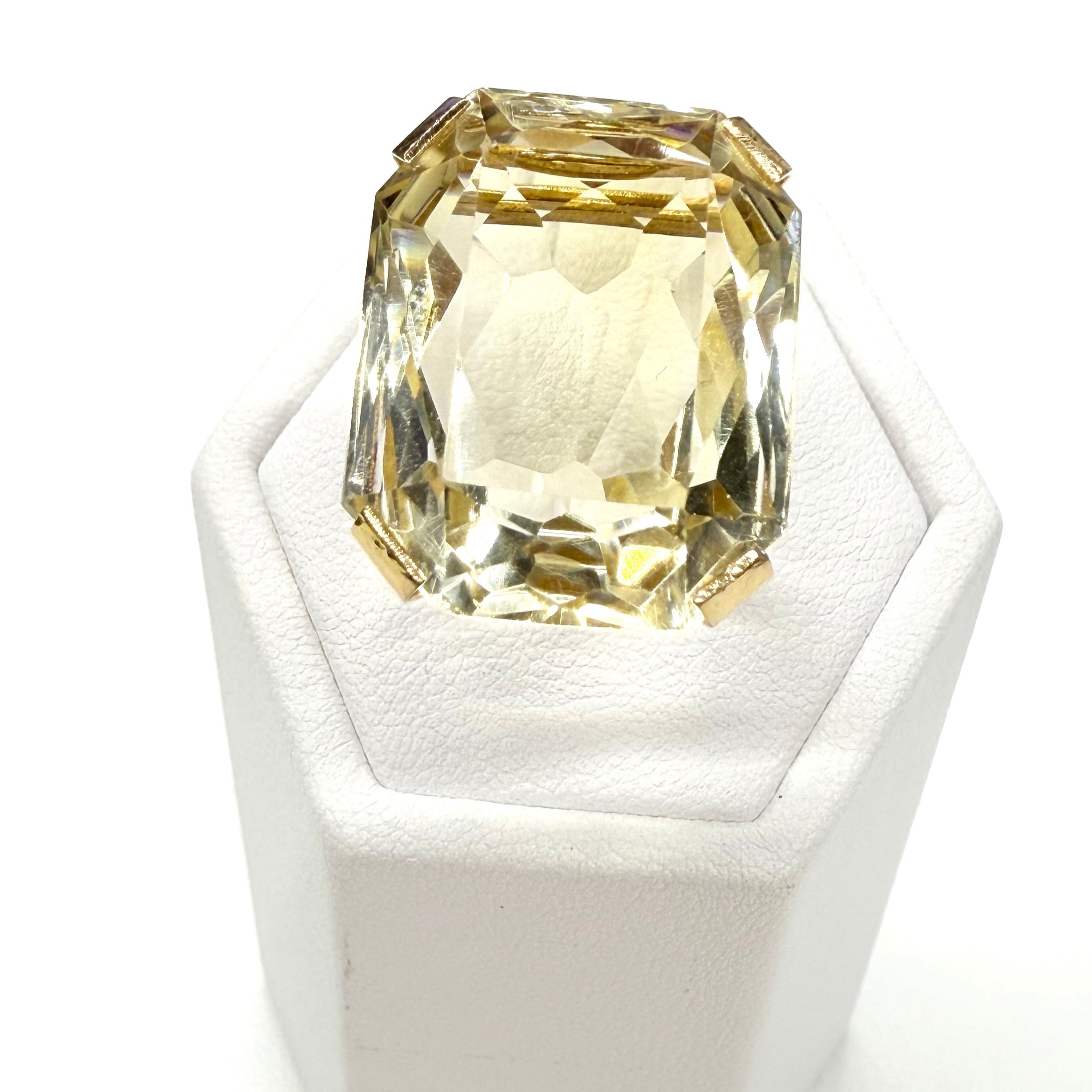 Bague empierrée en or jaune 18K (750/1000), poinçonnée tête d’aigle. Sertie d'une citrine éclatante (2,2 cm x 1,8 cm), cette pièce élégante pèse 11,47 g et est en très bon état. Taille 53.