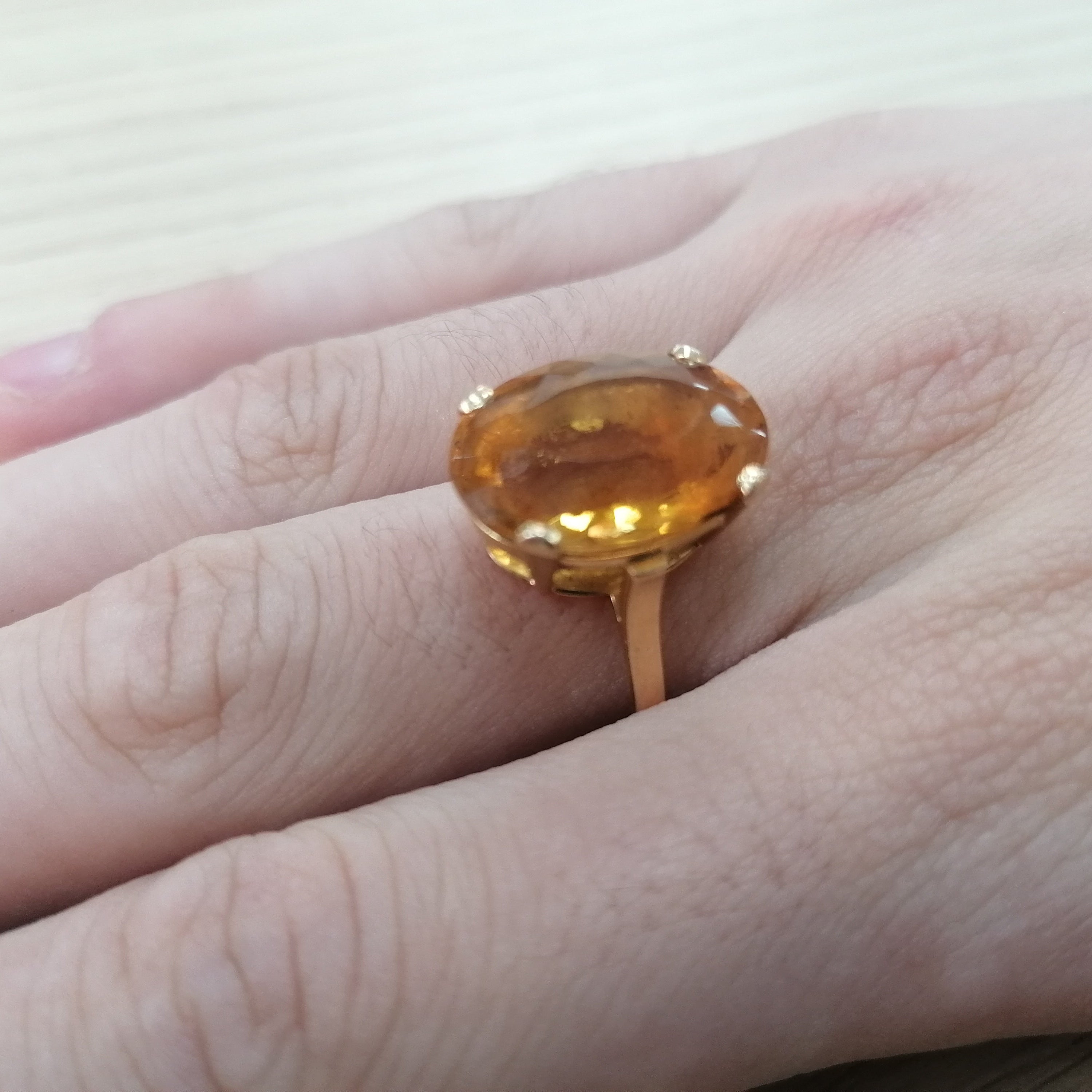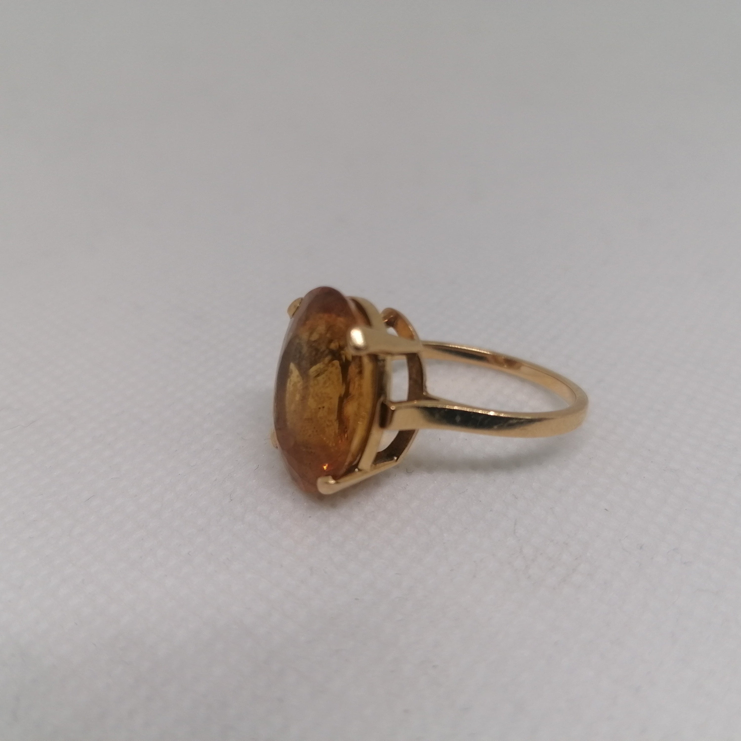 Bague empierrée en or jaune 18 carats (750/1000), poinçonnée tête d'aigle, pèse 5.81 grammes et est de taille 57. Elle est ornée d'une citrine et est en très bon état général.