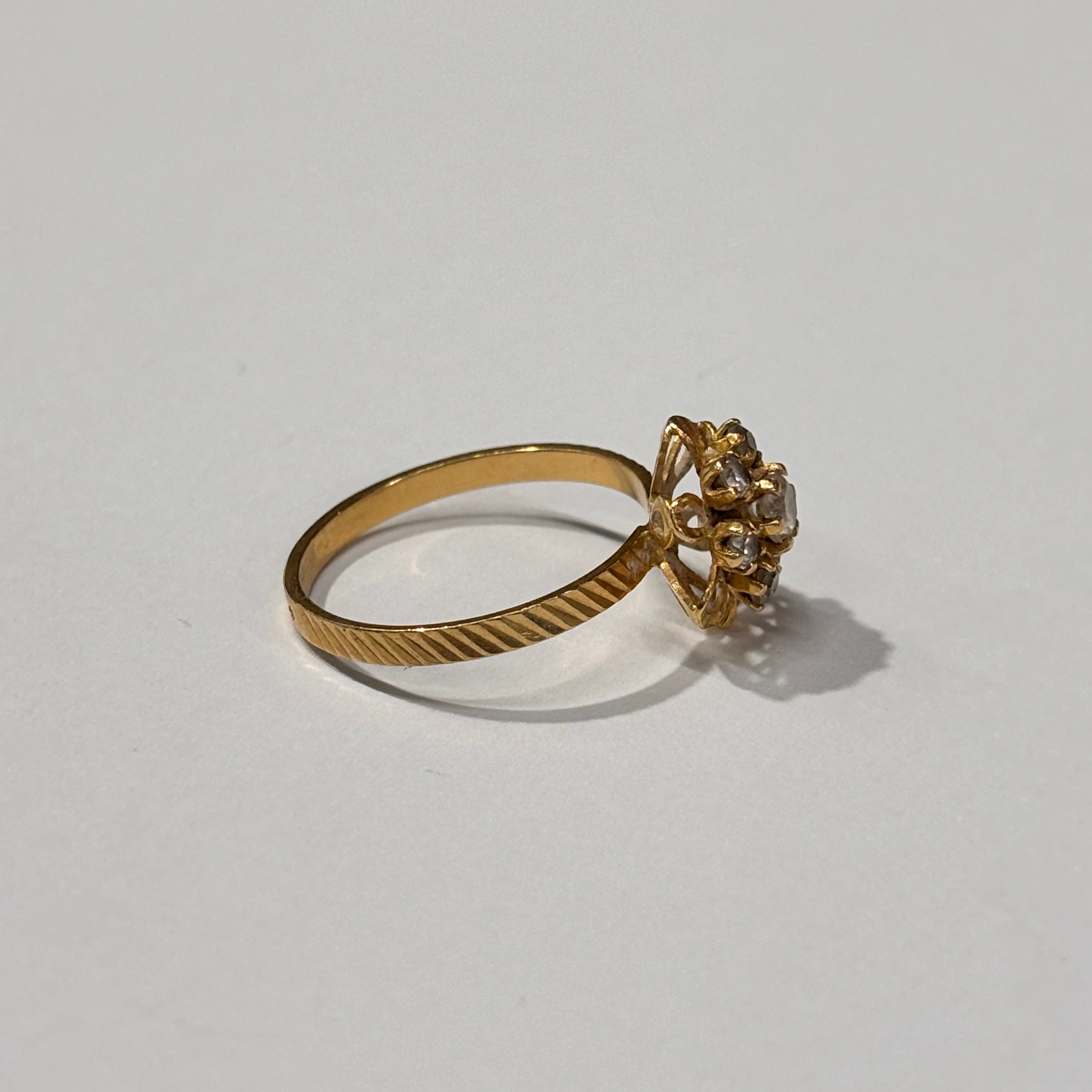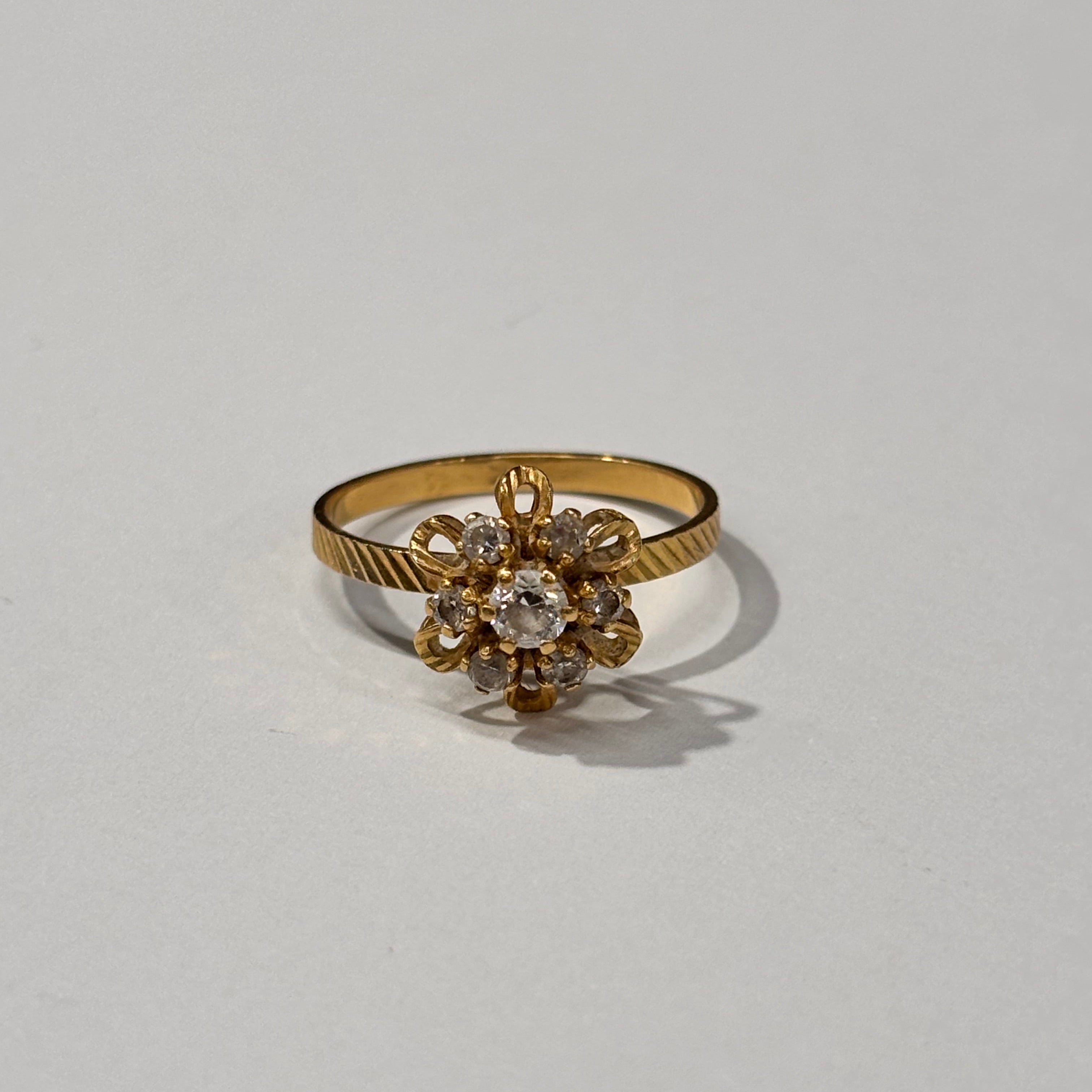 Bague de type chou en or jaune 18 carats (750/1000), ornée du poinçon en forme de tête d’aigle. Elle pèse 2,32 grammes, est proposée en taille 55 mm, et sertie de 6 oxydes de zirconium qui apportent une touche de brillance. L’ensemble est en très bon état.