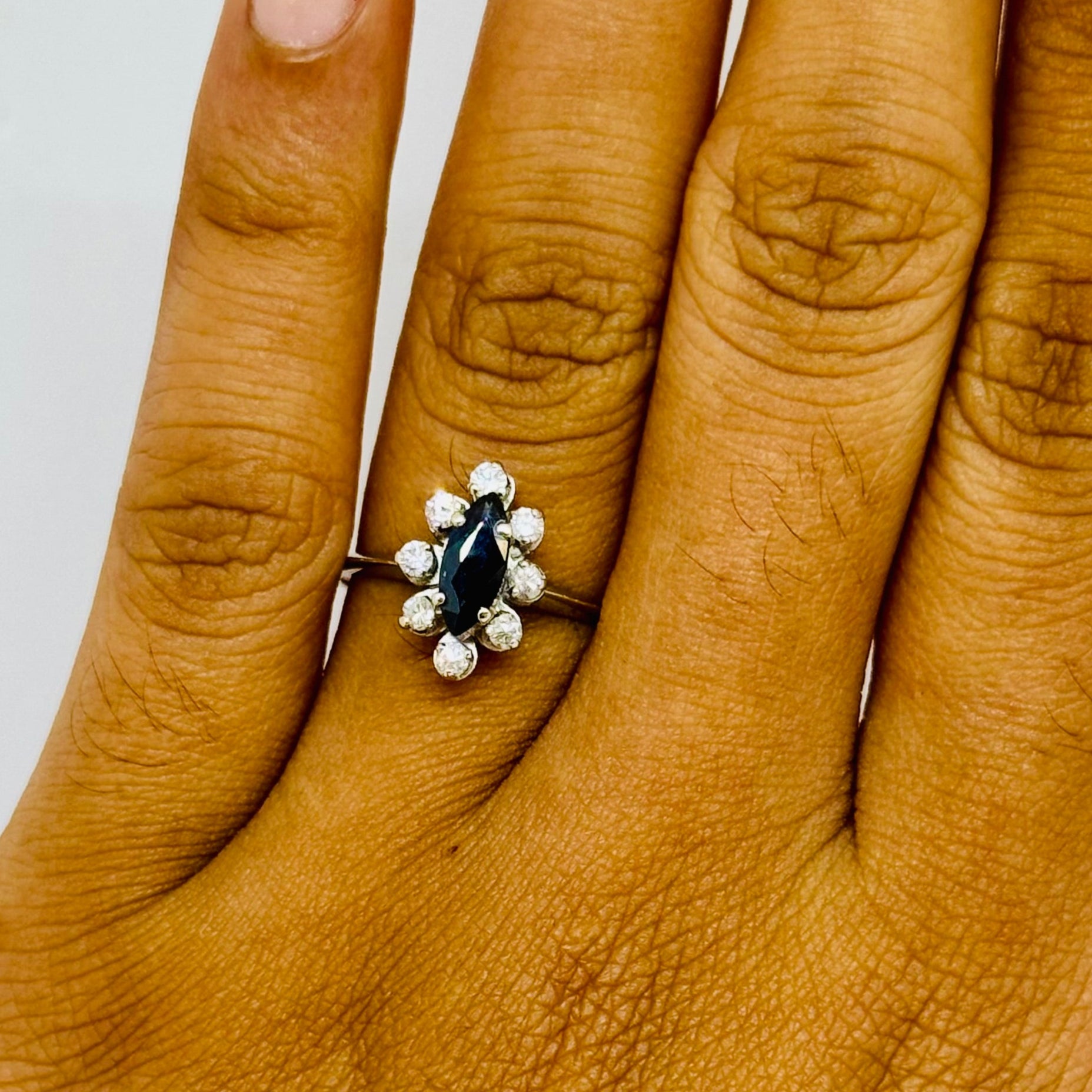 Bague marguerite en or blanc 18 carats (750/1000), poinçonnée Tête d’Aigle. Pesant 2,80 grammes et de taille 53, elle est magnifiquement sertie d’oxydes de zirconium qui évoquent la beauté d’une fleur en pleine éclosion. Son design délicat et son éclat intemporel en font une pièce idéale pour des occasions spéciales ou pour compléter un style quotidien raffiné. En bon état, cette bague est une ode à la sophistication et au charme classique.