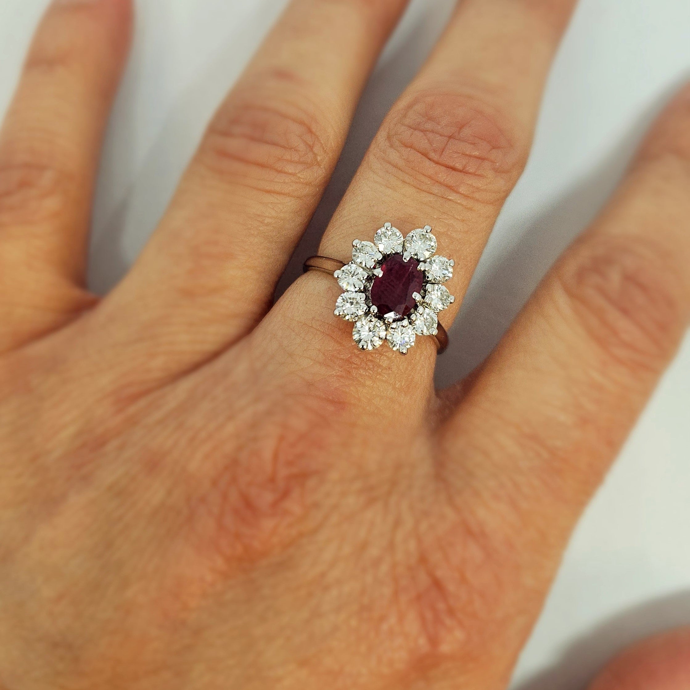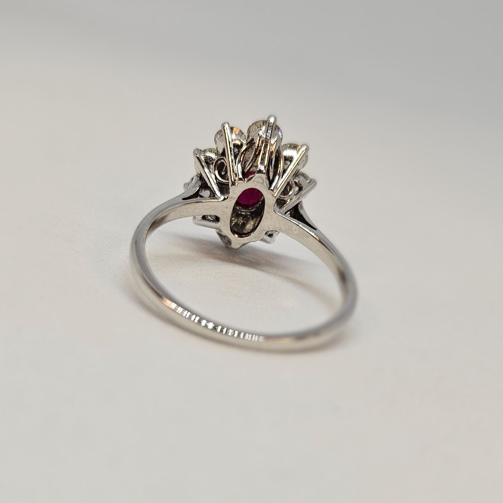 Très jolie bague marguerite en or blanc avec diamants et rubis
