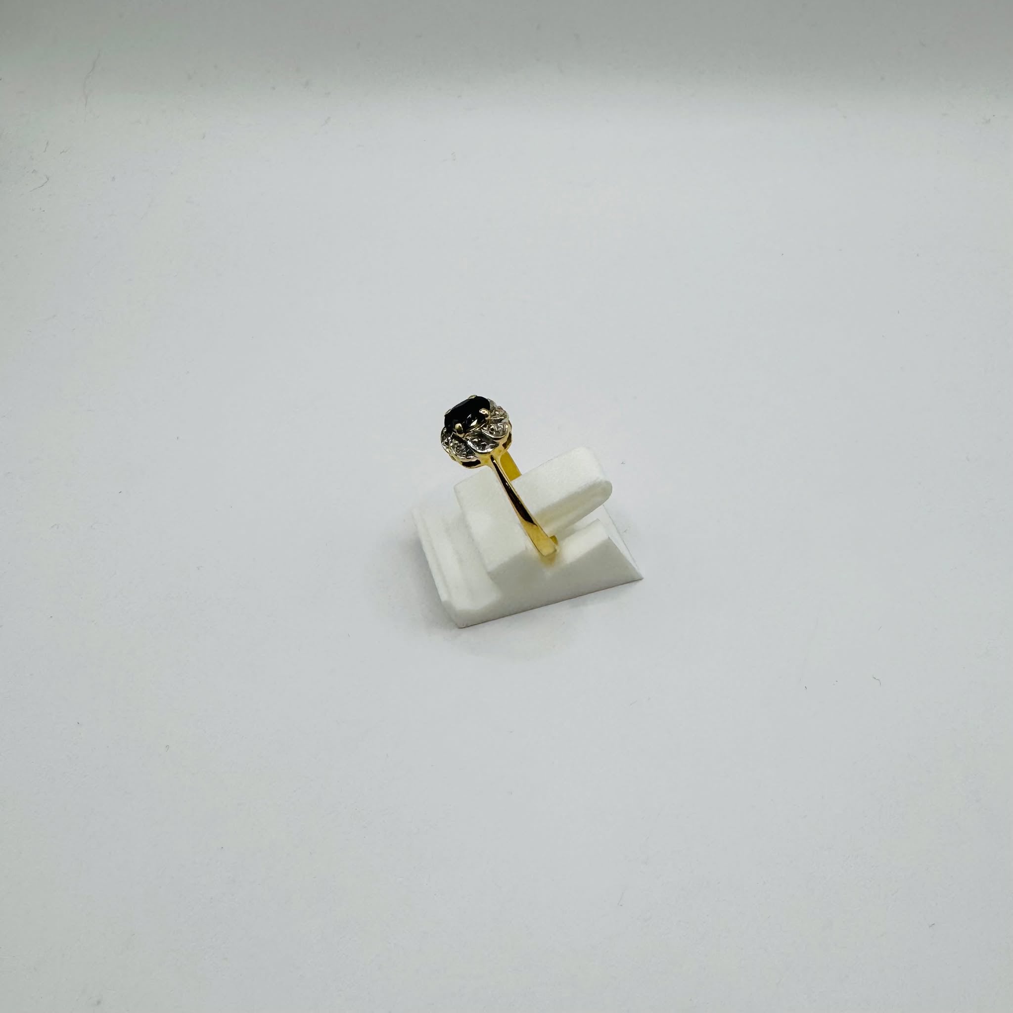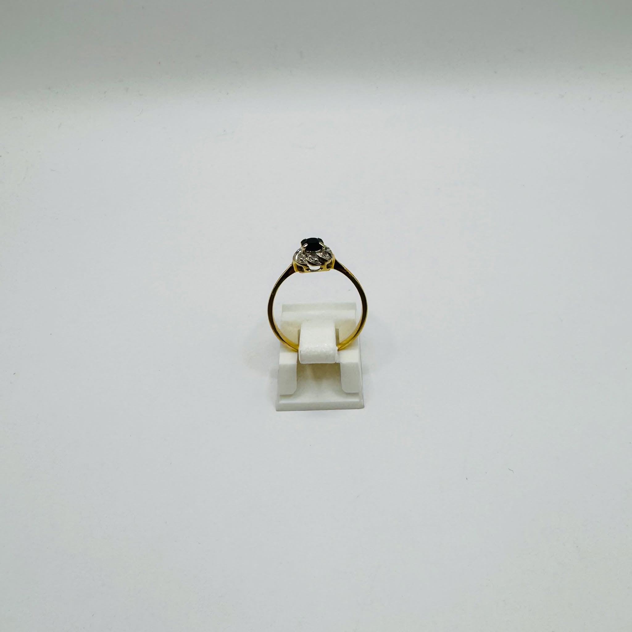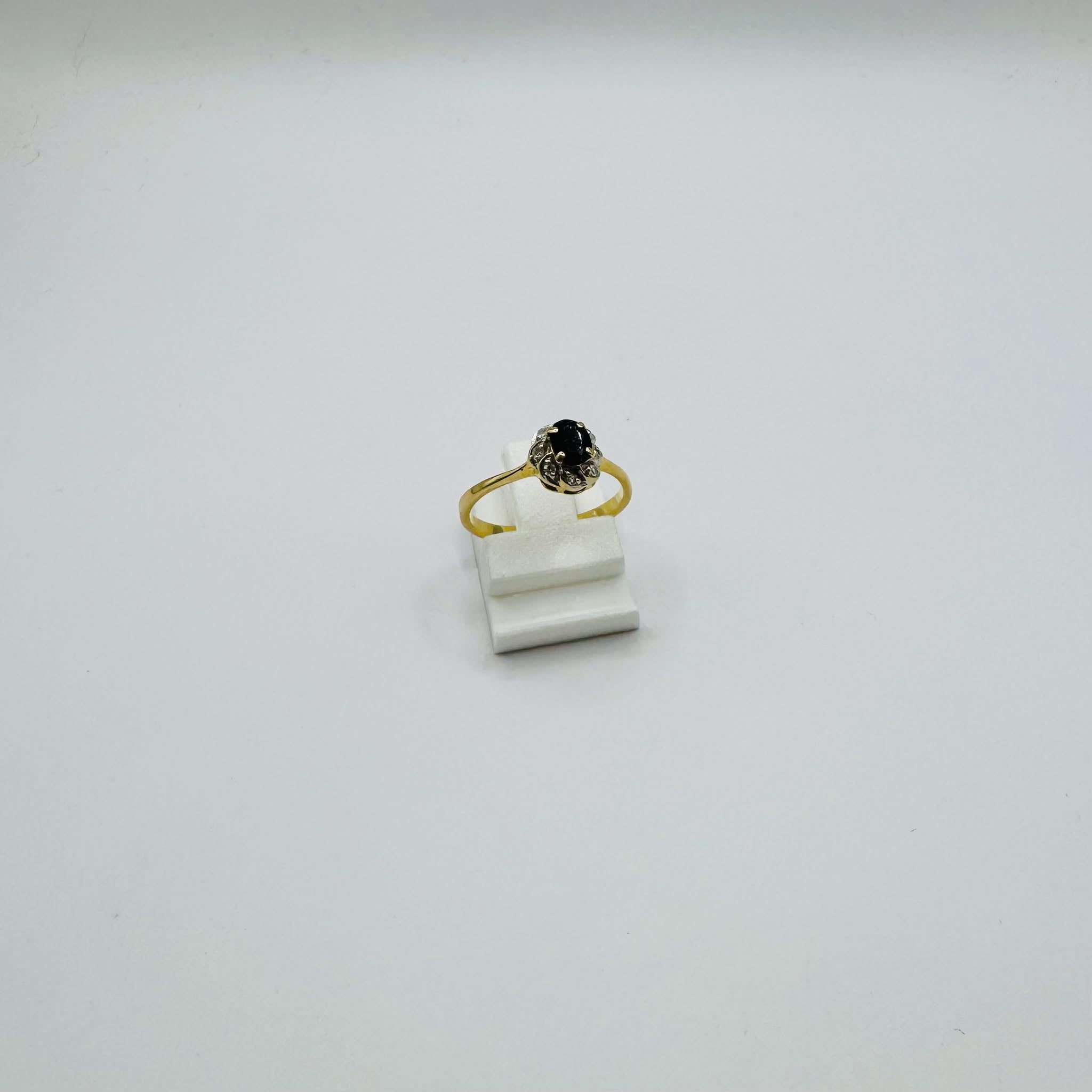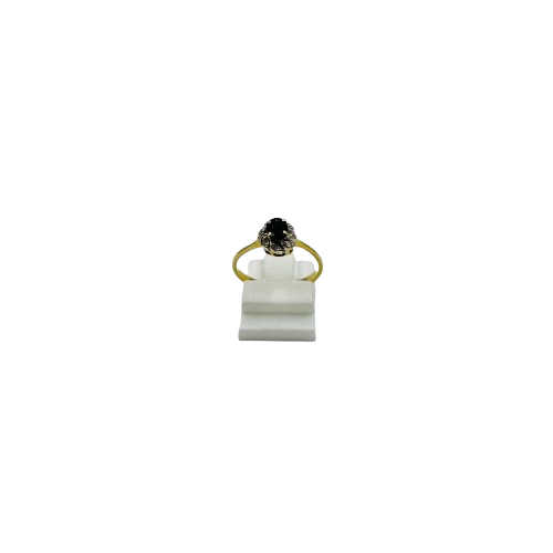 Bague en or jaune 18 carats au design raffiné, ornée d'une pierre noire centrale entourée de fins diamants. Une création élégante au charme intemporel.