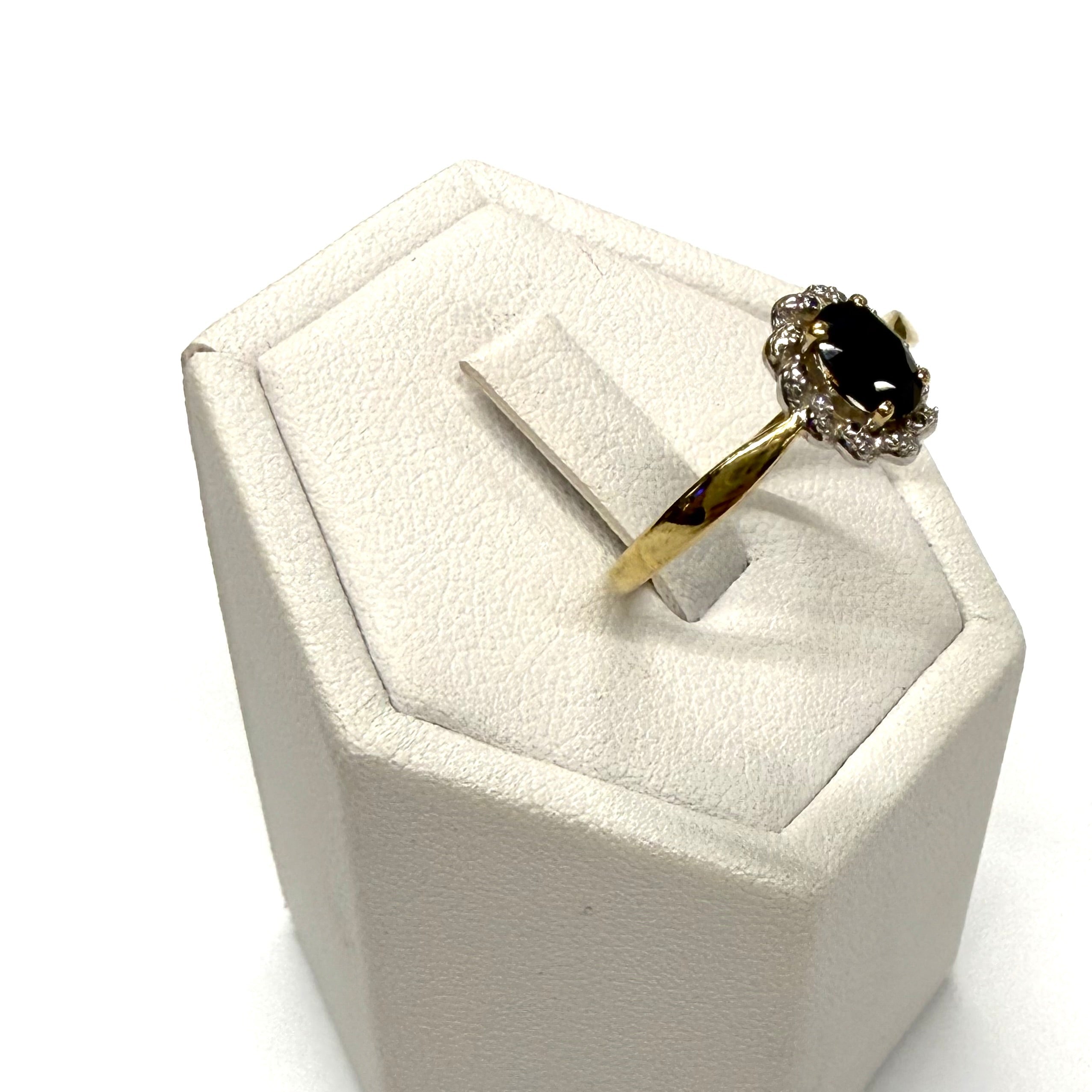 Bague de type Marguerite en or jaune et or blanc 18 carats (750/1000), non poinçonnée, d’un poids de 1,69 g. Taille 55, elle est ornée d’un saphir mesurant 0,5 cm sur 0,4 cm. Très bon état.