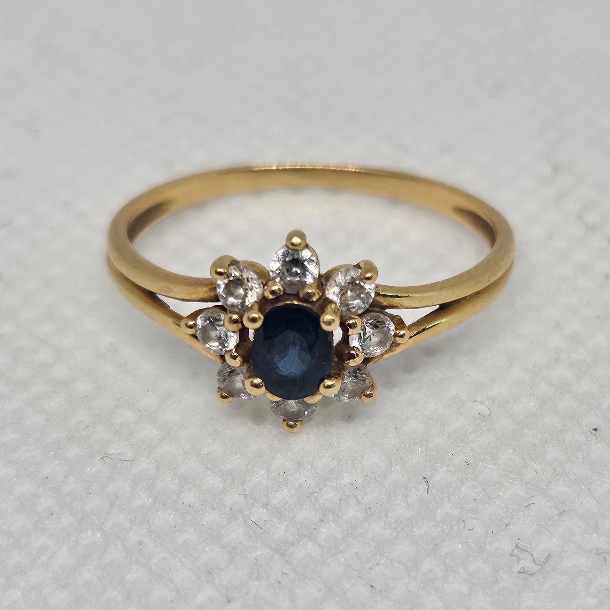 Bague jonc, chevalière marguerite en or jaune 18 carats, poinçon tête d’aigle. Taille 49, poids 1,51 g, sertie d’un saphir et de zirconiums, en très bon état.