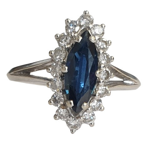 Très belle bague Marquise en Or Blanc avec Diamants et Saphir