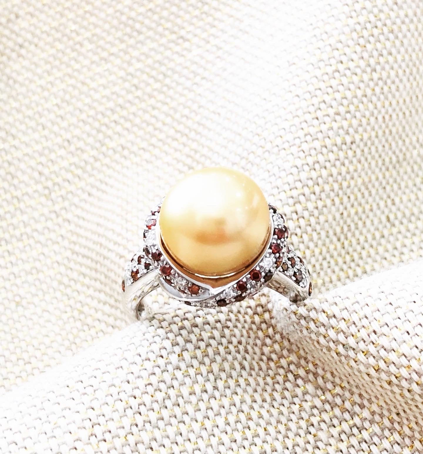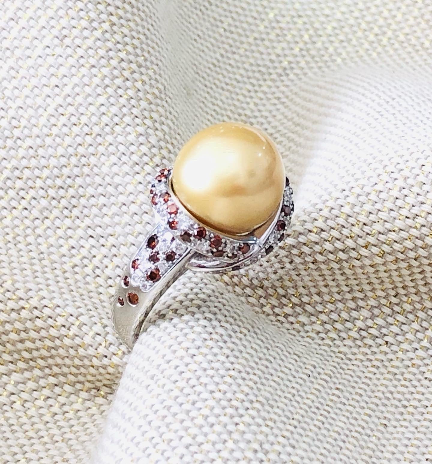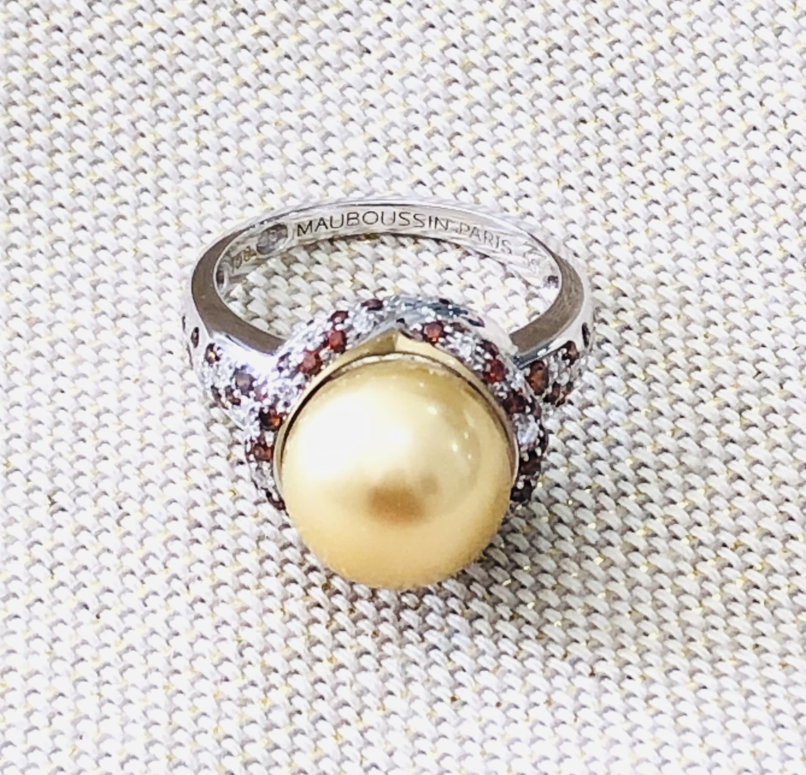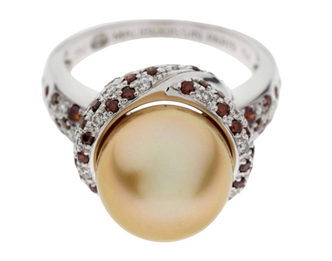 En or gris 18k (750) ornée d'une perle de culture gold dans un entrelac et un épaulement de diamants taillés en brillant, blancs ou cognacs