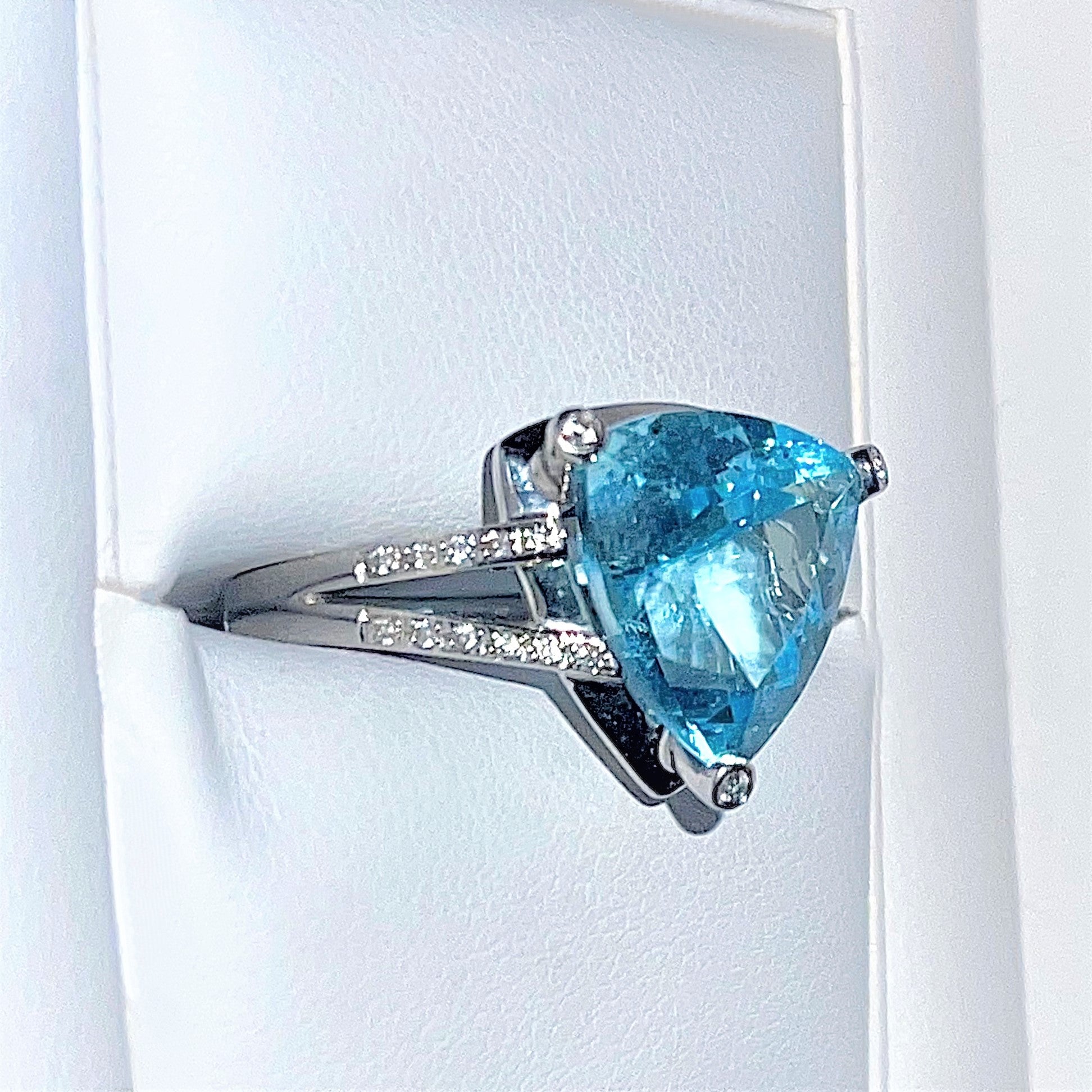 Pierres : Topaze bleue 7,70 carats, 8 diamants (0.006 carats env) en pavage de chaque côté, trois diamants (0.006 carats env) sur les griffes pour tenir la pierre le pavage de diamant contiennent 19 diamants (0.11 carats env)
