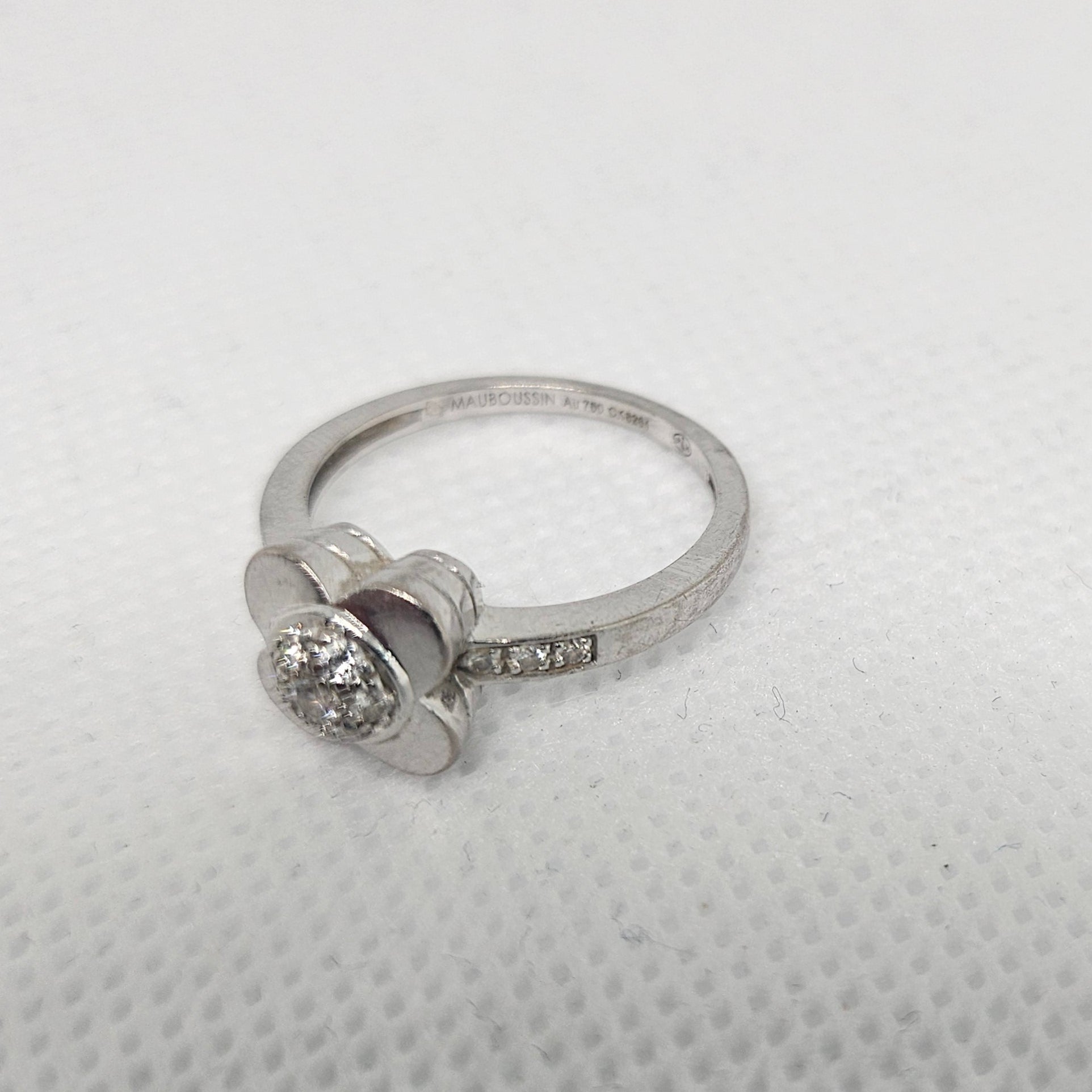 Bague solitaire empierrée en or gris 18 carats, poinçon tête d’aigle. Taille 52, poids 3,46 g, sertie de 6 diamants, en bon état.