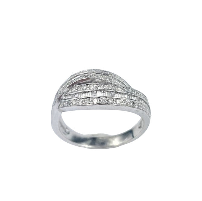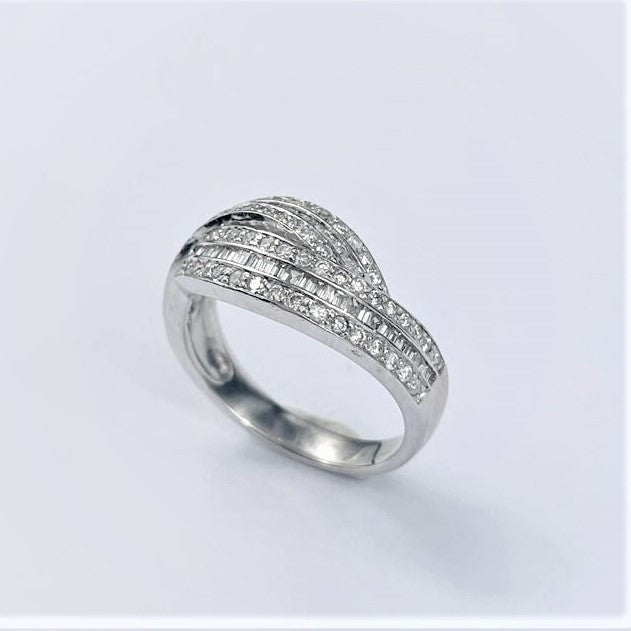 Magnifique bague croisée en or blanc 18 carats sertie de diamants tailles baguettes brillants
