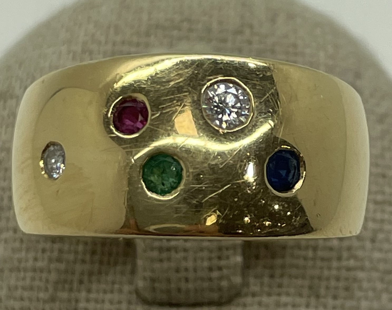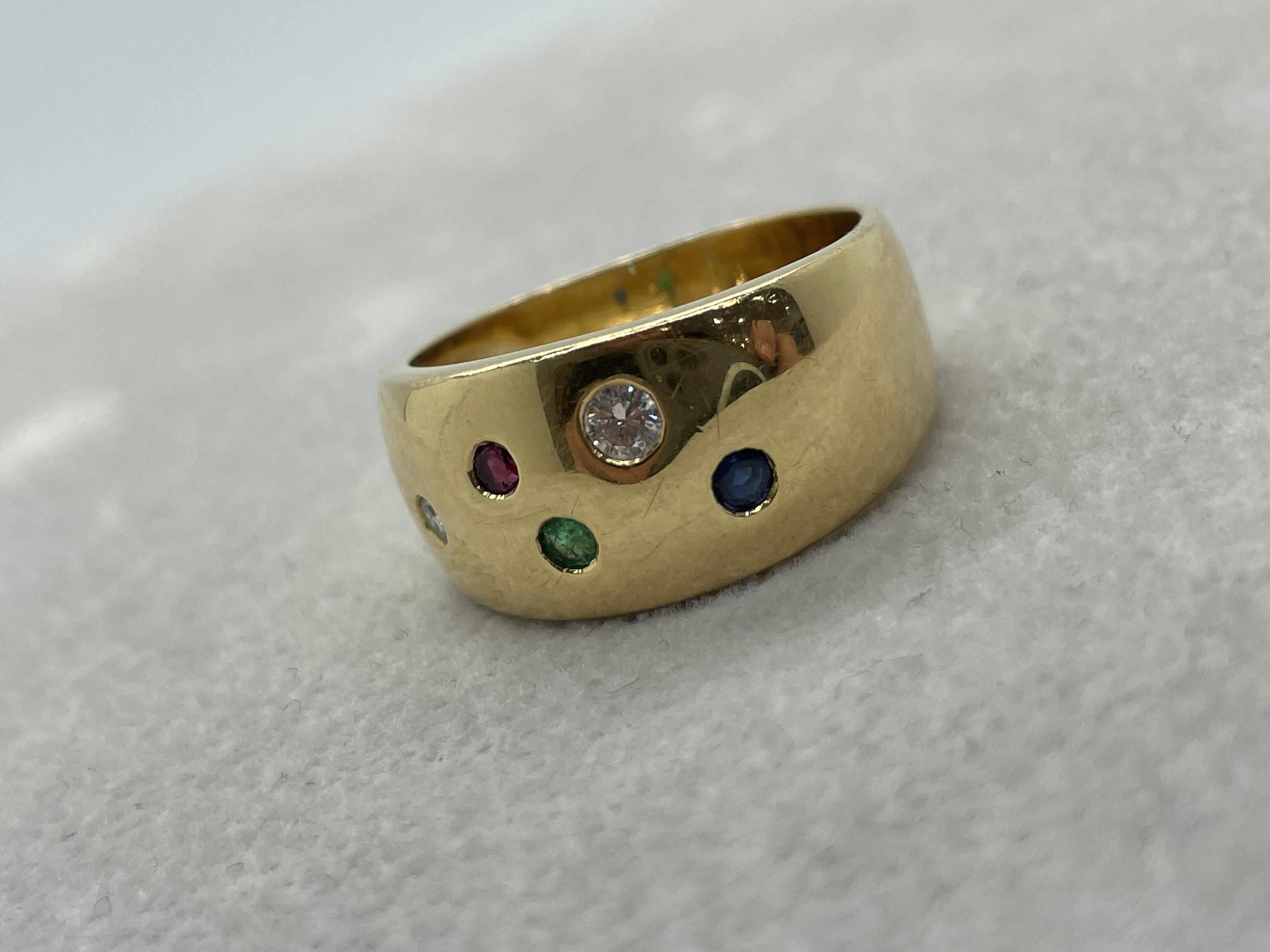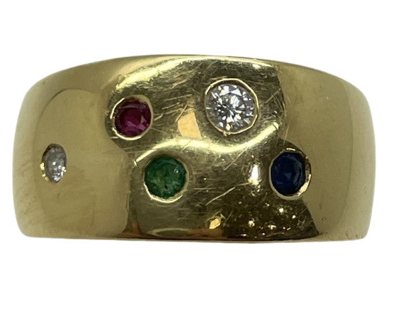 Émerveillez-vous devant cette bague exquise, ornée de délicats éclats de diamant, saphir, rubis et émeraude. Chaque pierre précieuse, minutieusement sélectionnée et sertie, crée une symphonie de couleurs et d'éclats qui captivent le regard. Les diamants étincelants ajoutent une touche de pureté et de lumière, tandis que les saphirs bleus, les rubis rouges et les émeraudes vertes apportent une richesse et une profondeur incomparables. Ce bijou raffiné incarne l'élégance et la diversité de la beauté naturelle, faisant de lui une pièce exceptionnelle pour sublimer toute tenue avec une sophistication intemporelle.