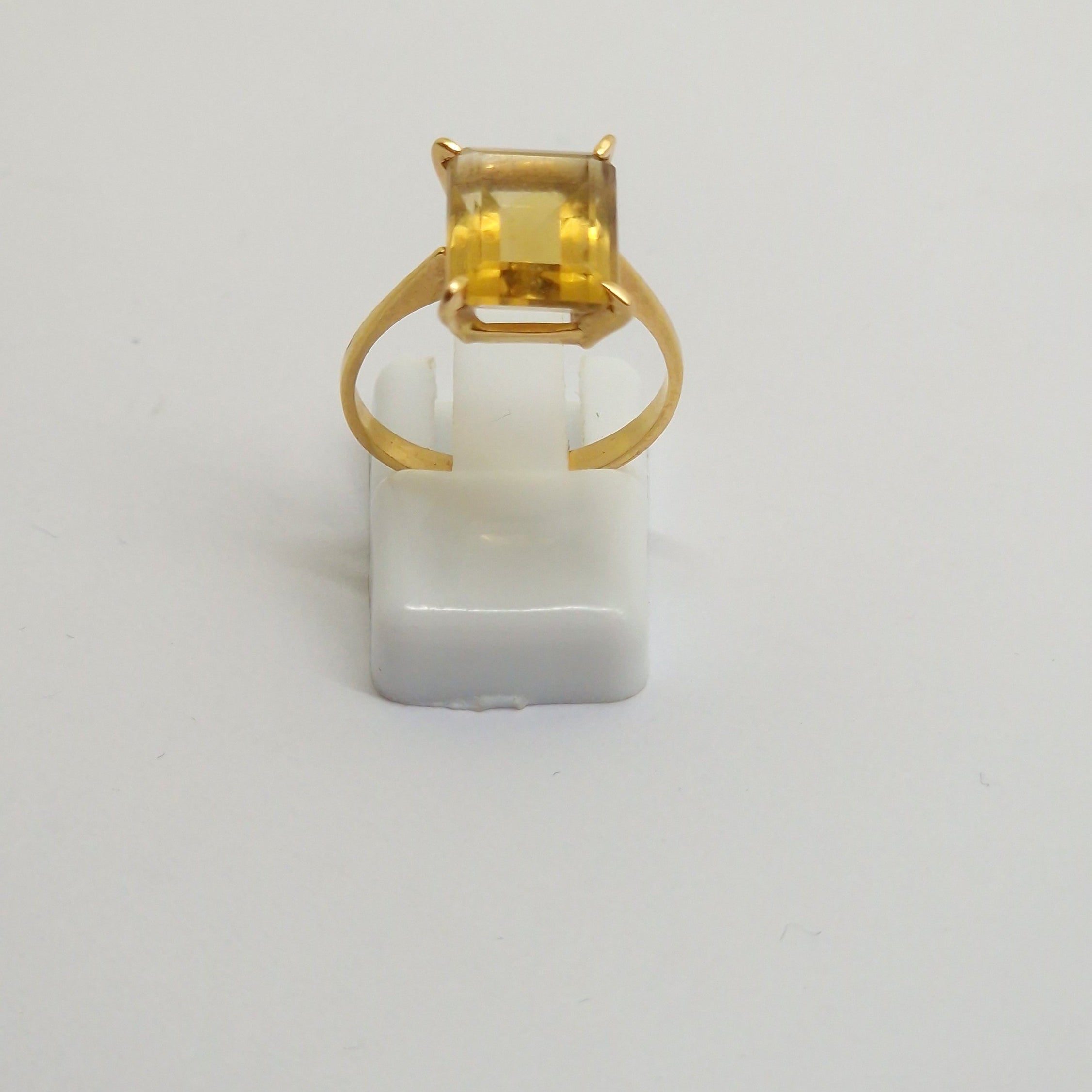 Bague empierrée en or jaune 18 carats (750/1000), poinçonnée bijoutier. Elle est sertie d’une citrine et pèse 2,63 grammes. Taille 52. Très bon état.