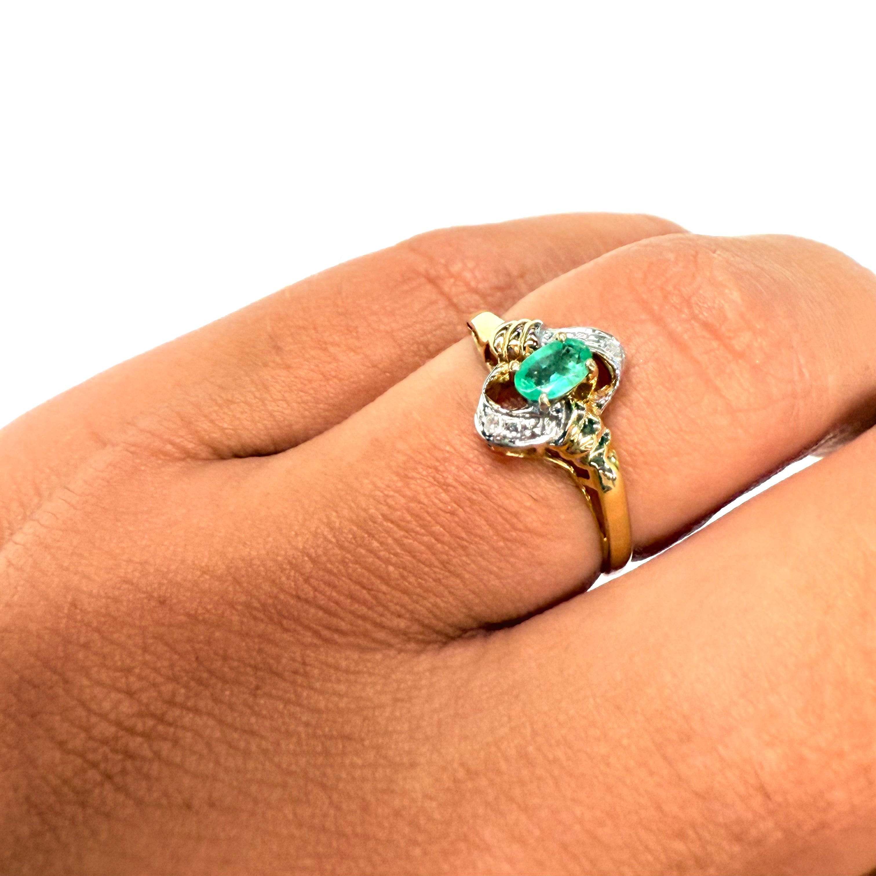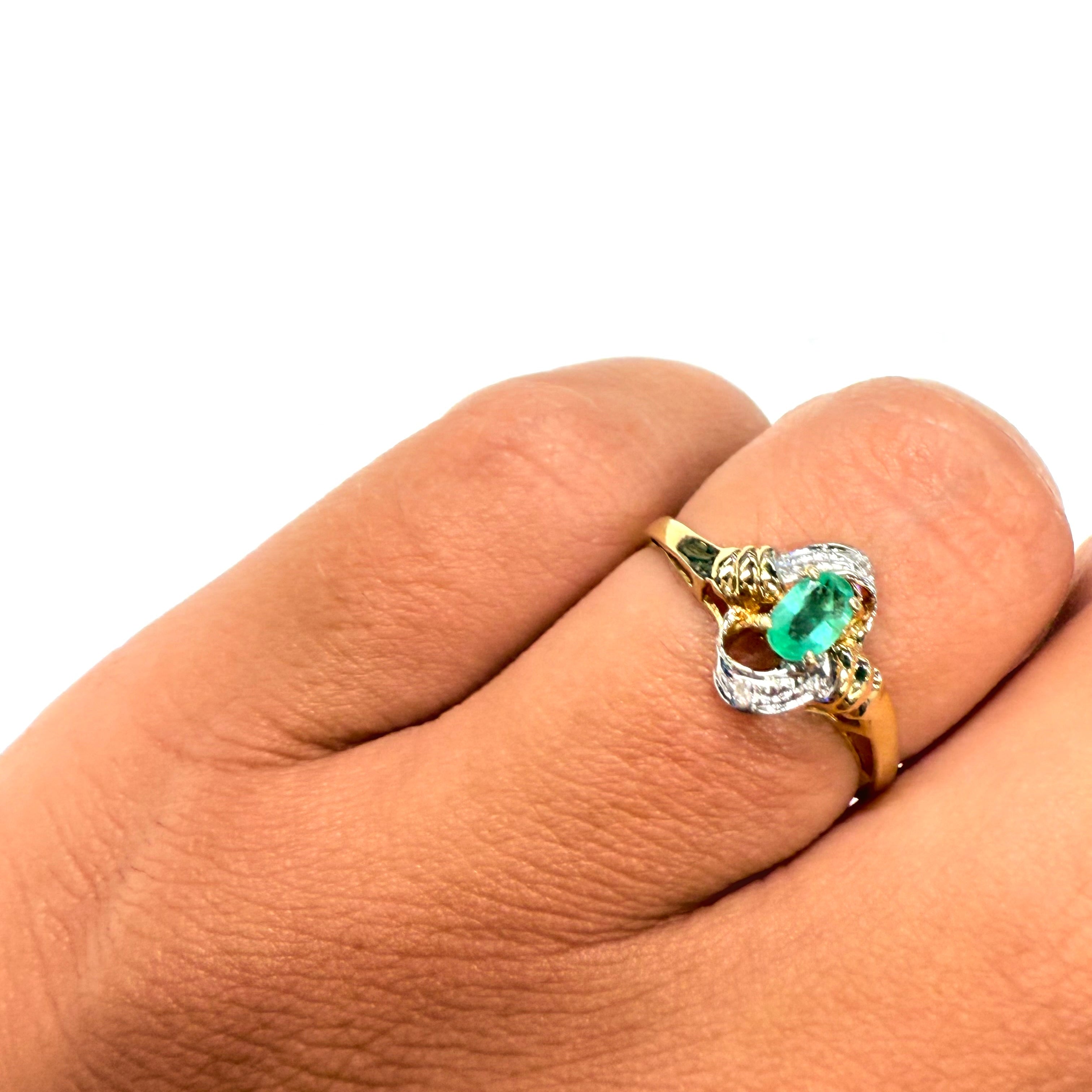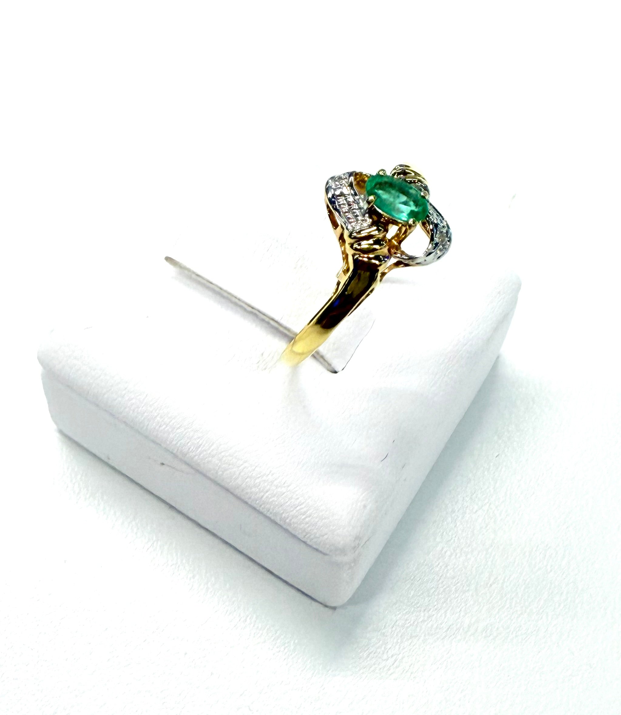 Bague empierrée en or jaune et or blanc 18 carats (750/1000), poinçonnée tête d’aigle. Sertie d’une pierre verte centrale et de deux éclats de diamant, cette bague taille 52 affiche un poids remarquable de 130 g. En très bon état
