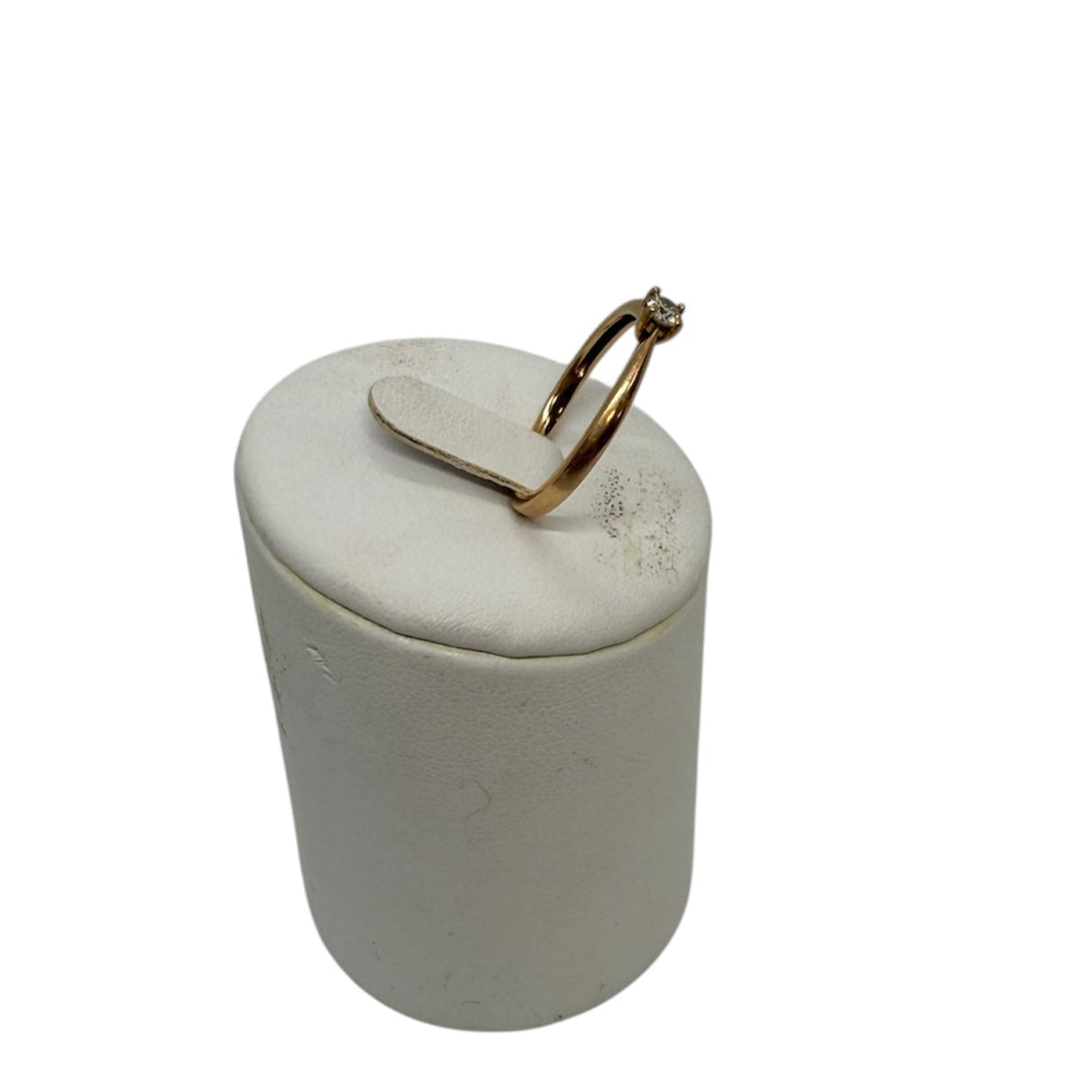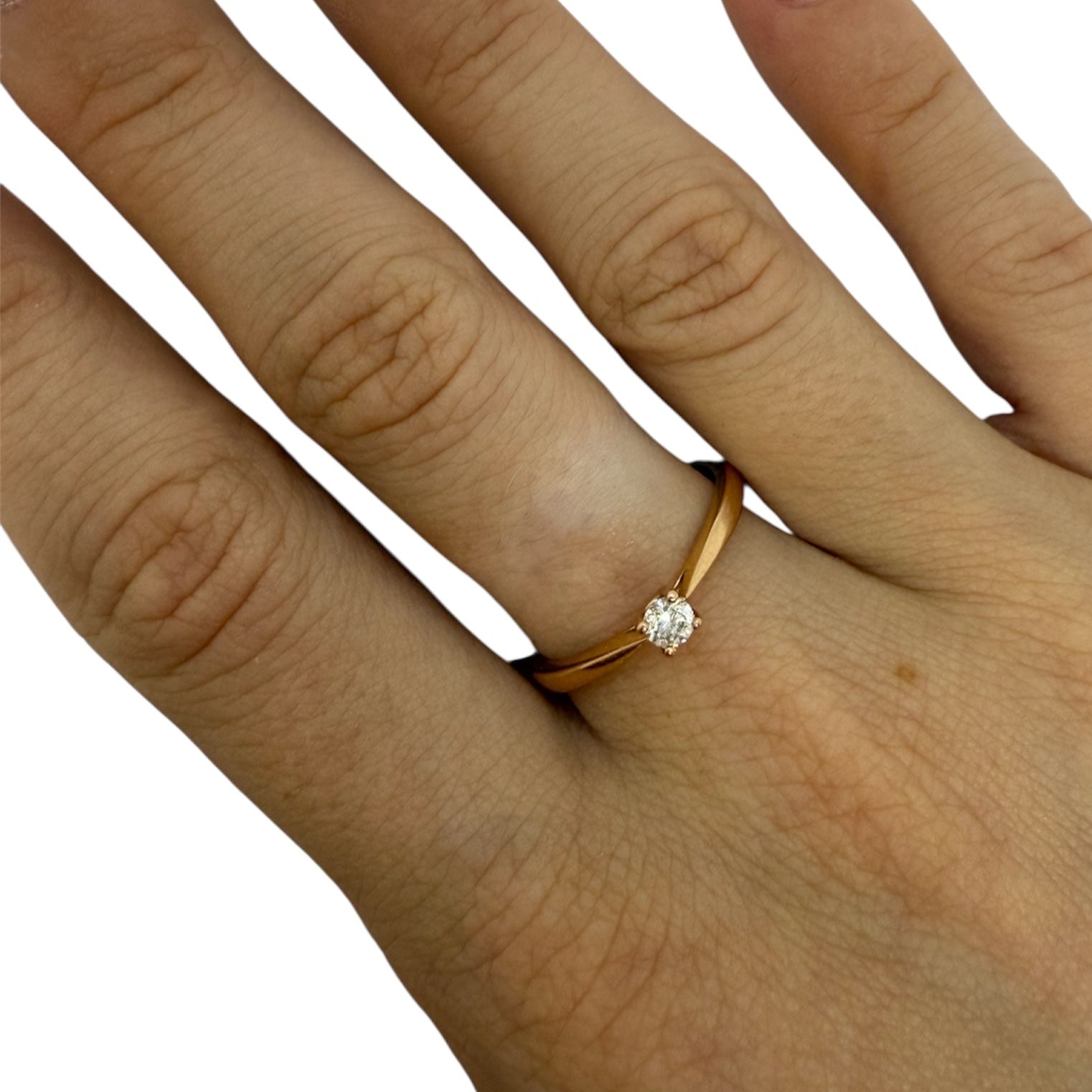 Alliance solitaire en or rose 18 carats (750/1000), sans poinçon. Elle pèse 2,34 g et est proposée en taille 56. Le bijou est orné d’un diamant solitaire de 0,15 carat. Très bon état