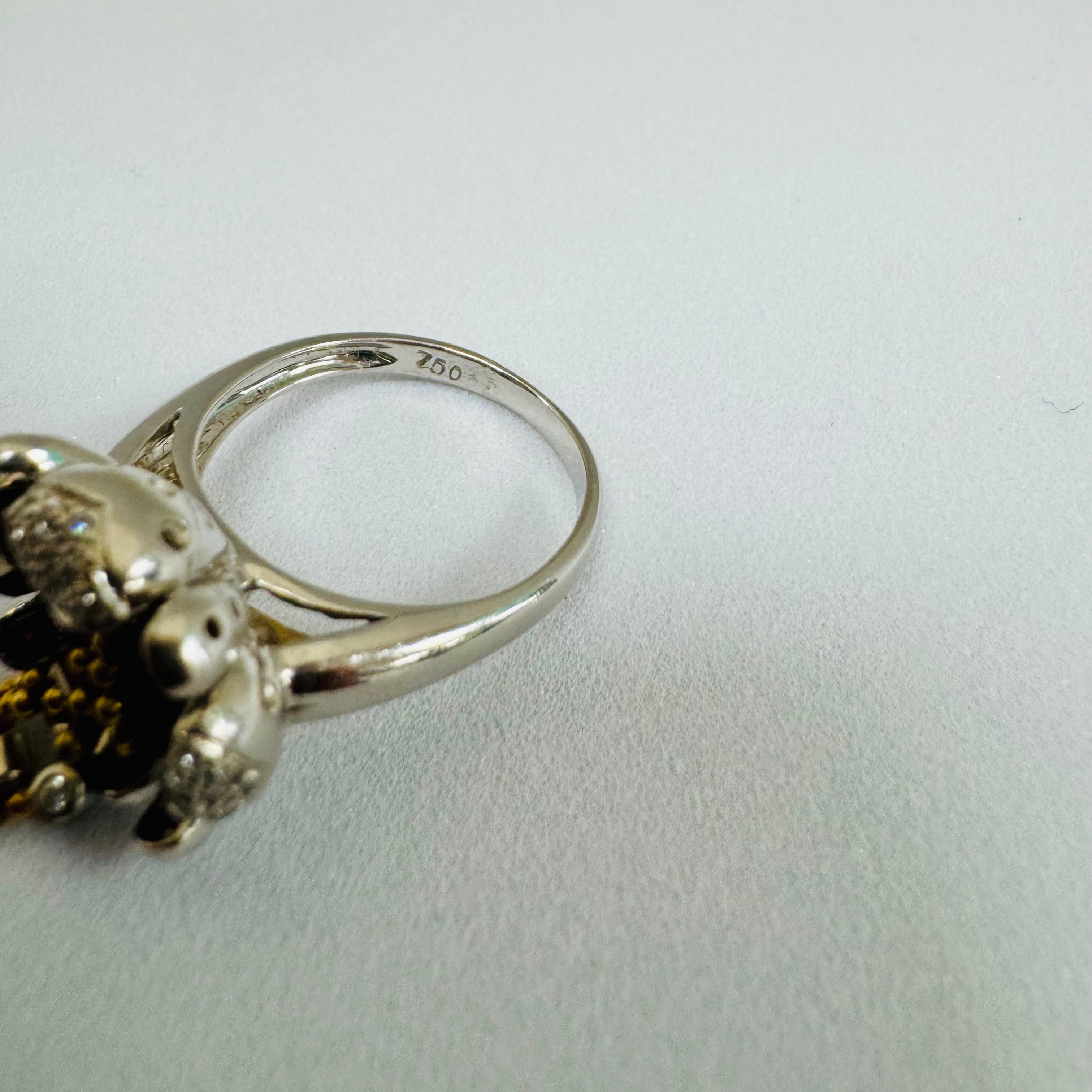 Bague en or blanc 18 carats (750/1000), poinçonnée 750, d’un poids de 8 grammes et proposée en taille 54. Le type de modèle ainsi que la nature des pierres ne sont pas connus, mais l’ensemble présente une belle finition et est en très bon état.