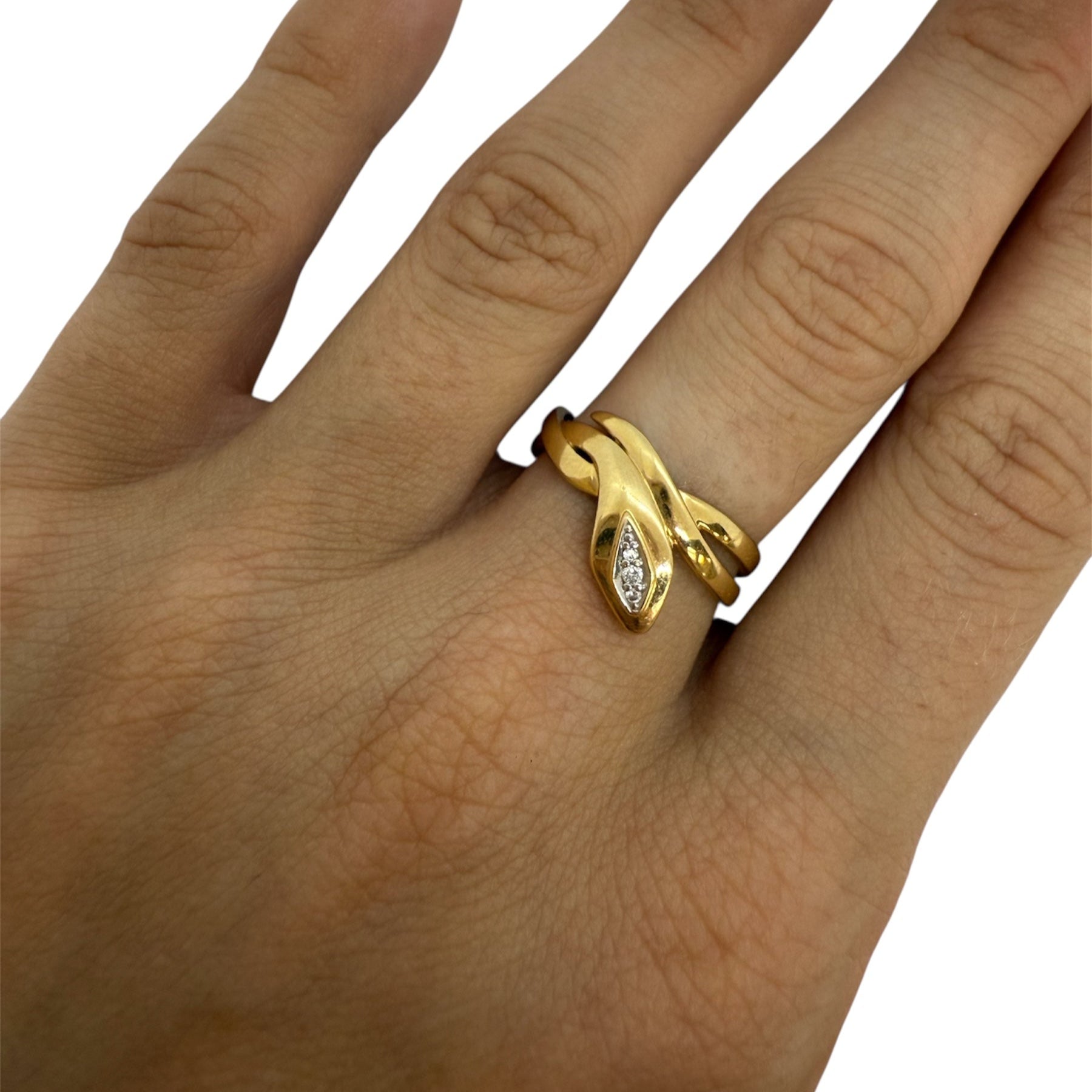 Bague empierrée en or jaune 18 carats (750/1000), sans poinçon, d’un poids de 2,98 grammes et en taille 53. Elle est ornée d’un diamant de 0,02 carat accompagné de deux moissanites de 0,01 carat chacune, apportant une touche de brillance discrète. Le bijou est en très bon état.
