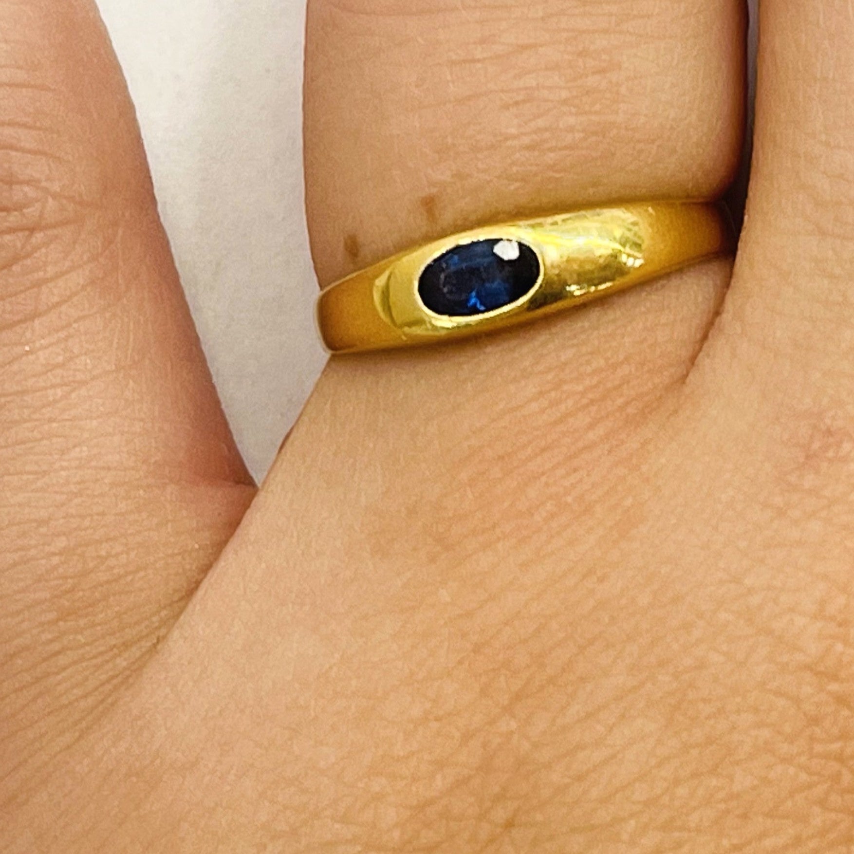 Bague empierrée en or jaune 18 carats (750/1000), sans poinçon. Elle est sertie d’un saphir bleu naturel de 0,02 carat et pèse 1,48 gramme. Taille 52. Très bon état.
