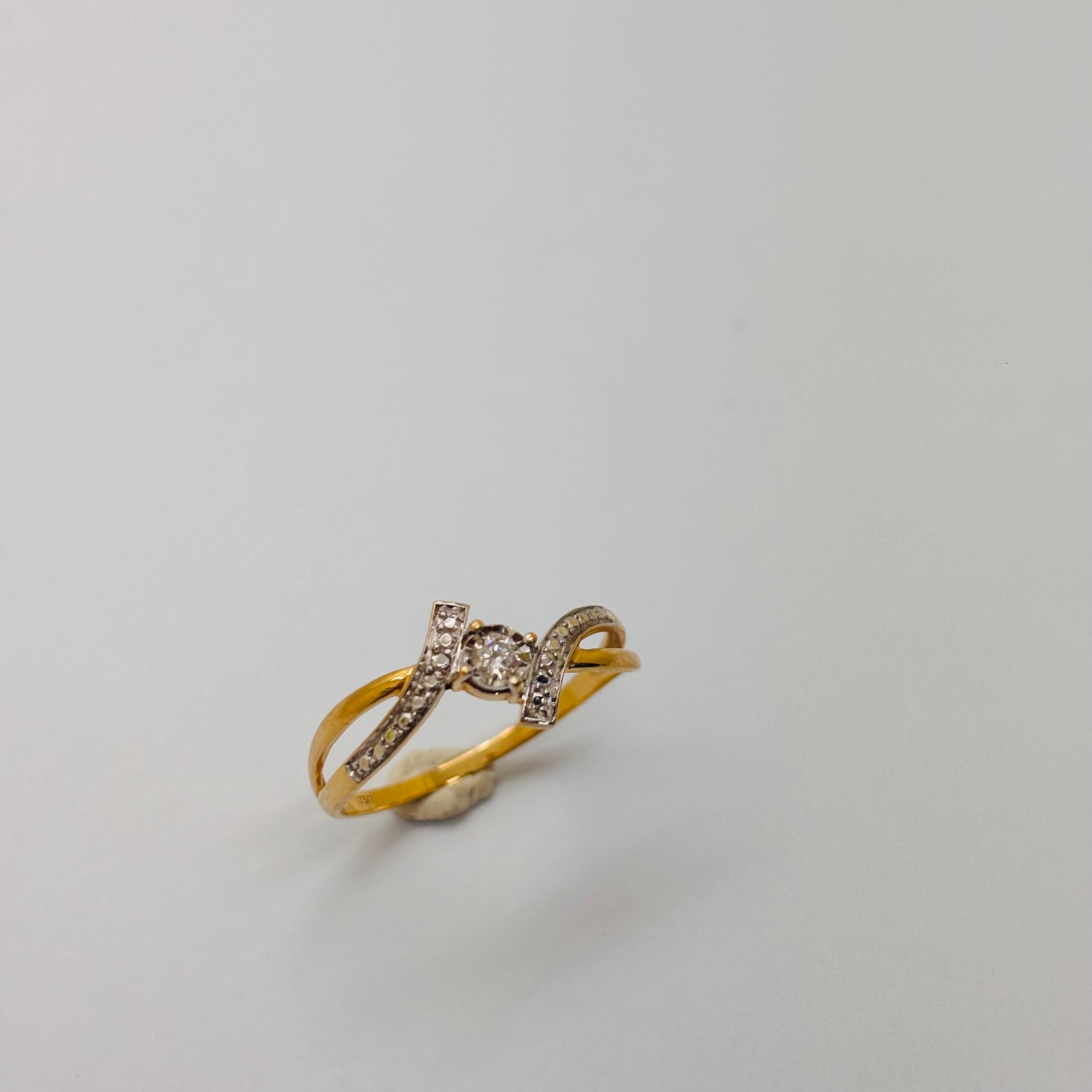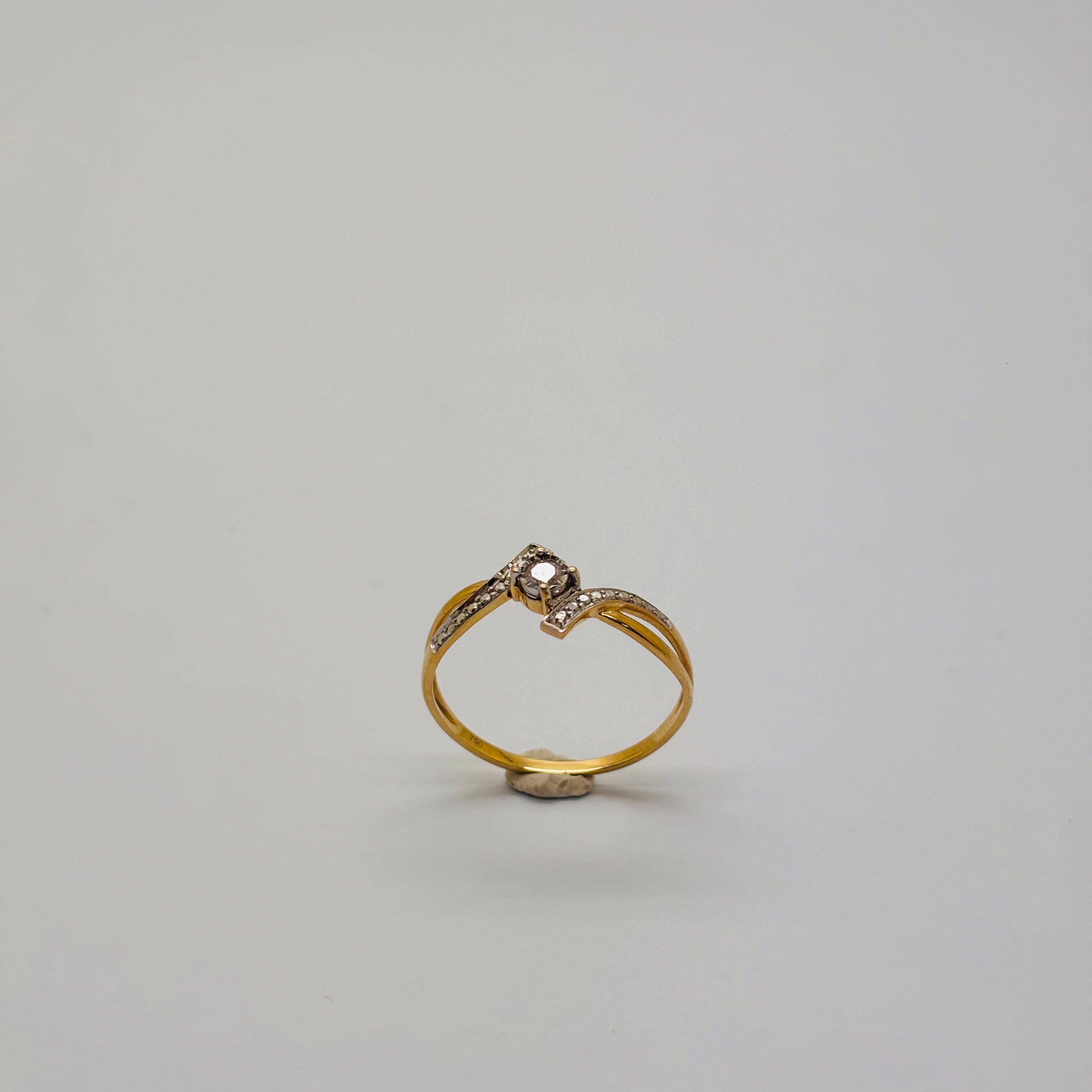 Bague empierrée associe or jaune et or blanc, titrée à 18 carats (750). D’un poids de 1,50 gramme et d’une taille 55,5, elle est ornée d’un diamant unique. Son état général est bon.
